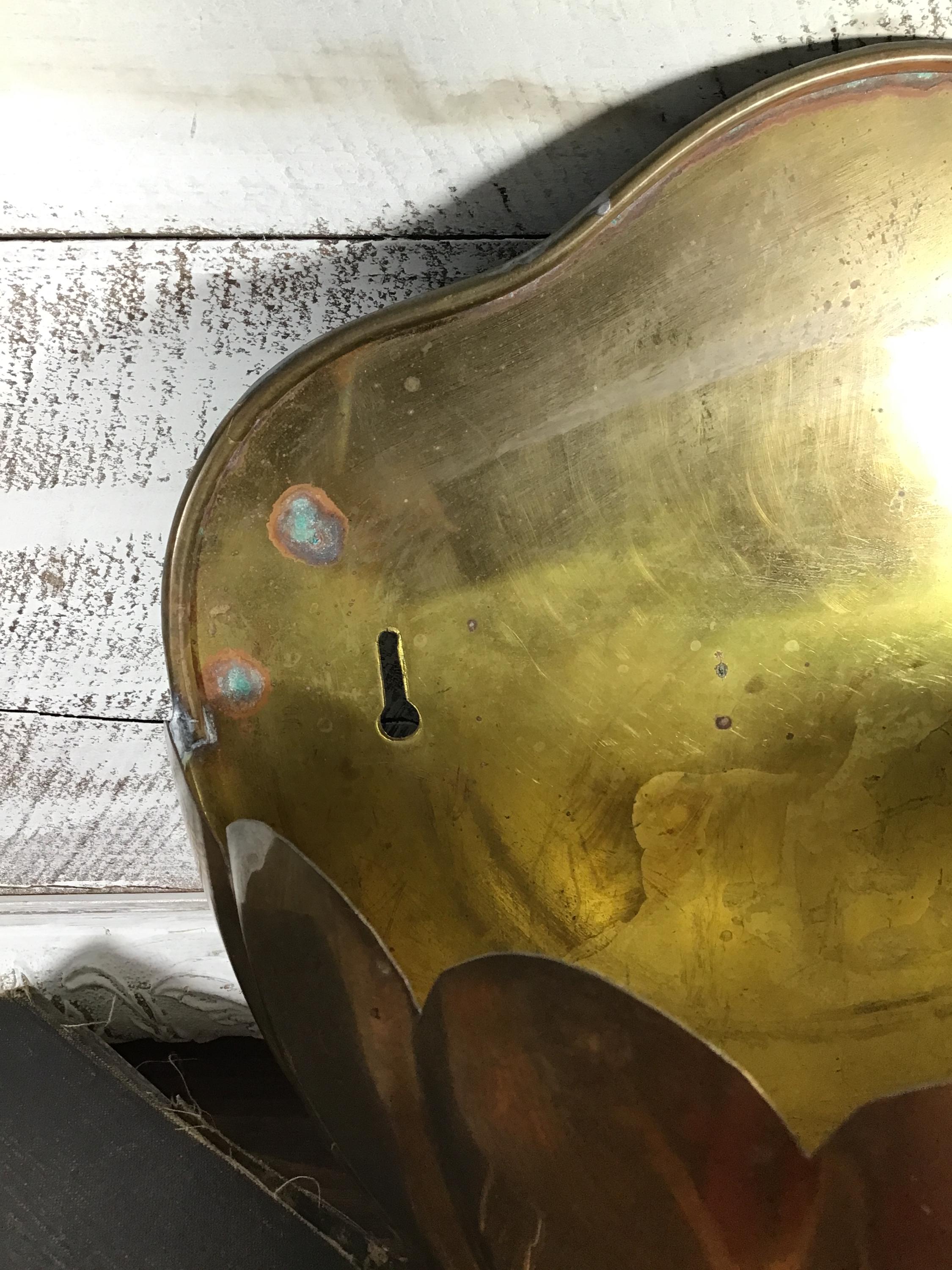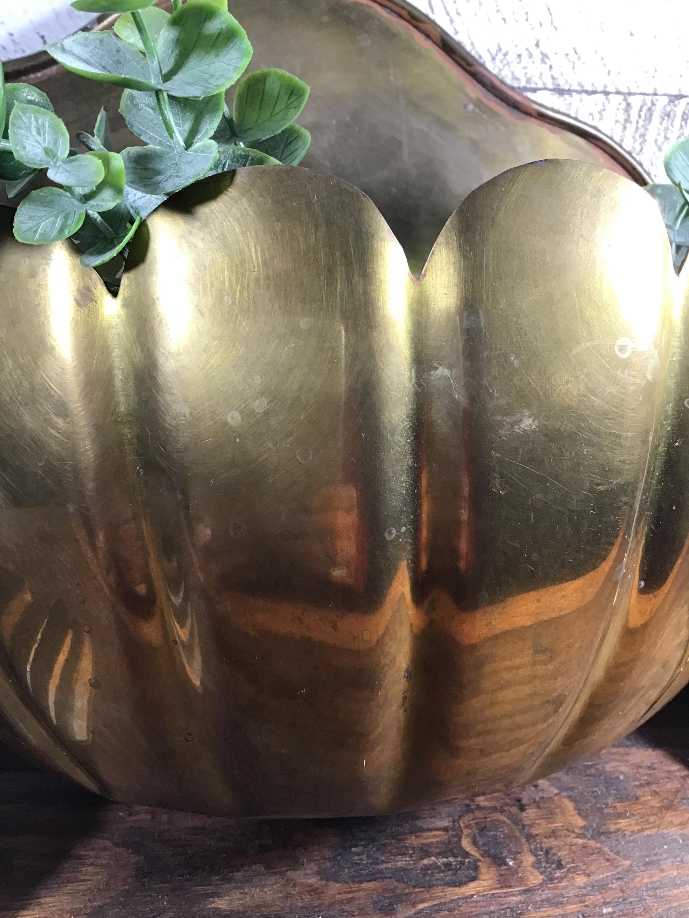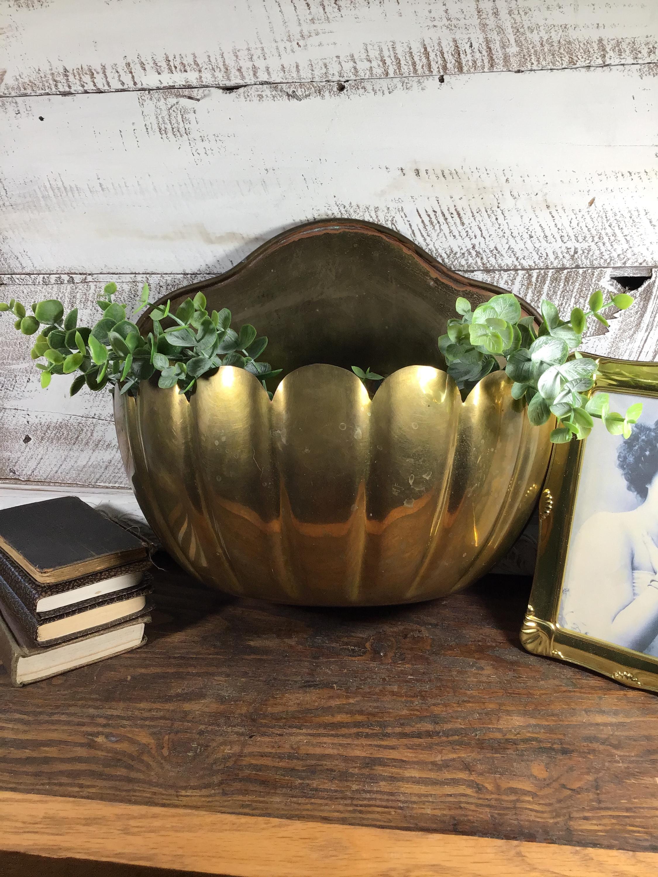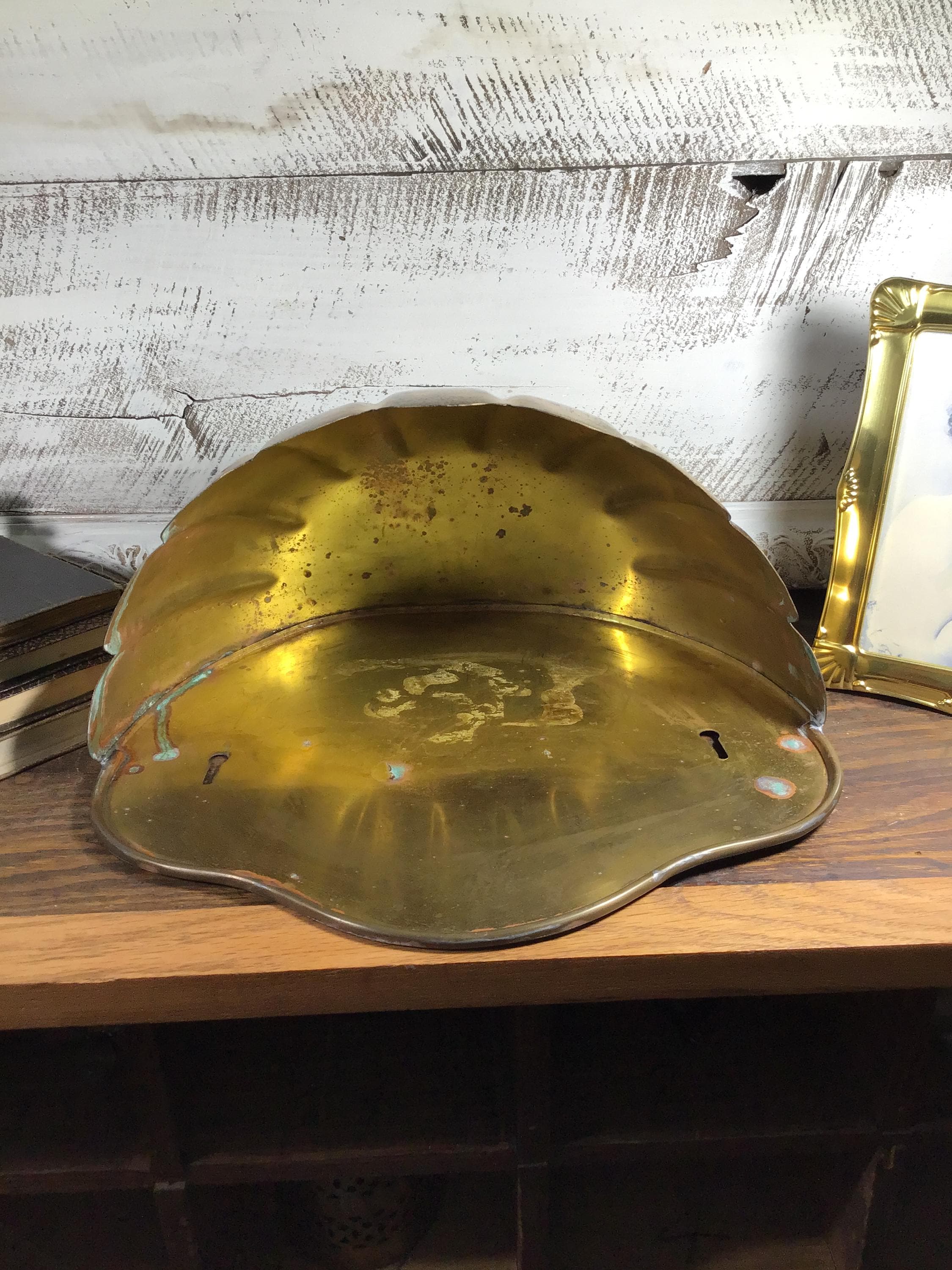 Vintage brass Clam shell wall pocket planter with scalloped shaped rim. Generous size with lovely green verdigris patina on the brass in spots. This is a fantastic piece to add to a wall gallery or use in a kitchen or bathroom.
