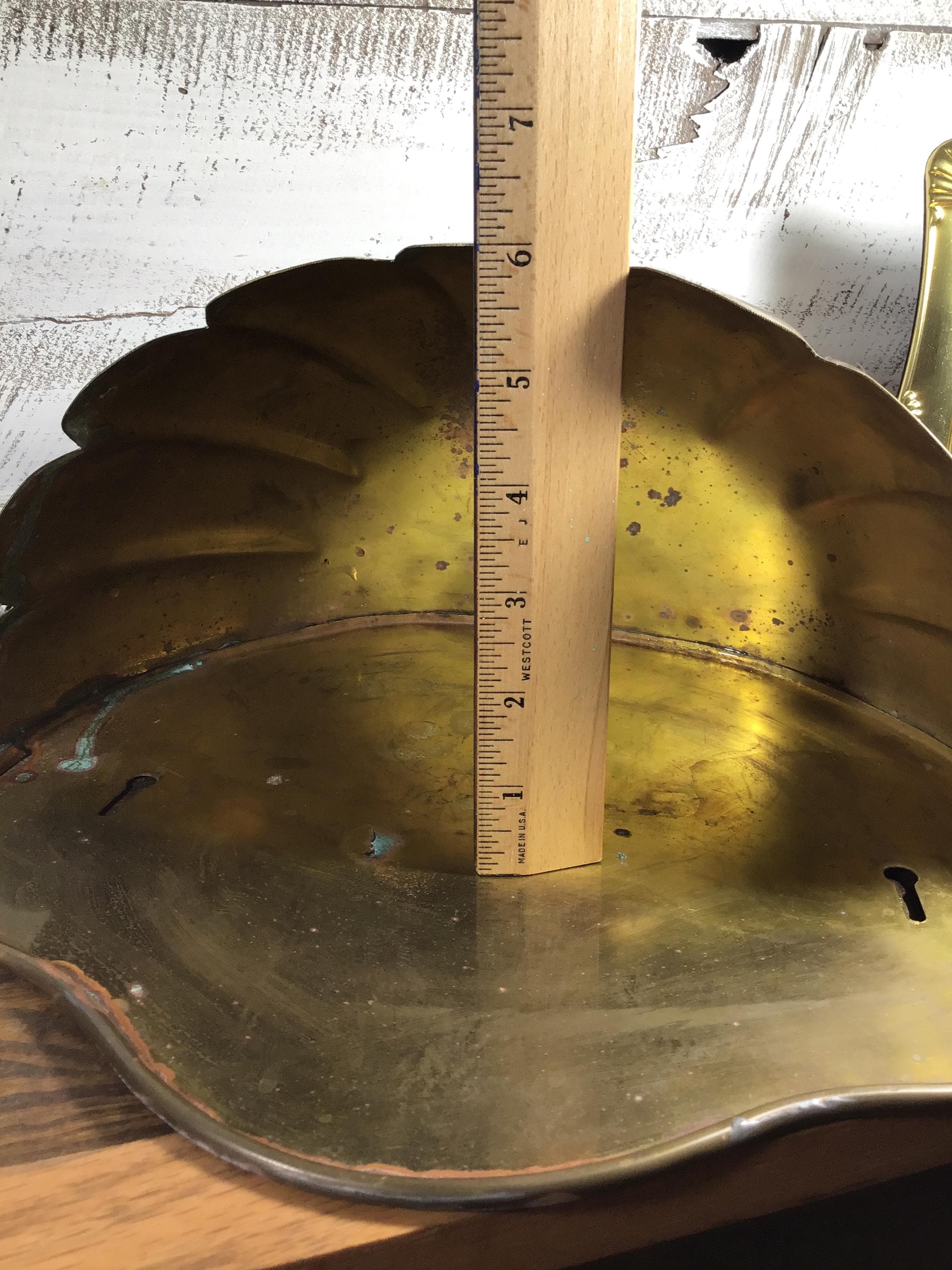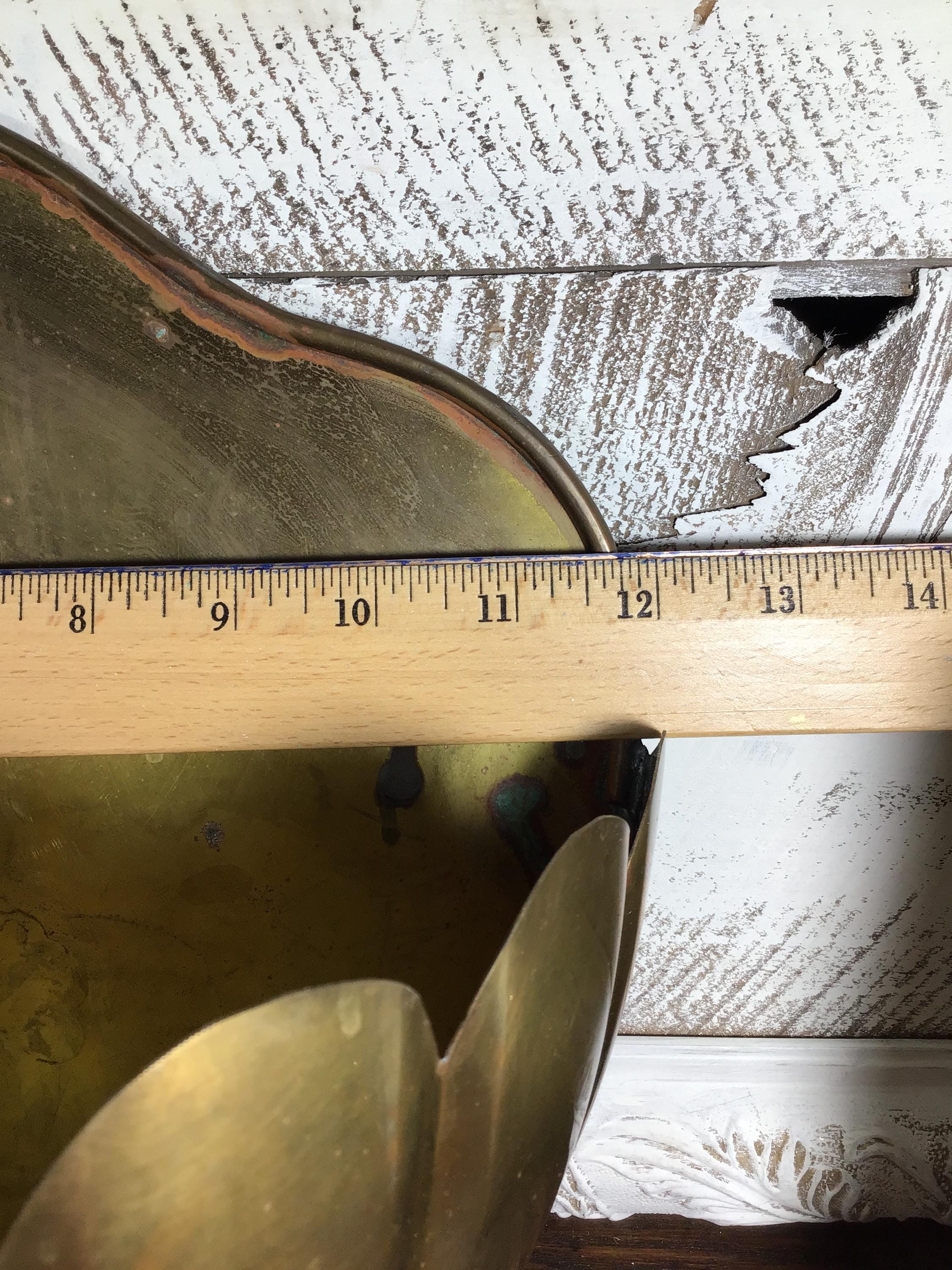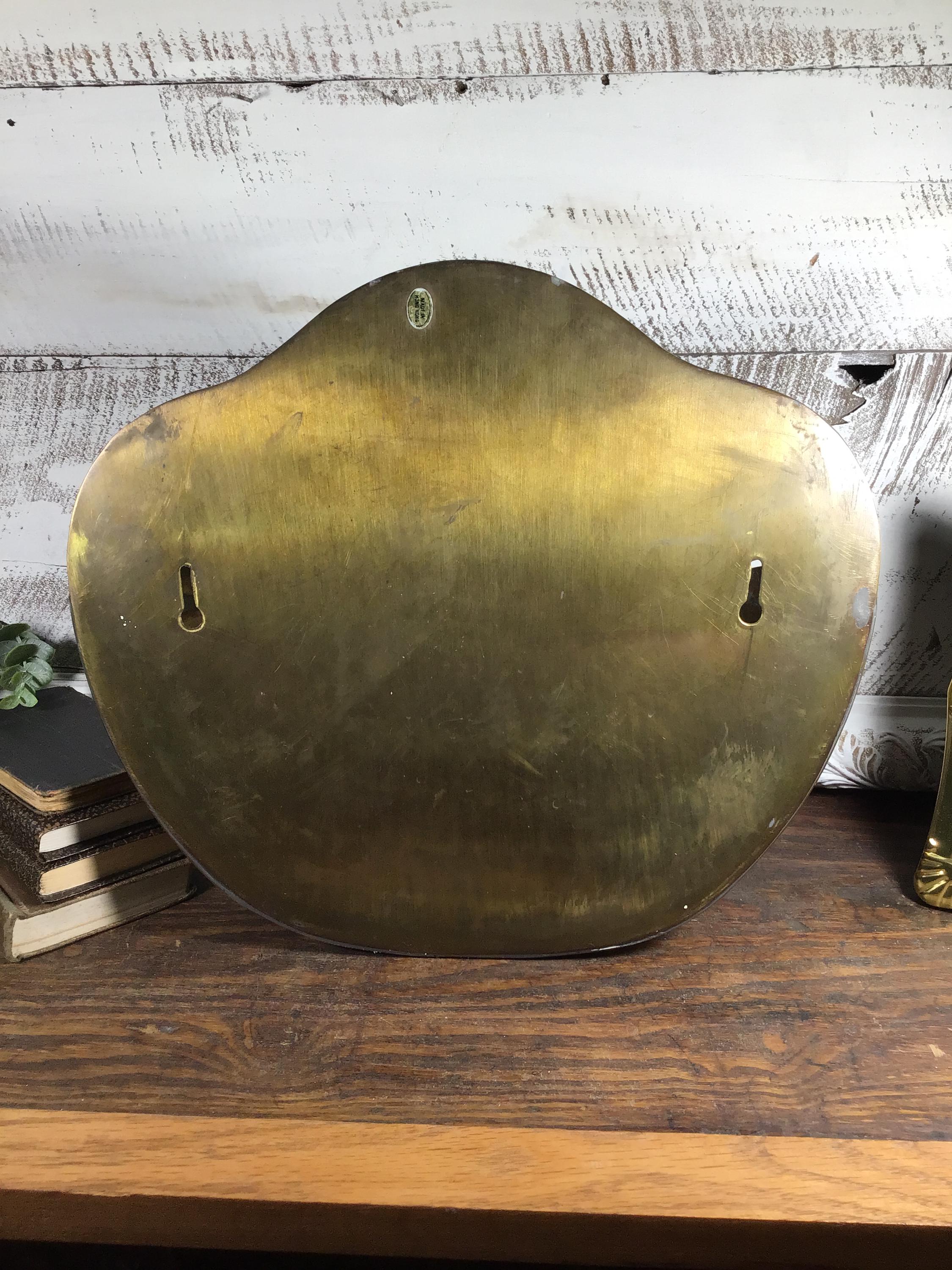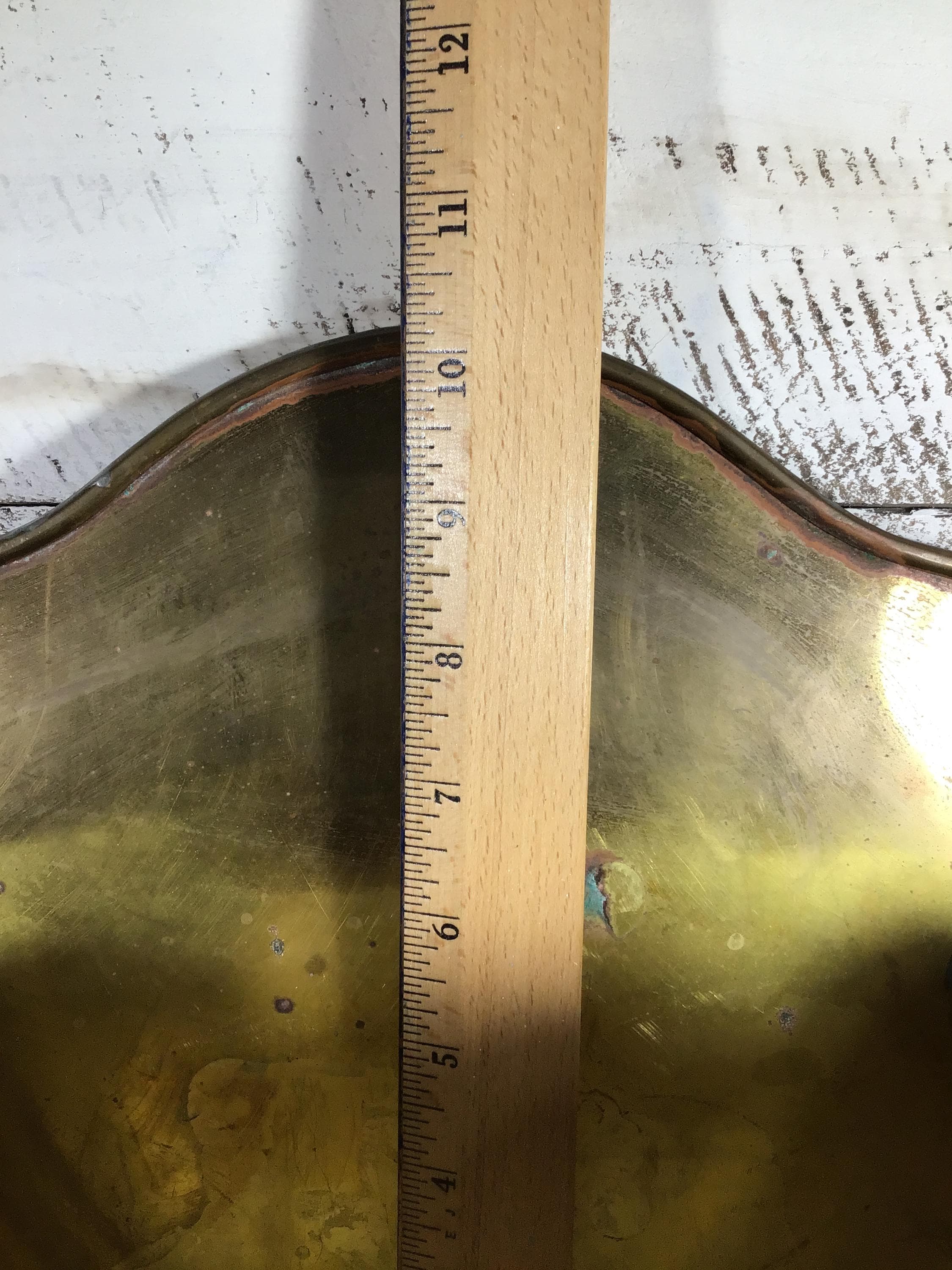 Vintage brass Clam shell wall pocket planter with scalloped shaped rim. Generous size with lovely green verdigris patina on the brass in spots. This is a fantastic piece to add to a wall gallery or use in a kitchen or bathroom.