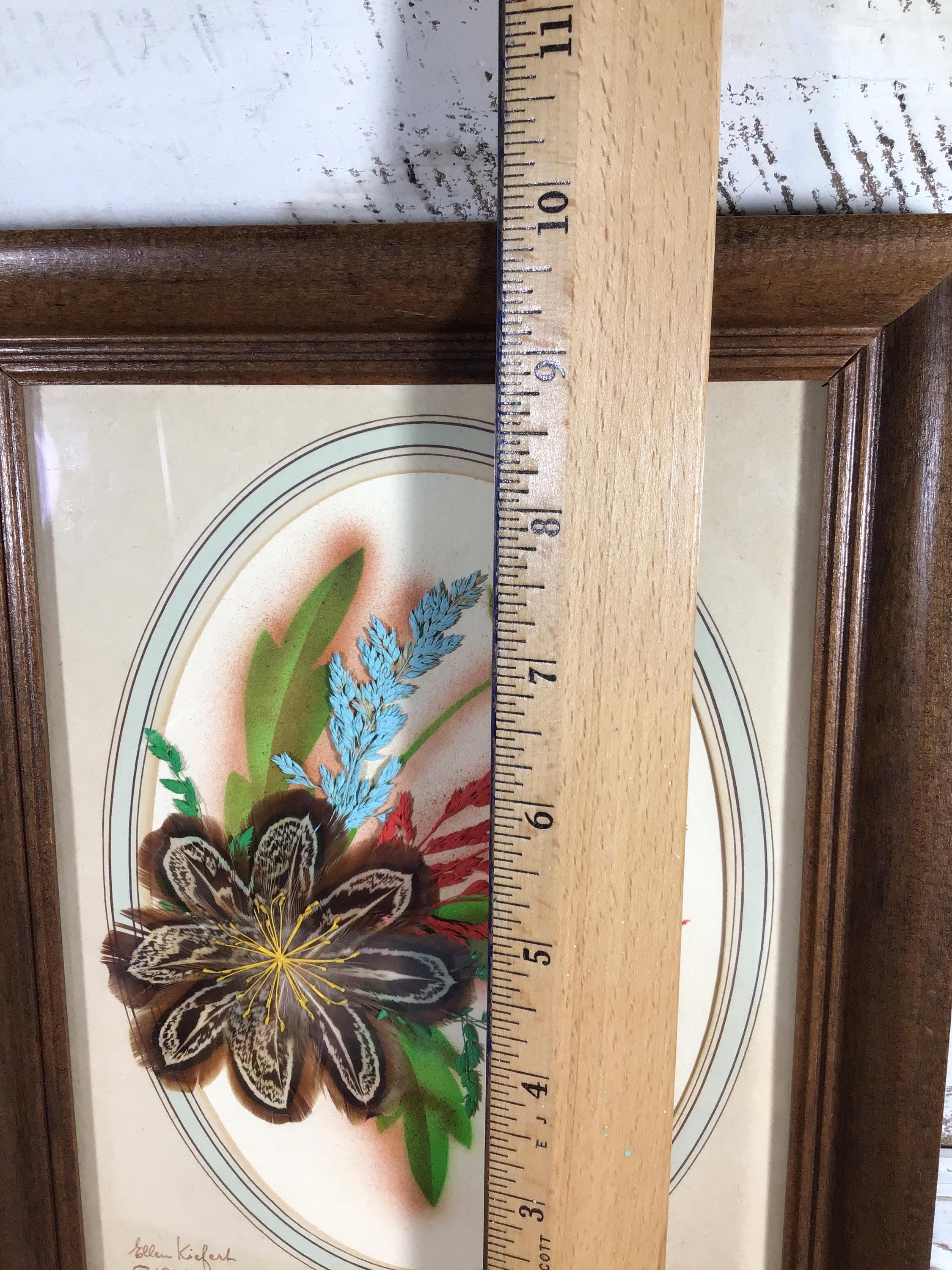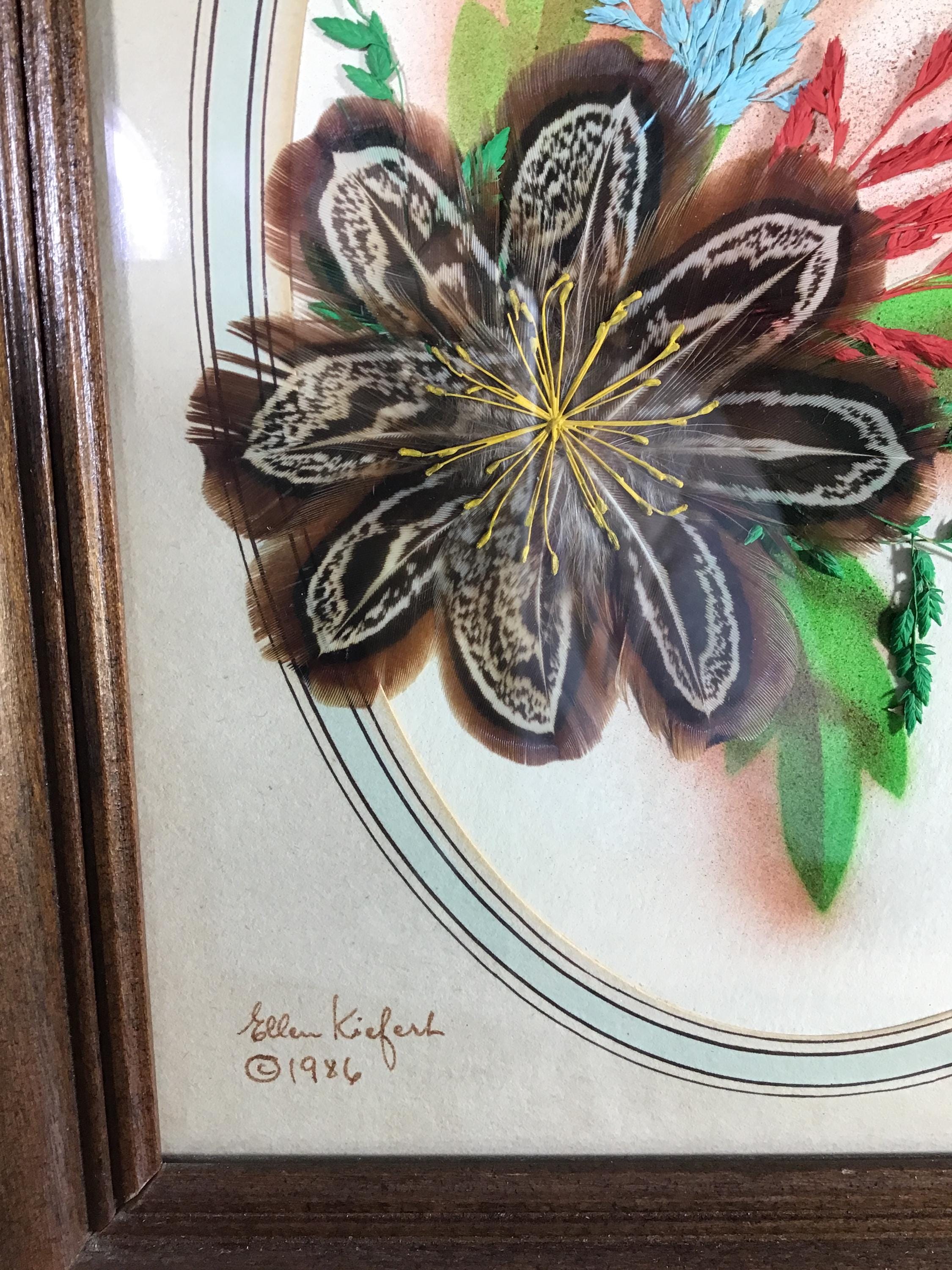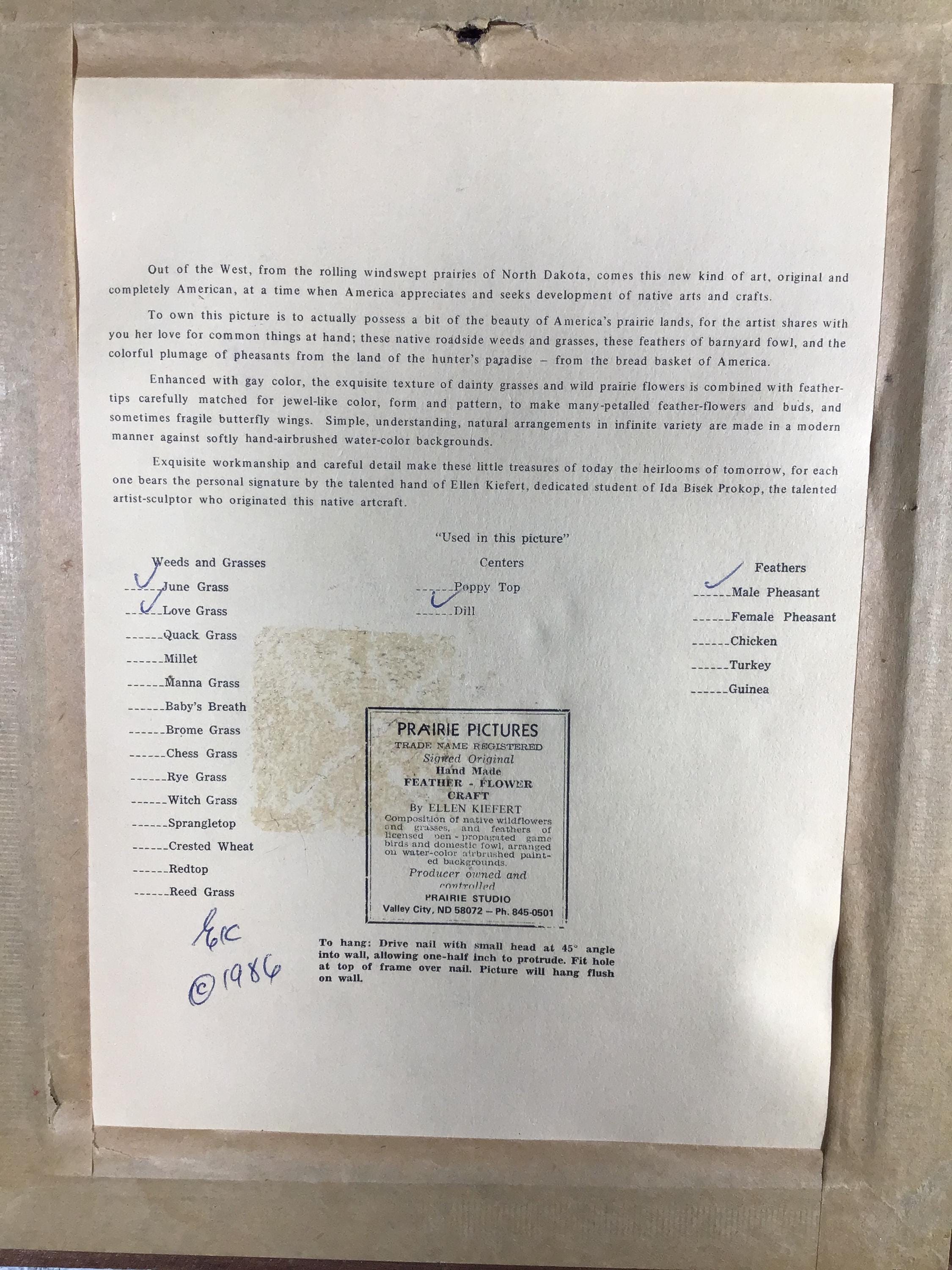 Exquisite "Prairie Picture" artwork handcrafted by North Dakotan artist Ellen Kiefert in 1986. The composition is created with male pheasant feathers, June grass, Love grass and Dill. This is. alovely piece of Western Americana art for your collection.