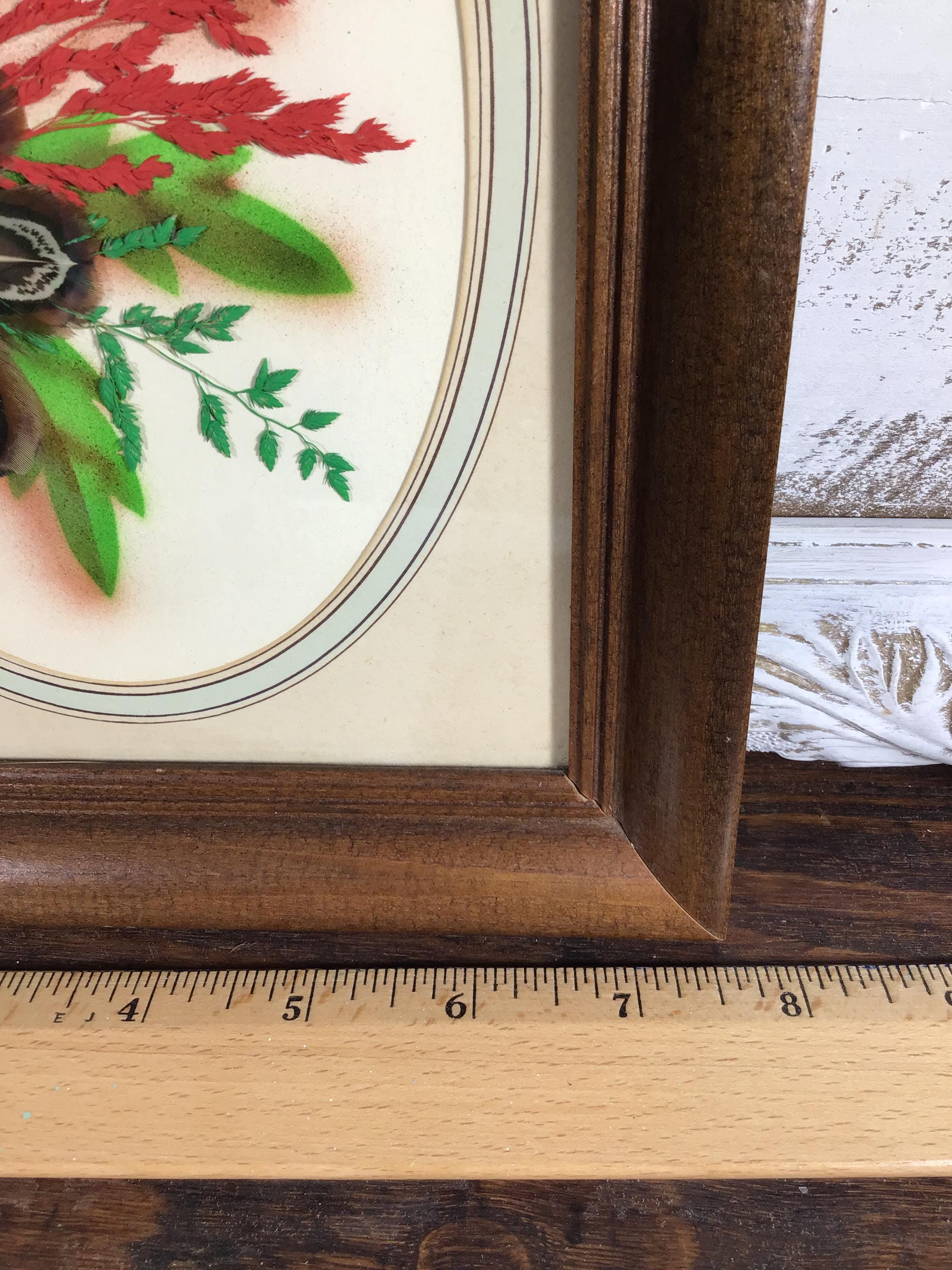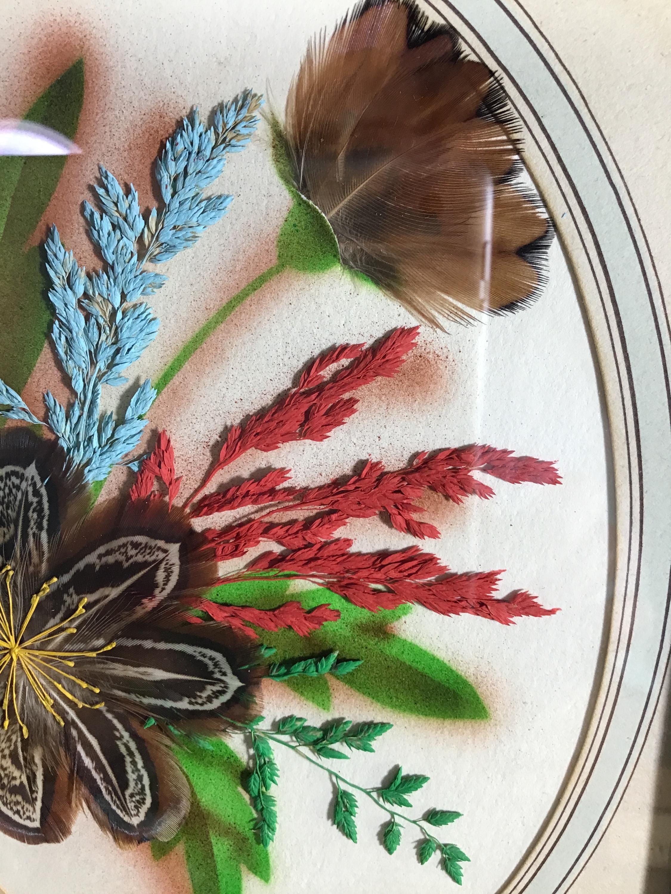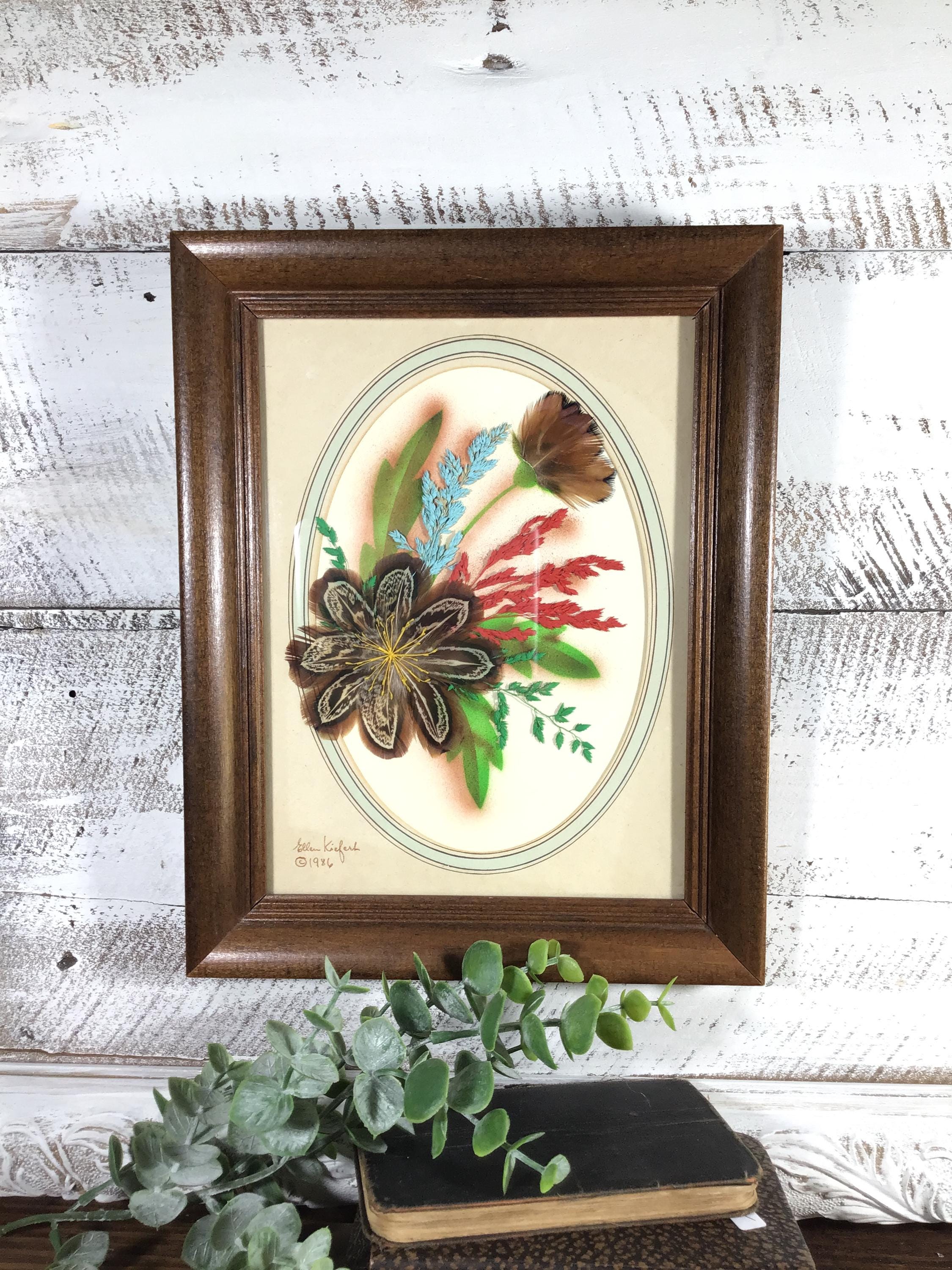 Exquisite "Prairie Picture" artwork handcrafted by North Dakotan artist Ellen Kiefert in 1986. The composition is created with male pheasant feathers, June grass, Love grass and Dill. This is. alovely piece of Western Americana art for your collection.