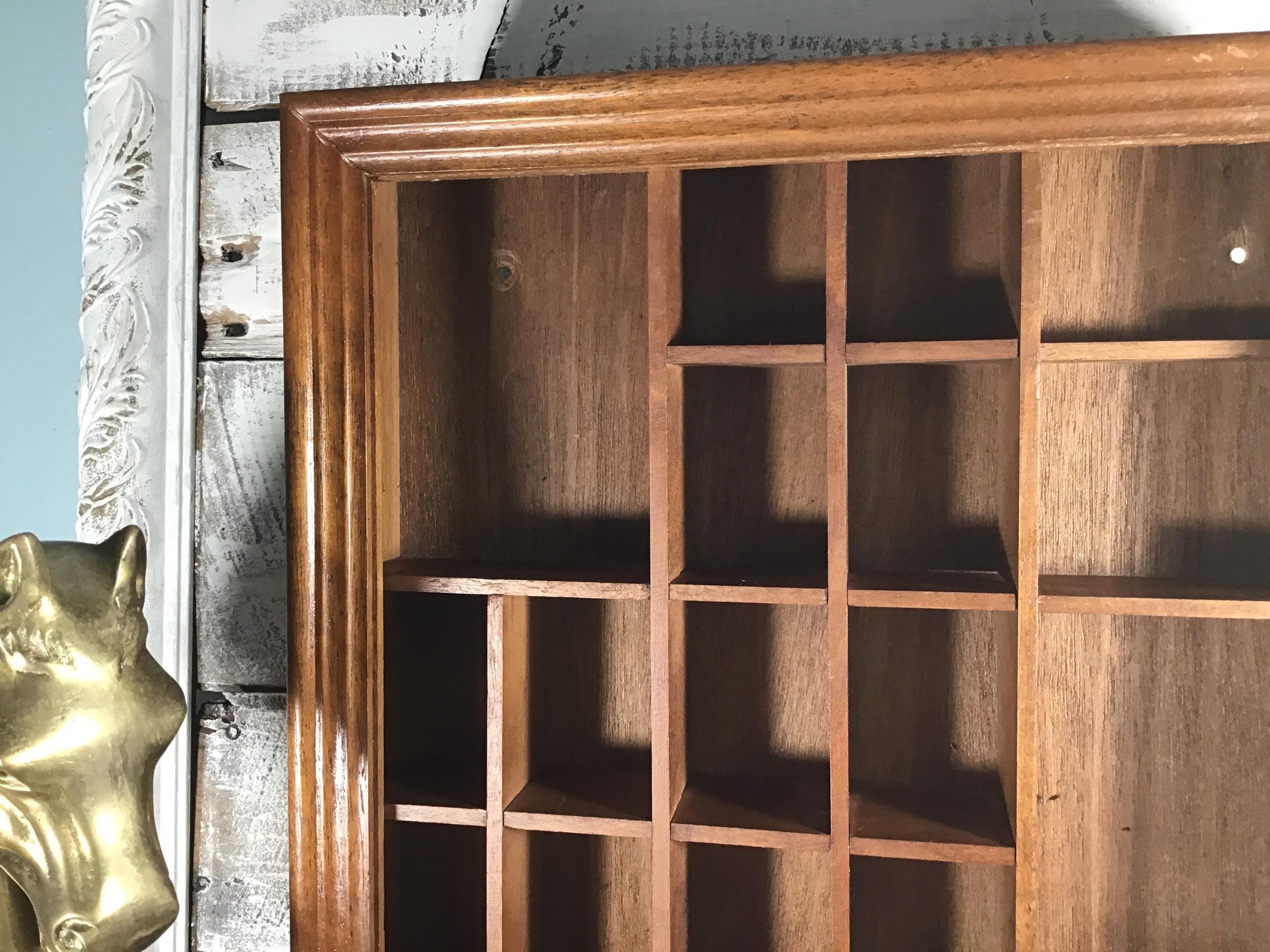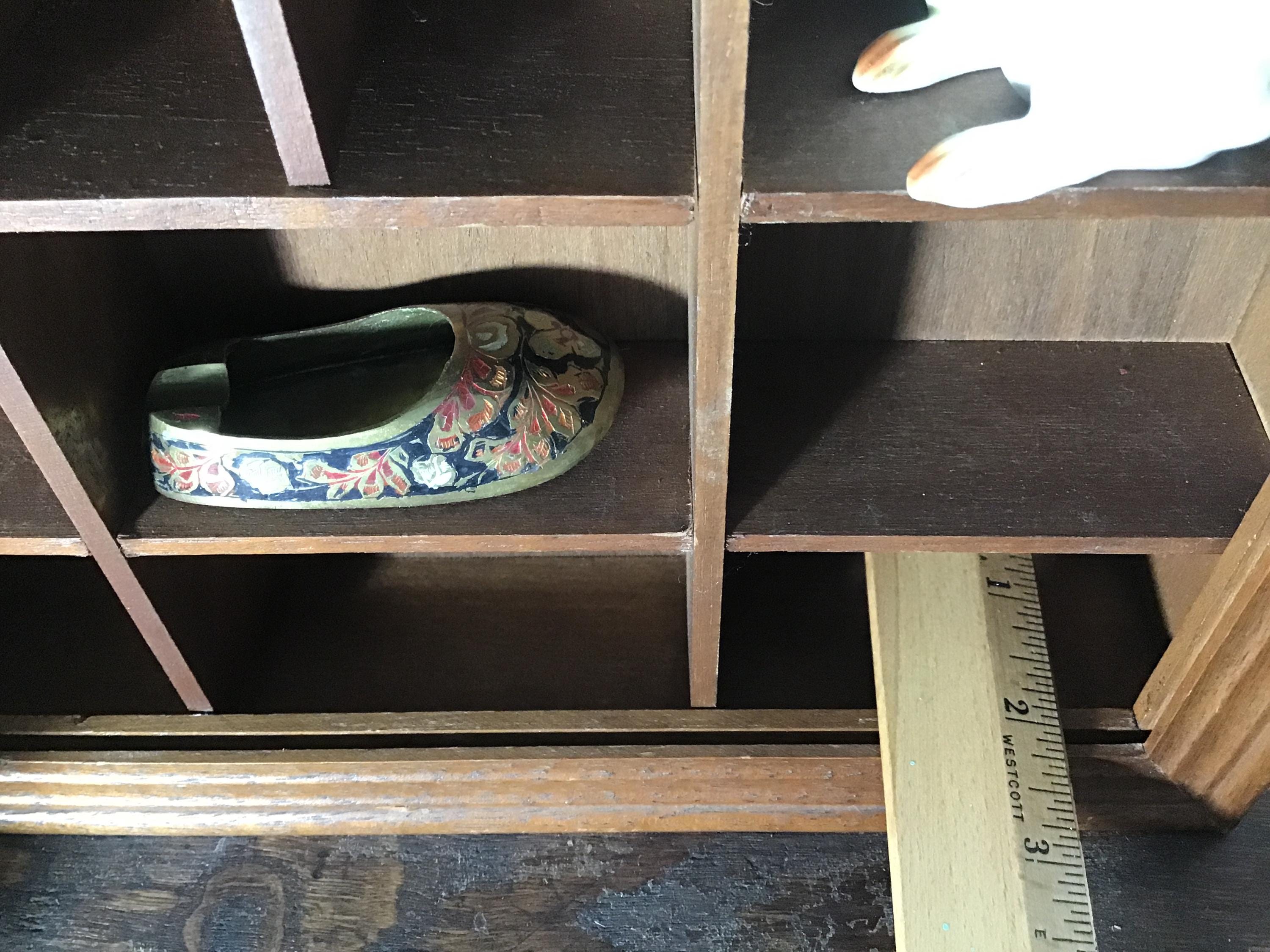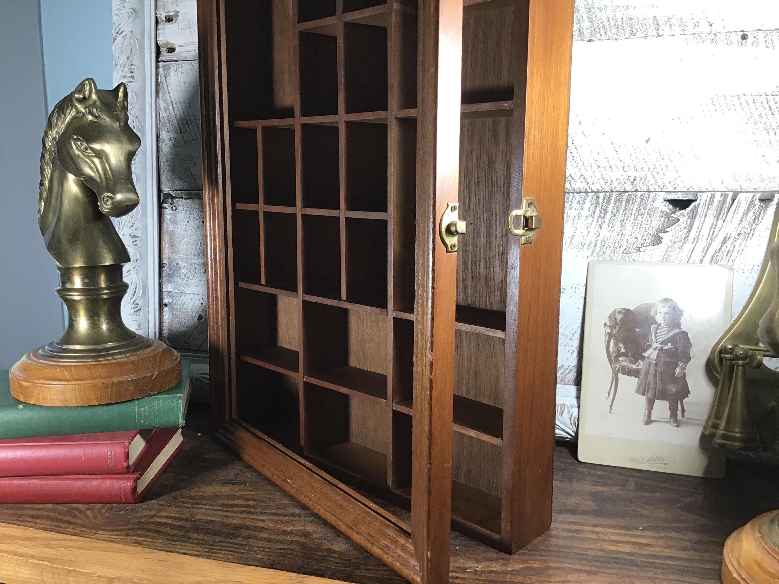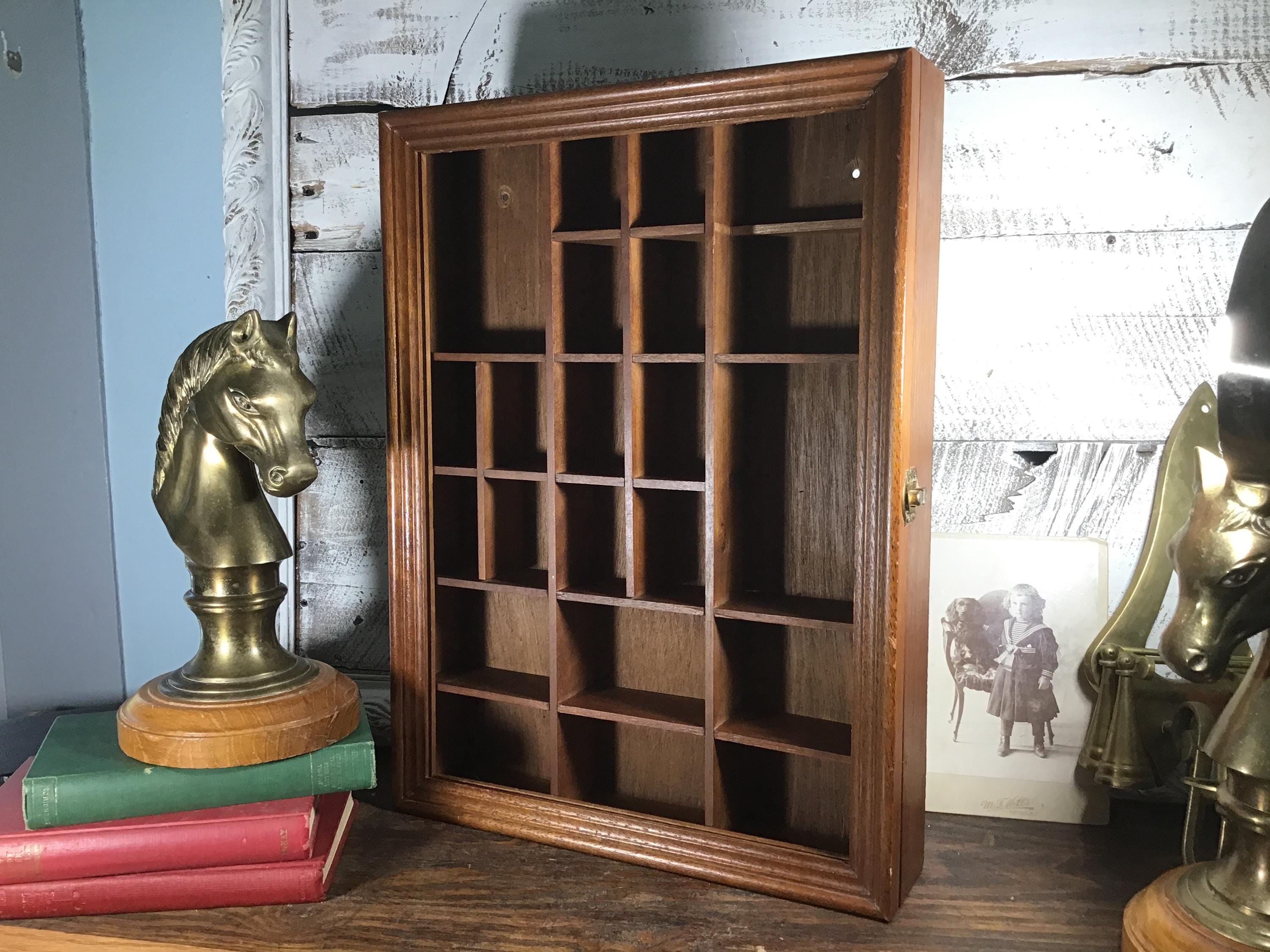 Vintage solid wood curio cabinet shadow box for wall or shelf. This lovely display cabinet has a metal clasp to open the front frame which once had a pane of glass, but the glass is missing. It could be replaced or leave it as an open front shelf. One small shelf on the top right is half the original depth. These small flaws are reflected in the lower price.