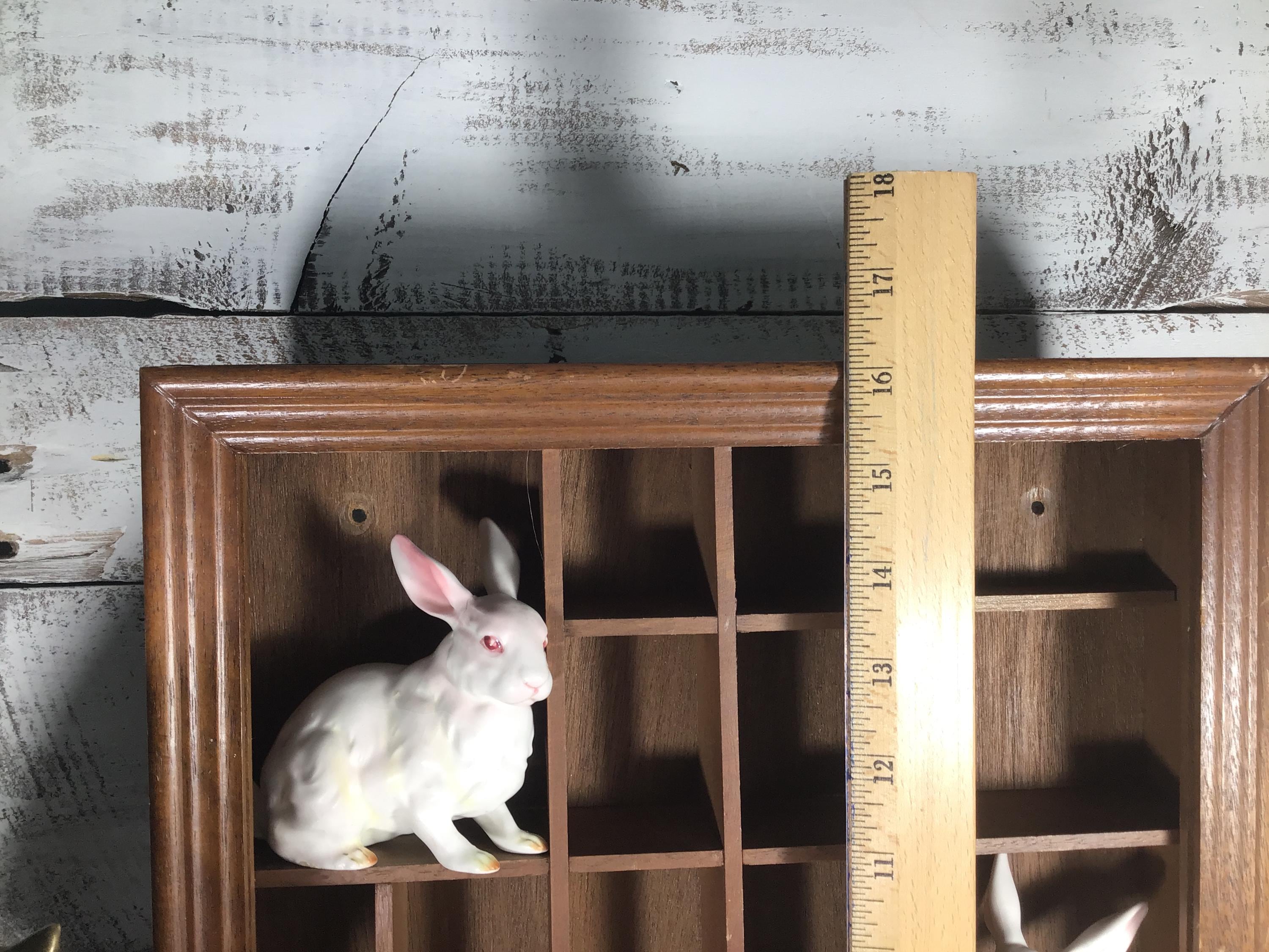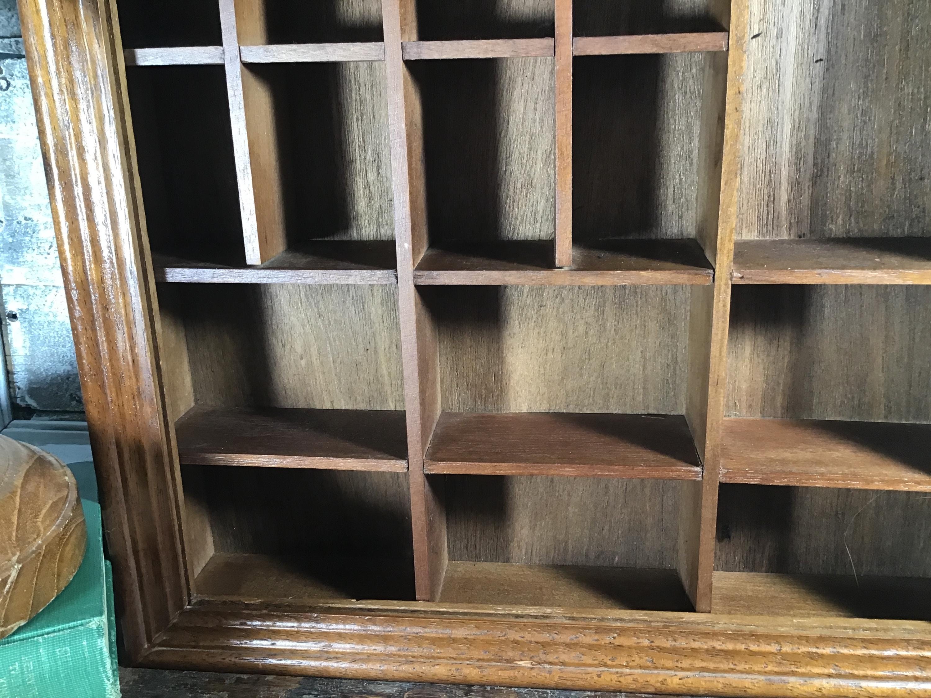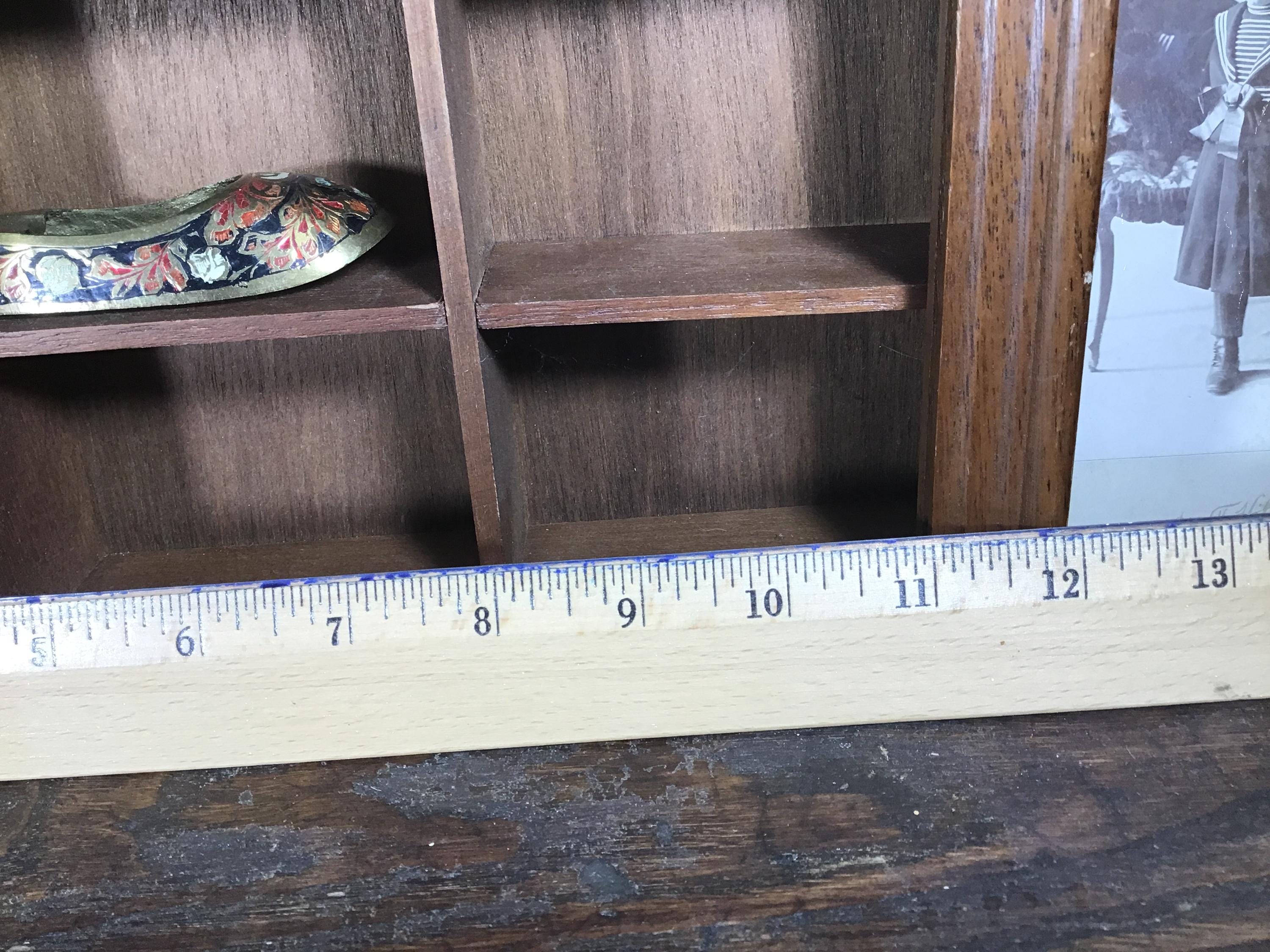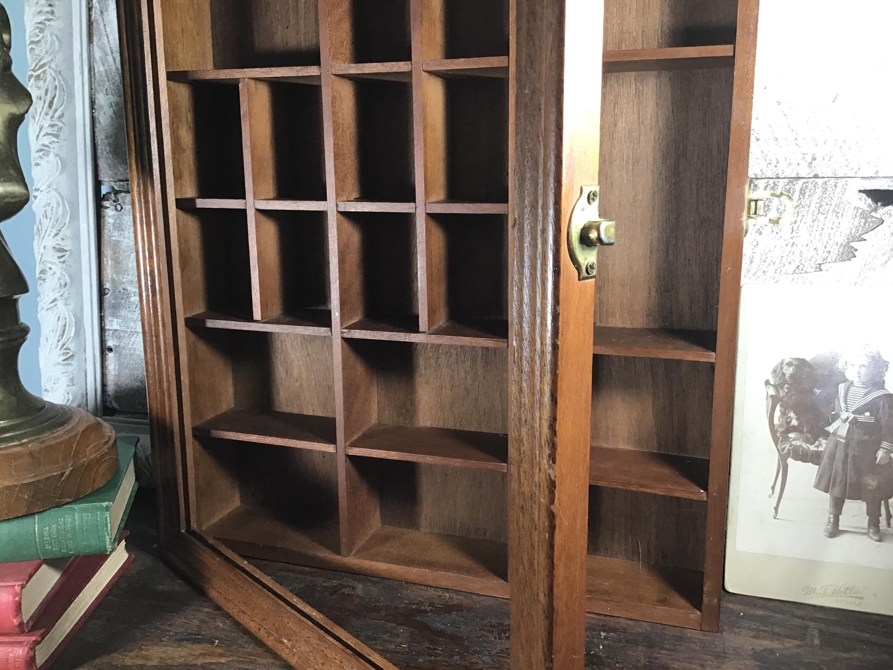 Vintage solid wood curio cabinet shadow box for wall or shelf. This lovely display cabinet has a metal clasp to open the front frame which once had a pane of glass, but the glass is missing. It could be replaced or leave it as an open front shelf. One small shelf on the top right is half the original depth. These small flaws are reflected in the lower price.