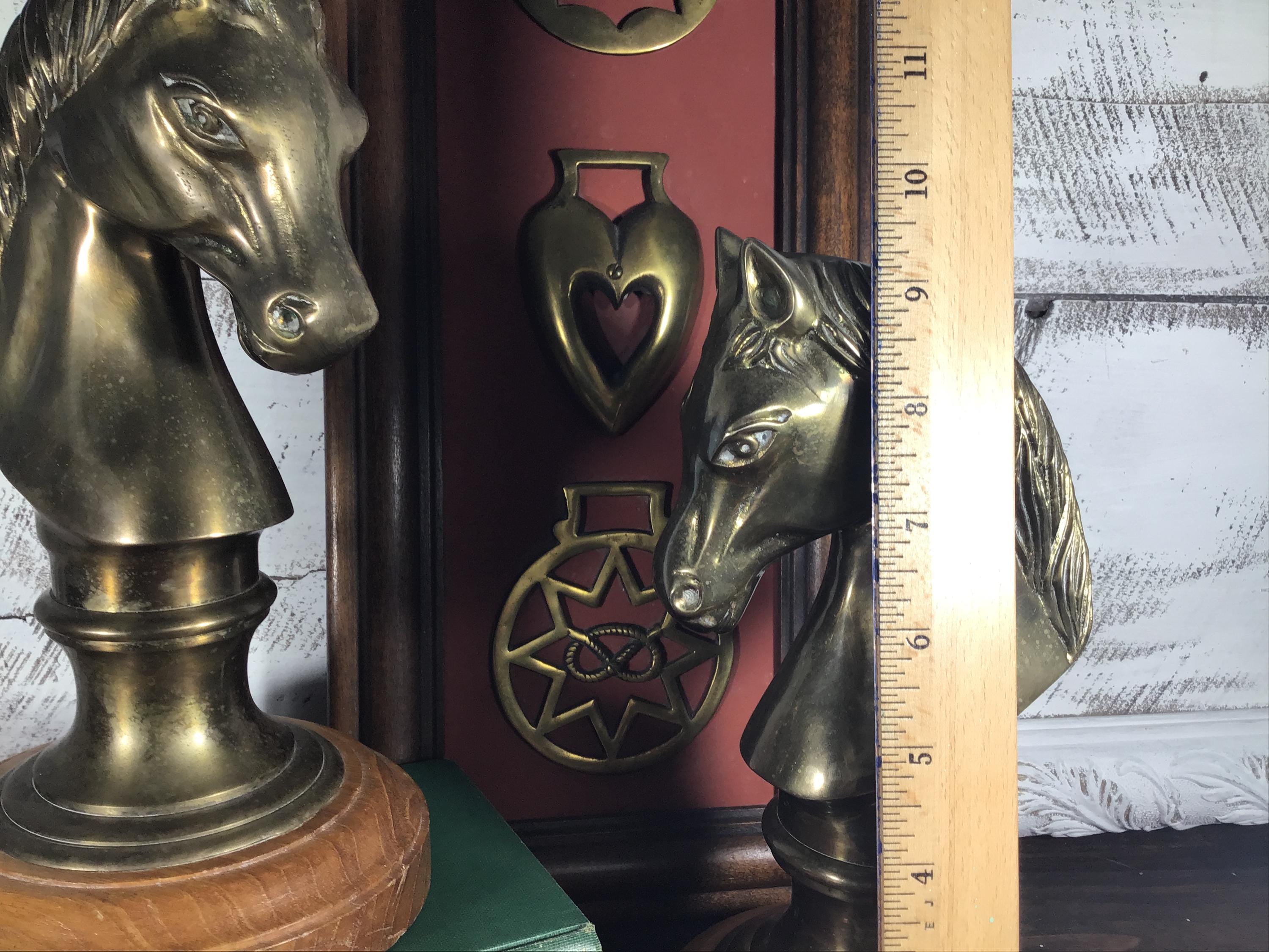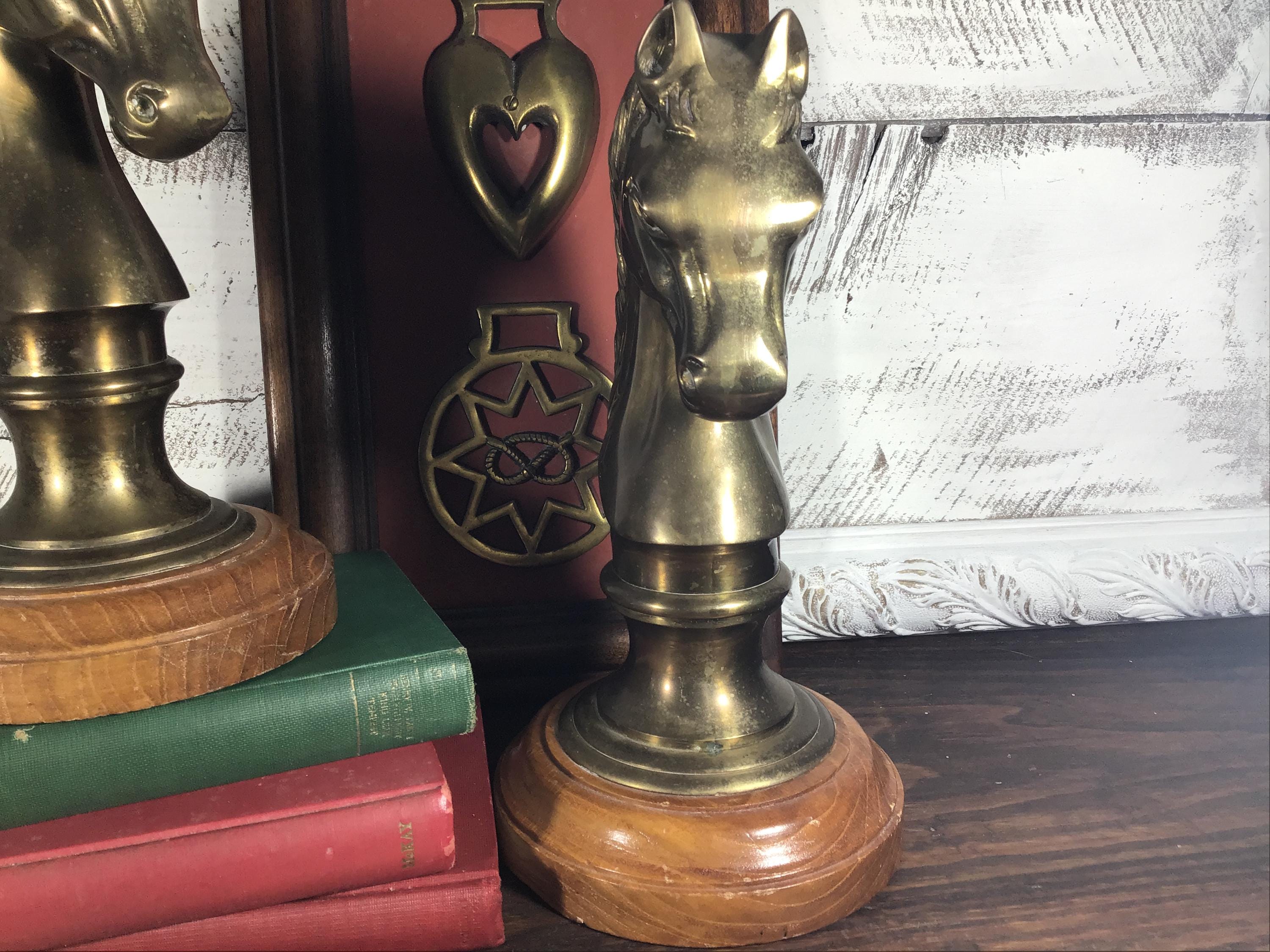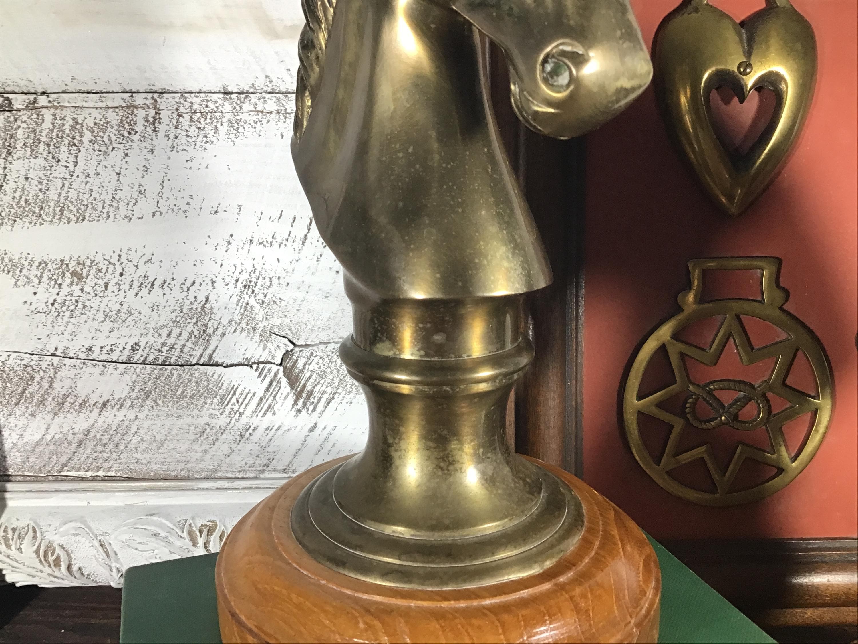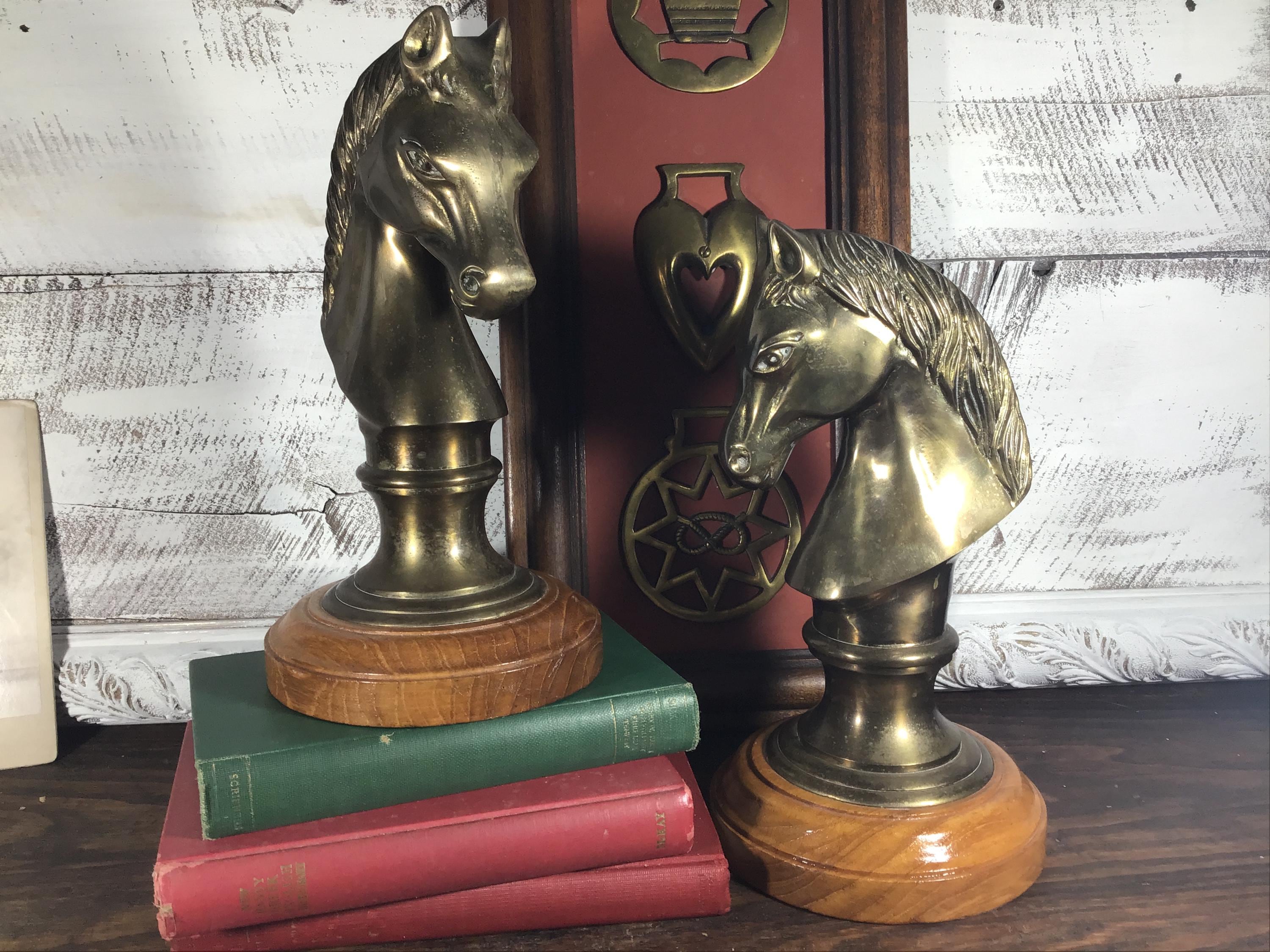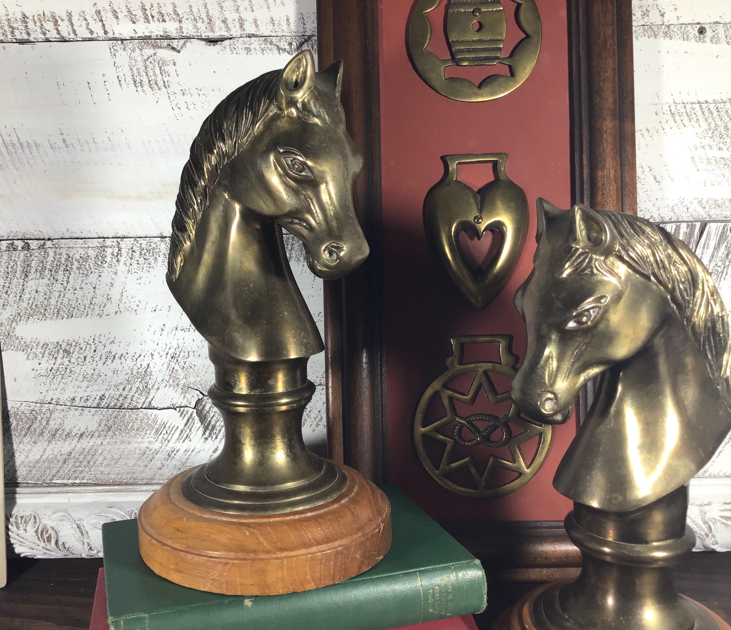 Beautiful vintage brass horse head sculpture, figurine or bookend on solid wood base and velvet bottom. (2 available- SOLD SEPARATELY)