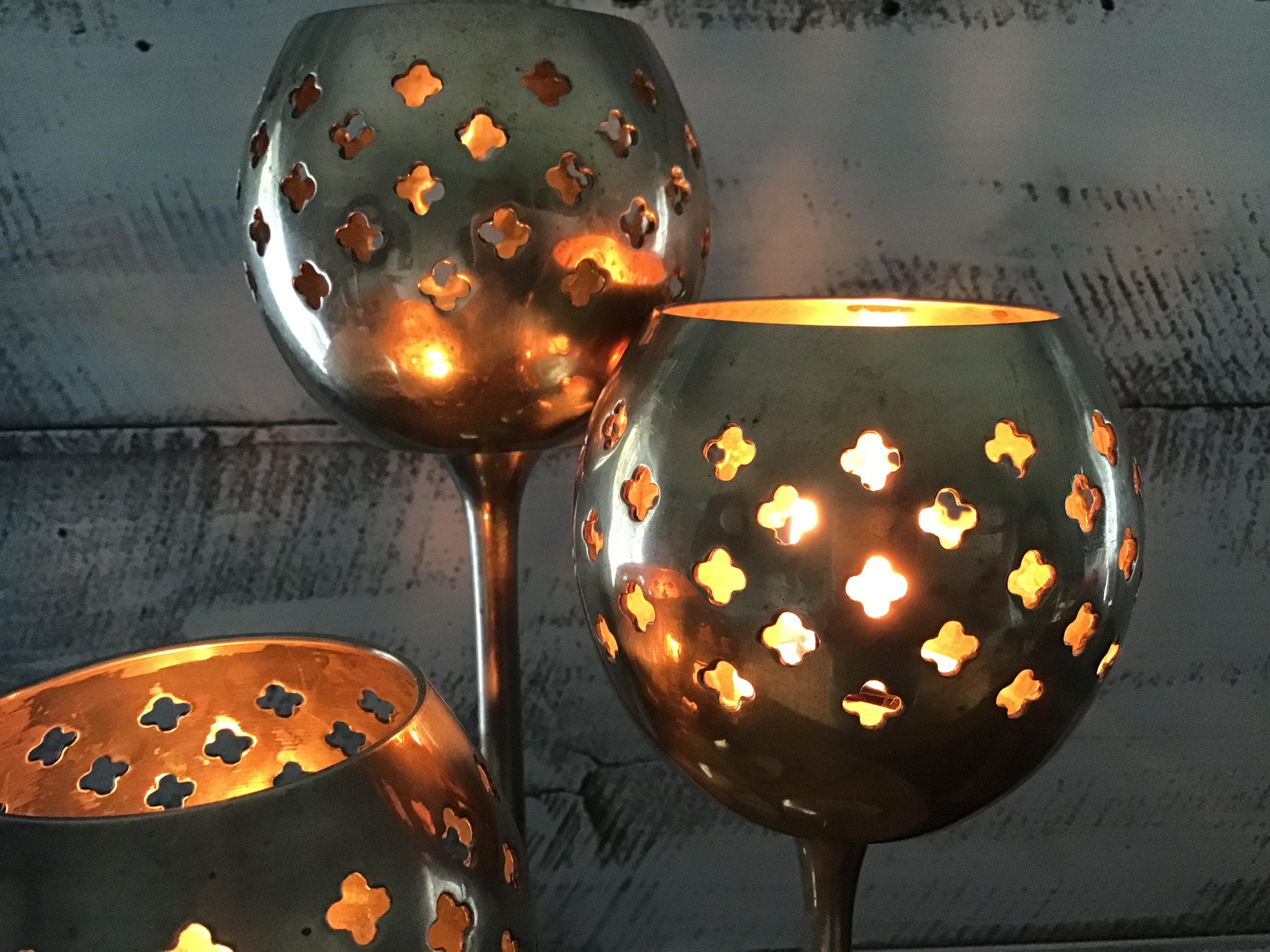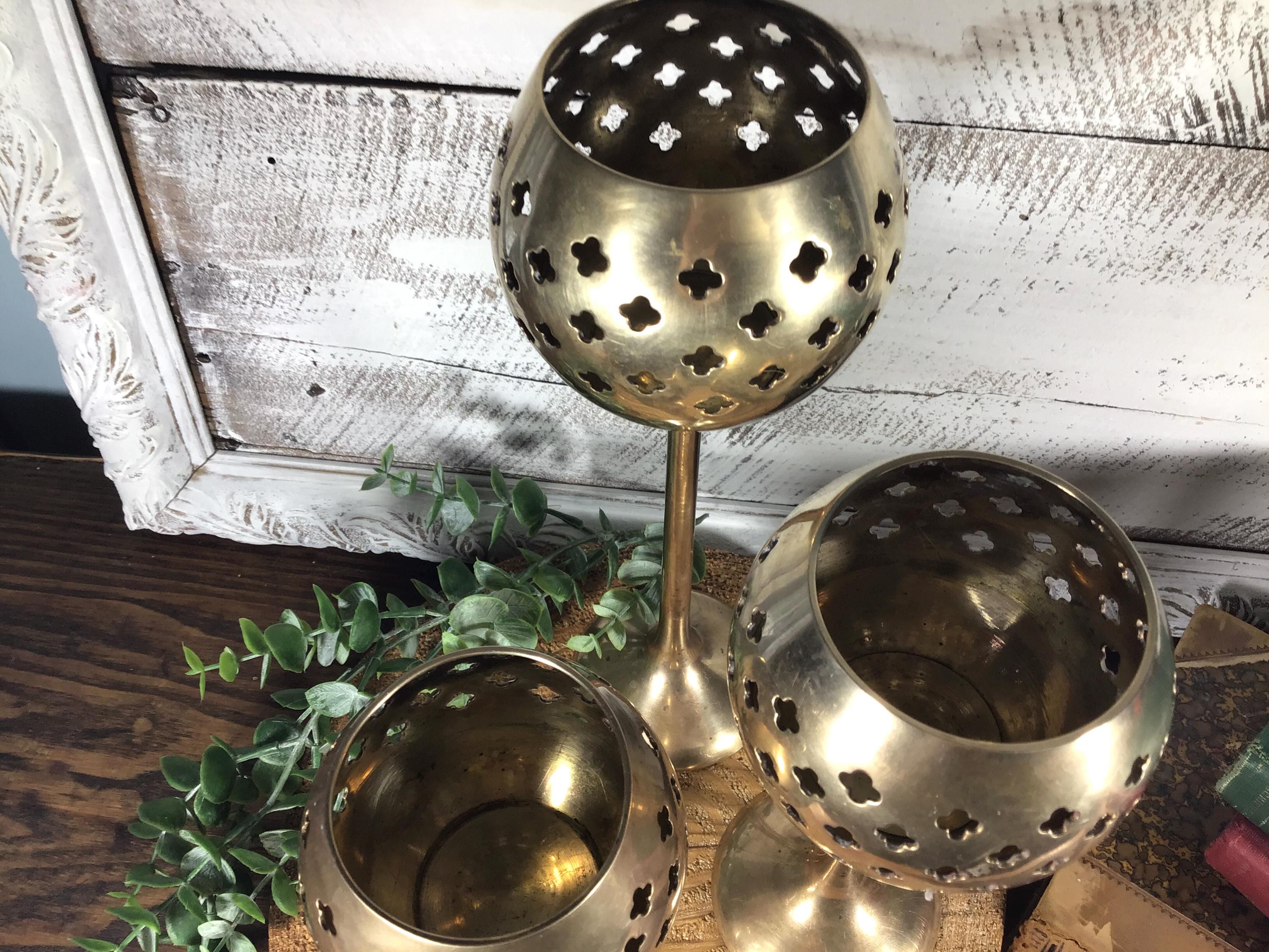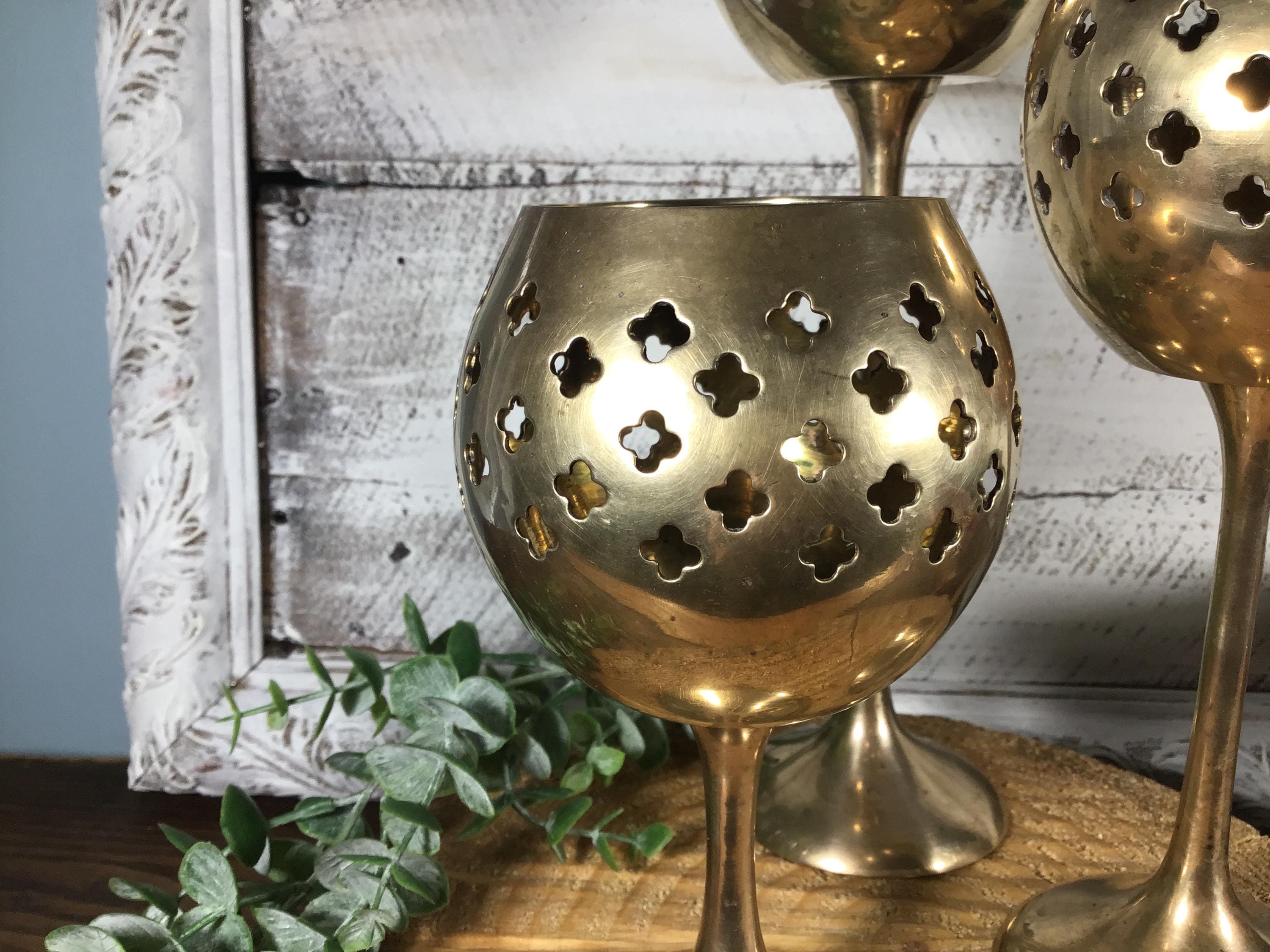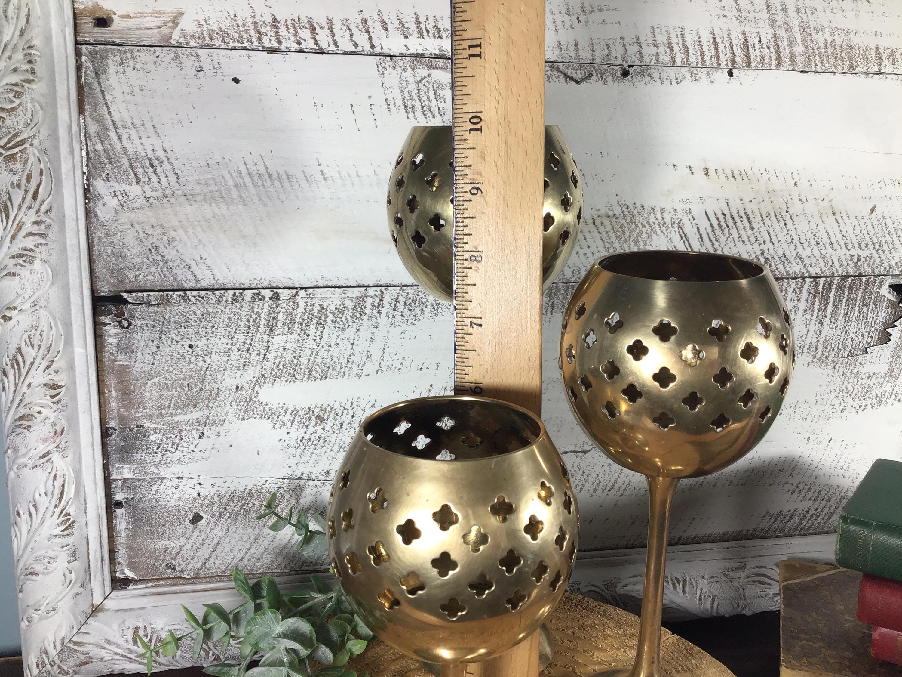 Beautiful golden brass candle holder trip with punched/pierced Moroccan design.