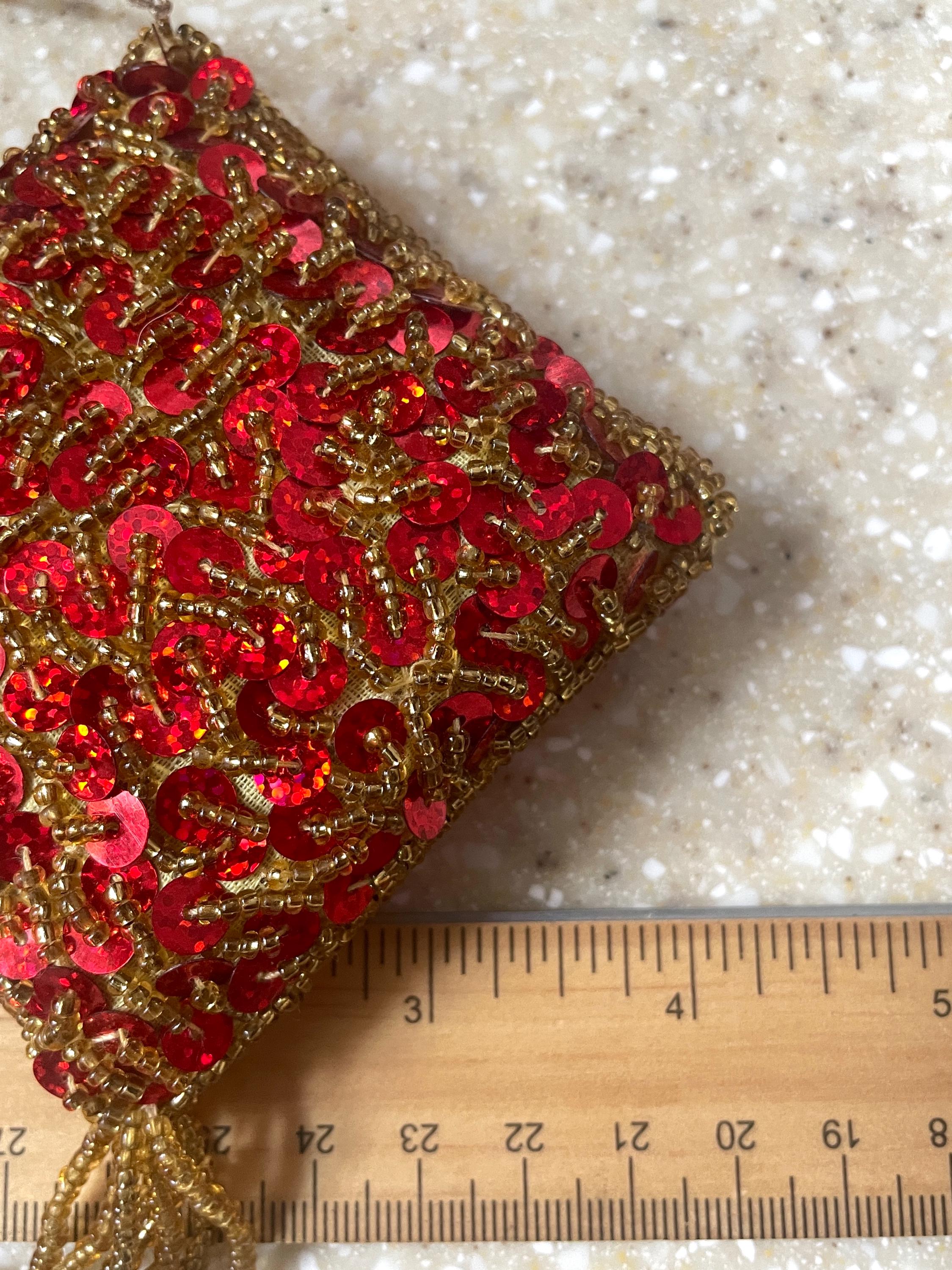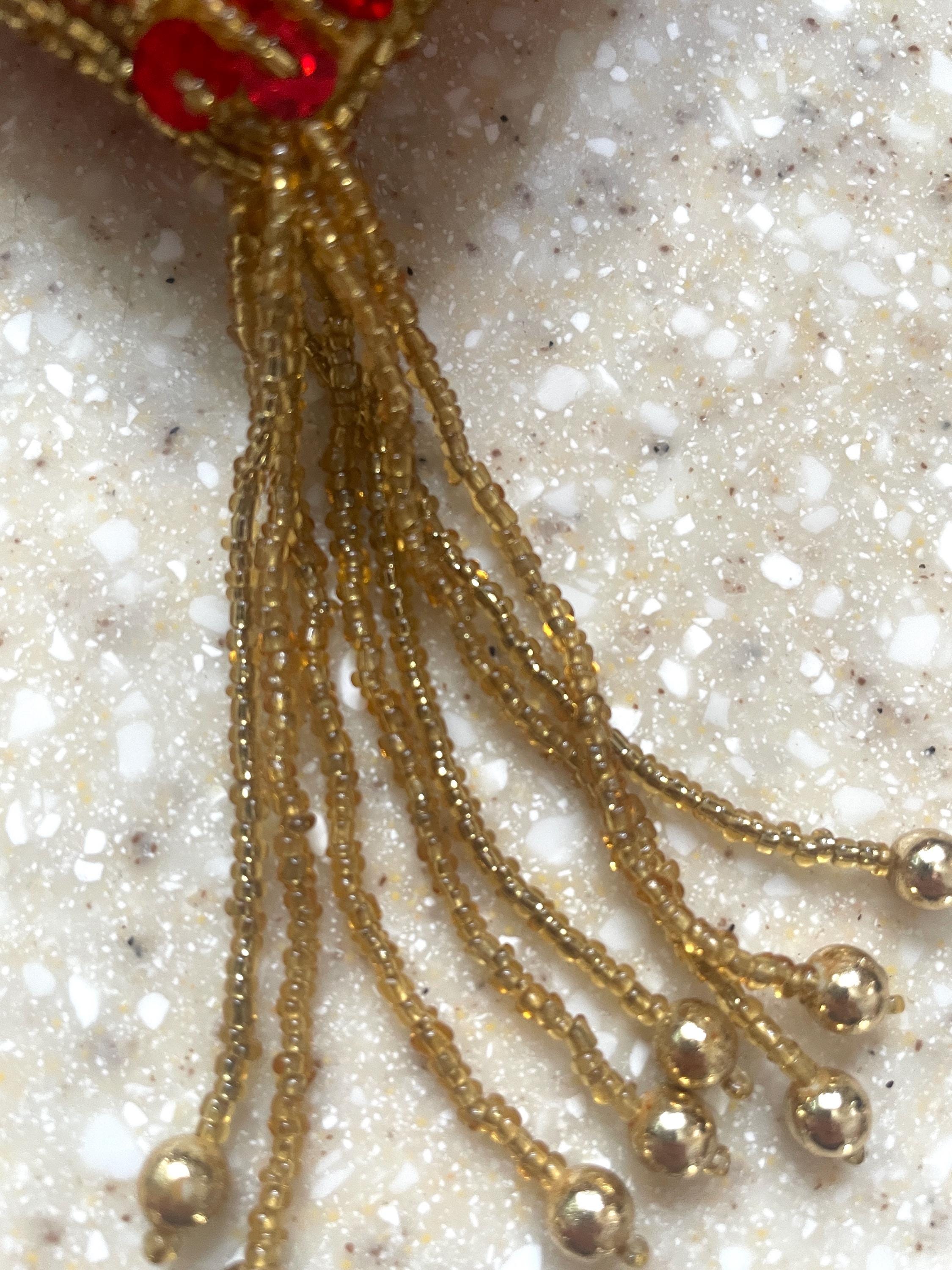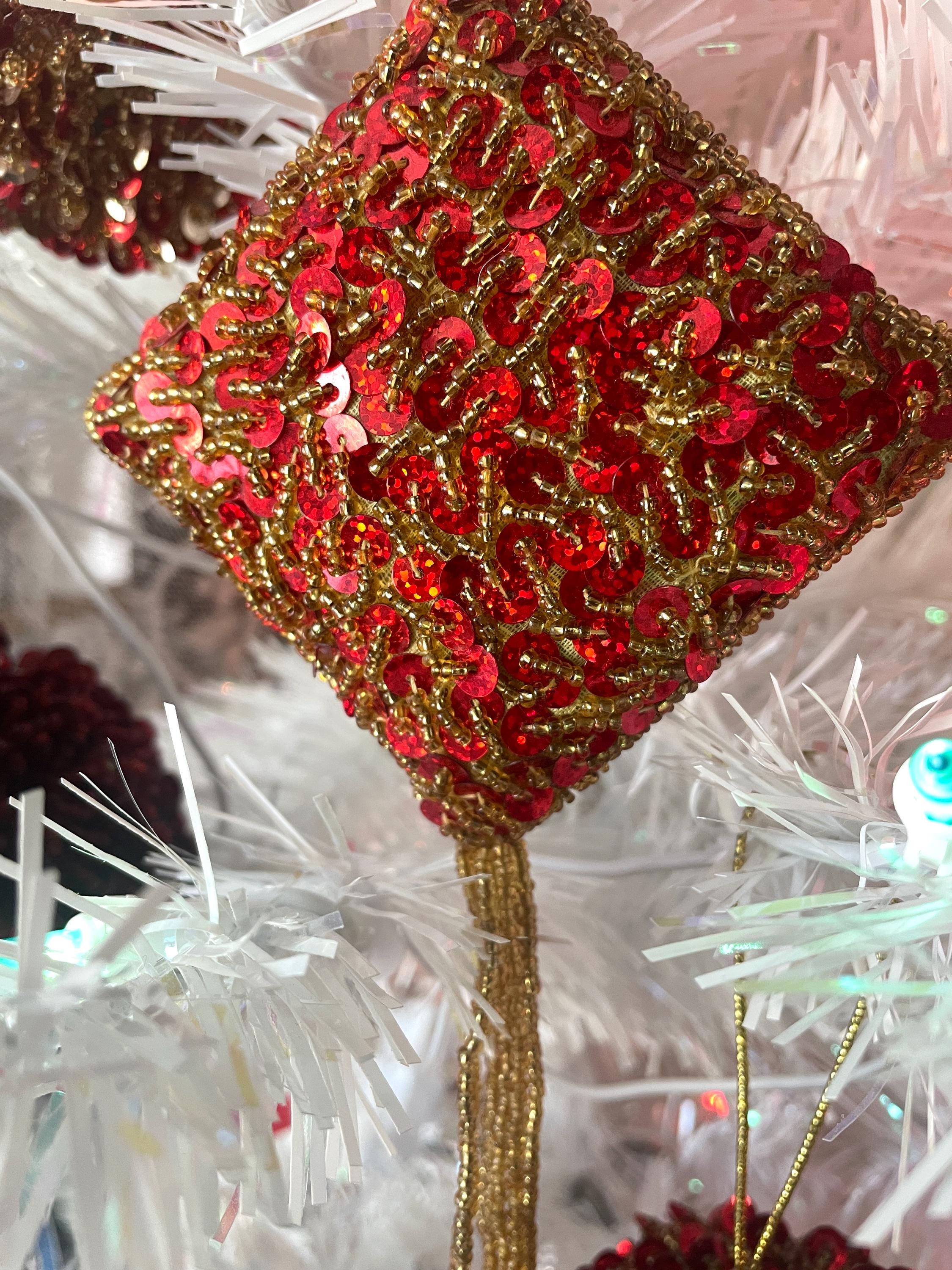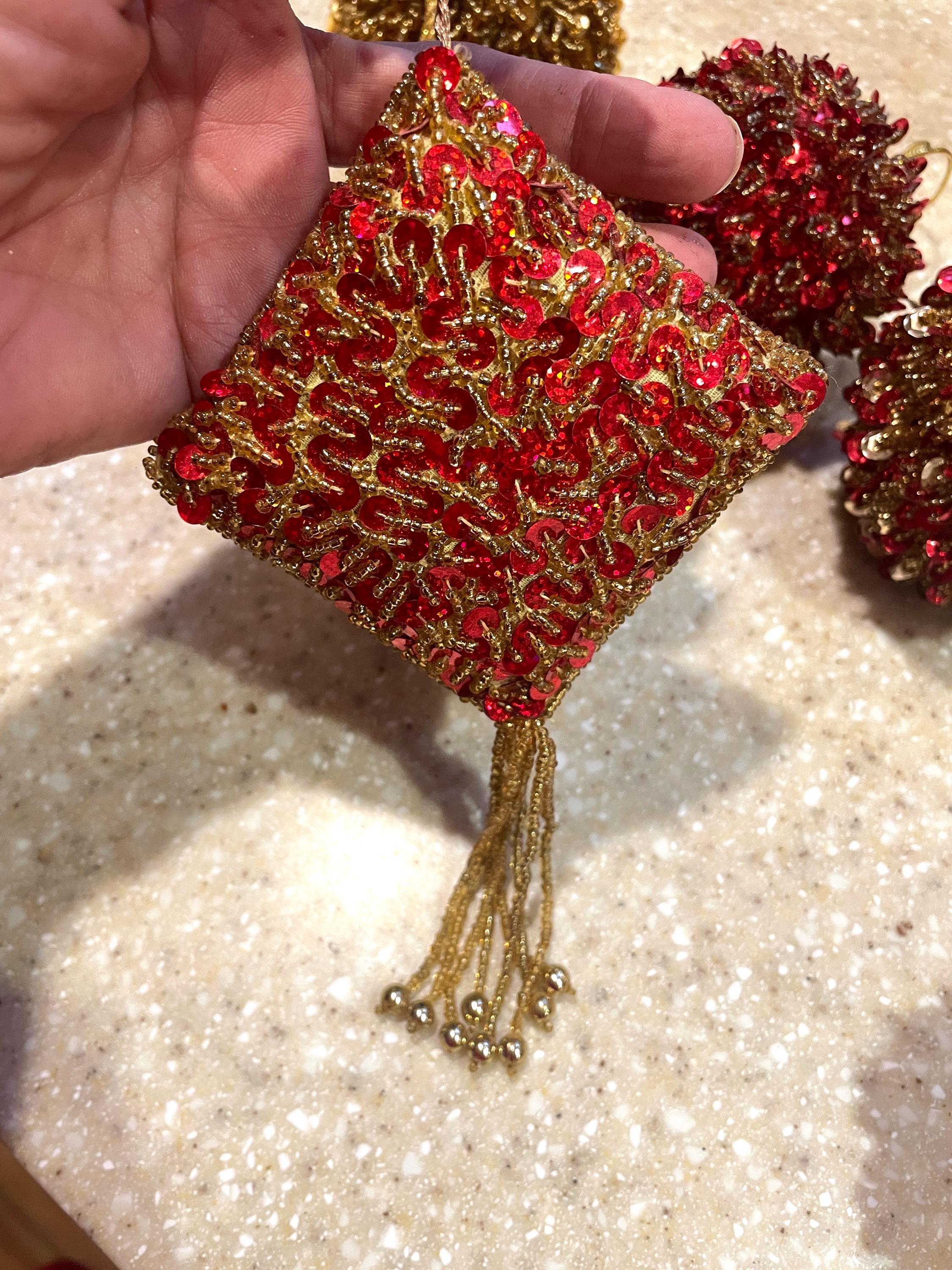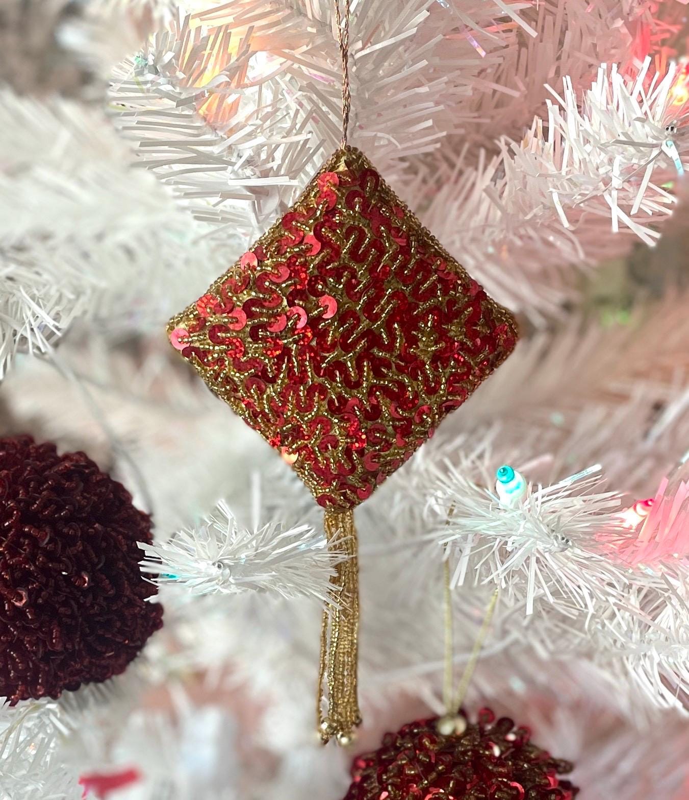 Beautiful set of 3 hand beaded and sequins diamond-shaped ornaments with beaded tassels. Gold hanging cord. 7 inches total length.