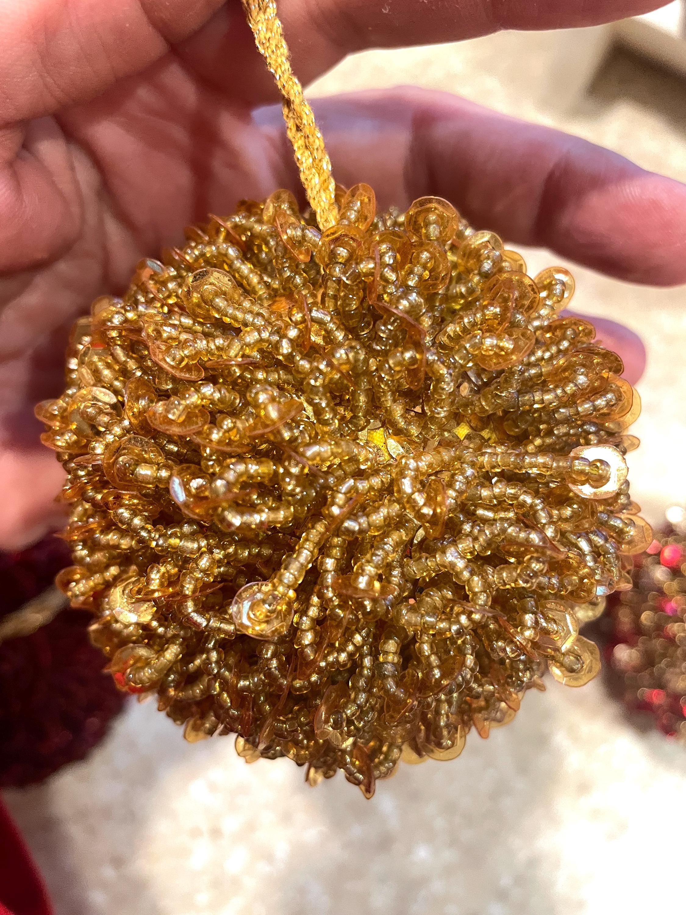 Beautiful gold glass beaded ornament in a Baroque style that evokes the air of a Victorian Christmas.