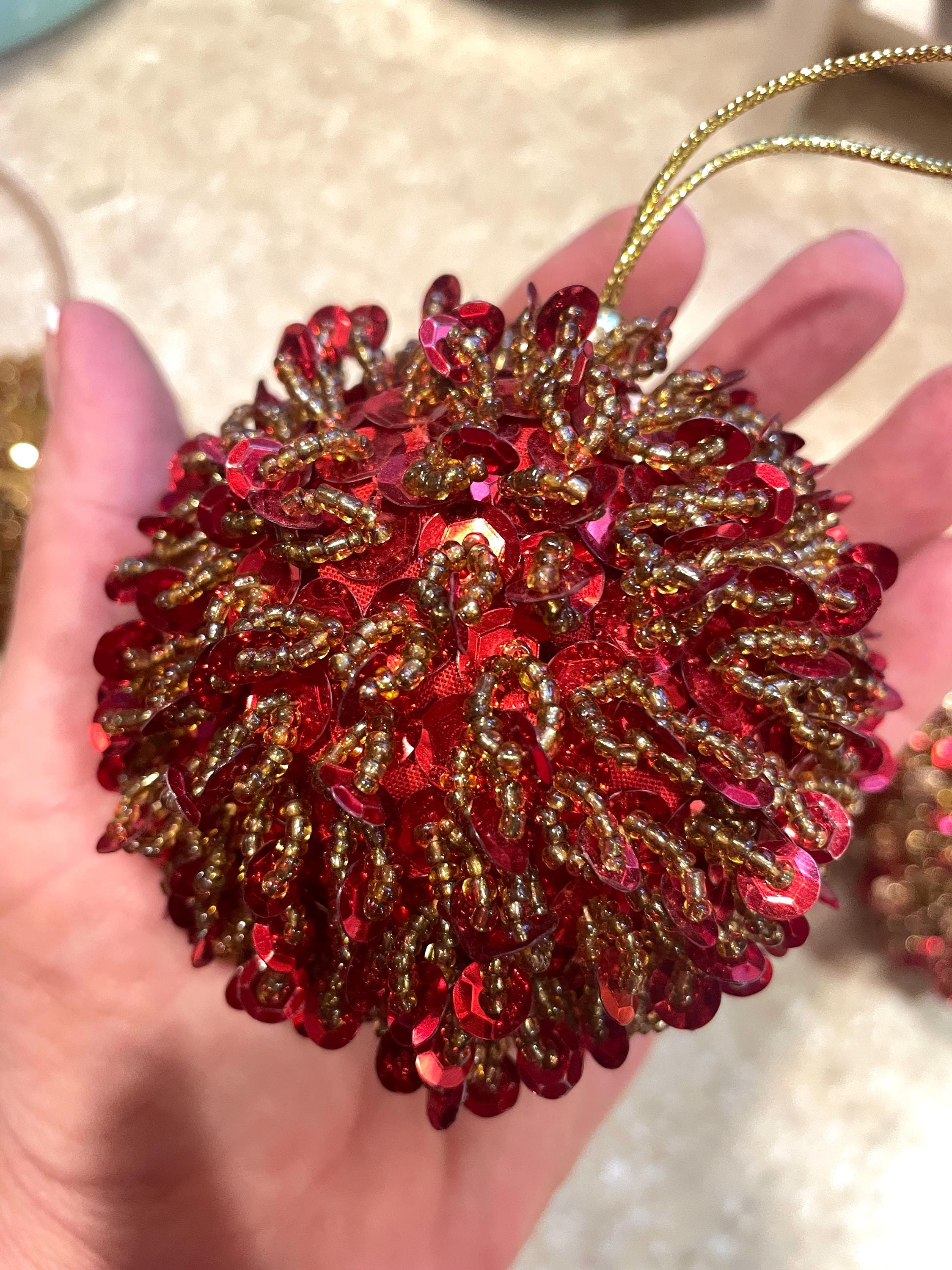 Beautiful vintage gold glass beaded ornament with red sequins. Create a Victorian Christmas! Hang from a gold cord.