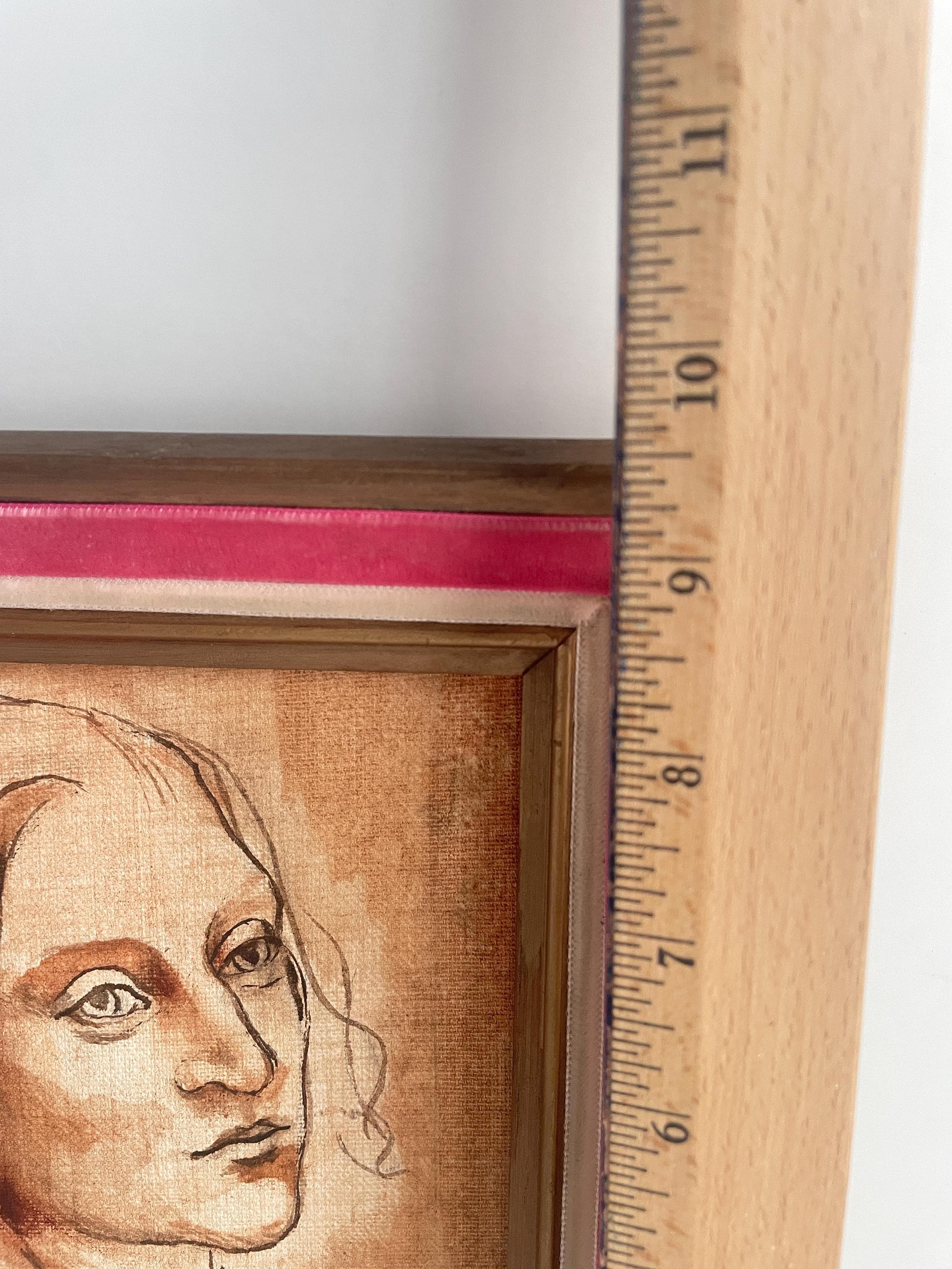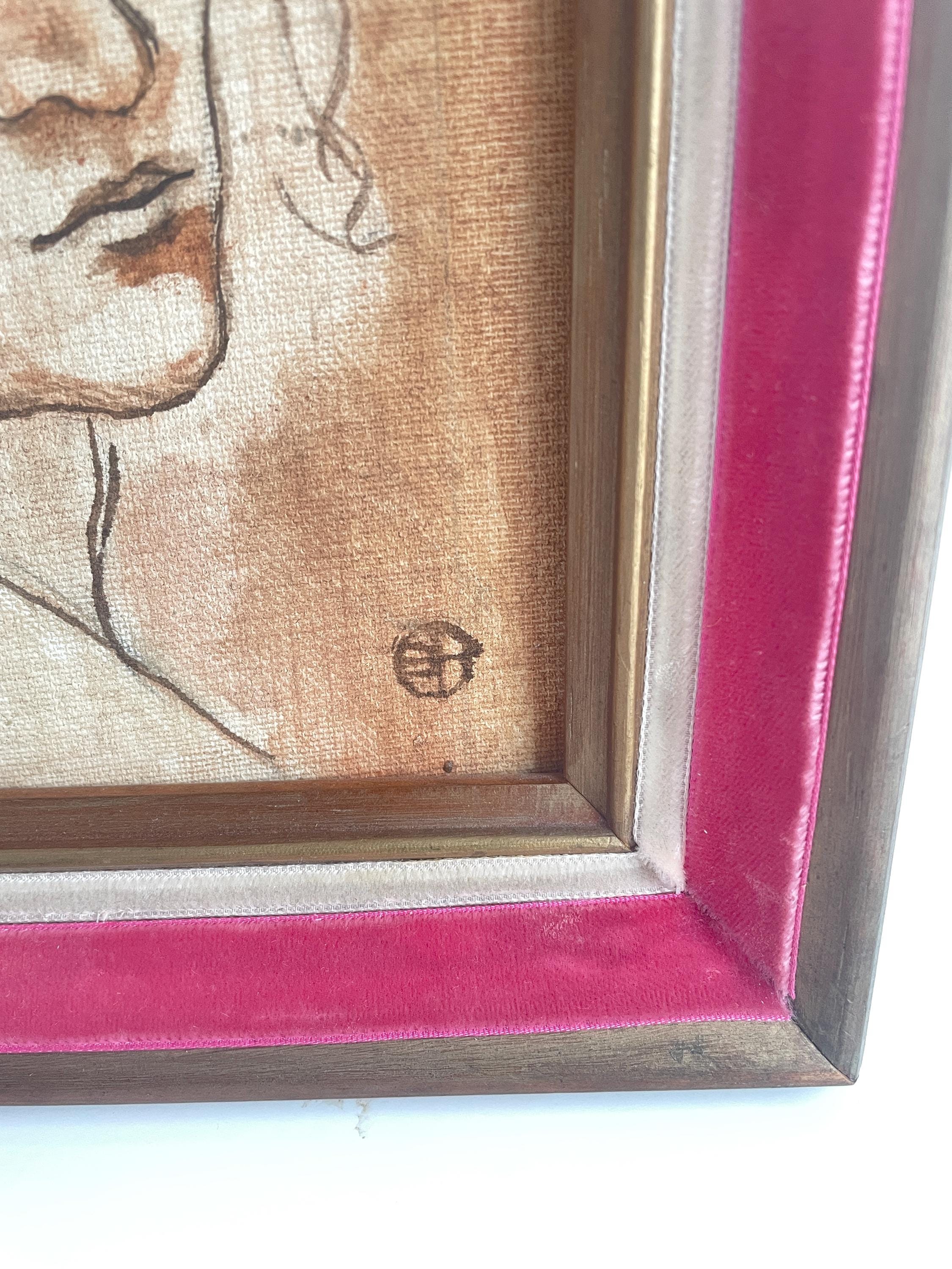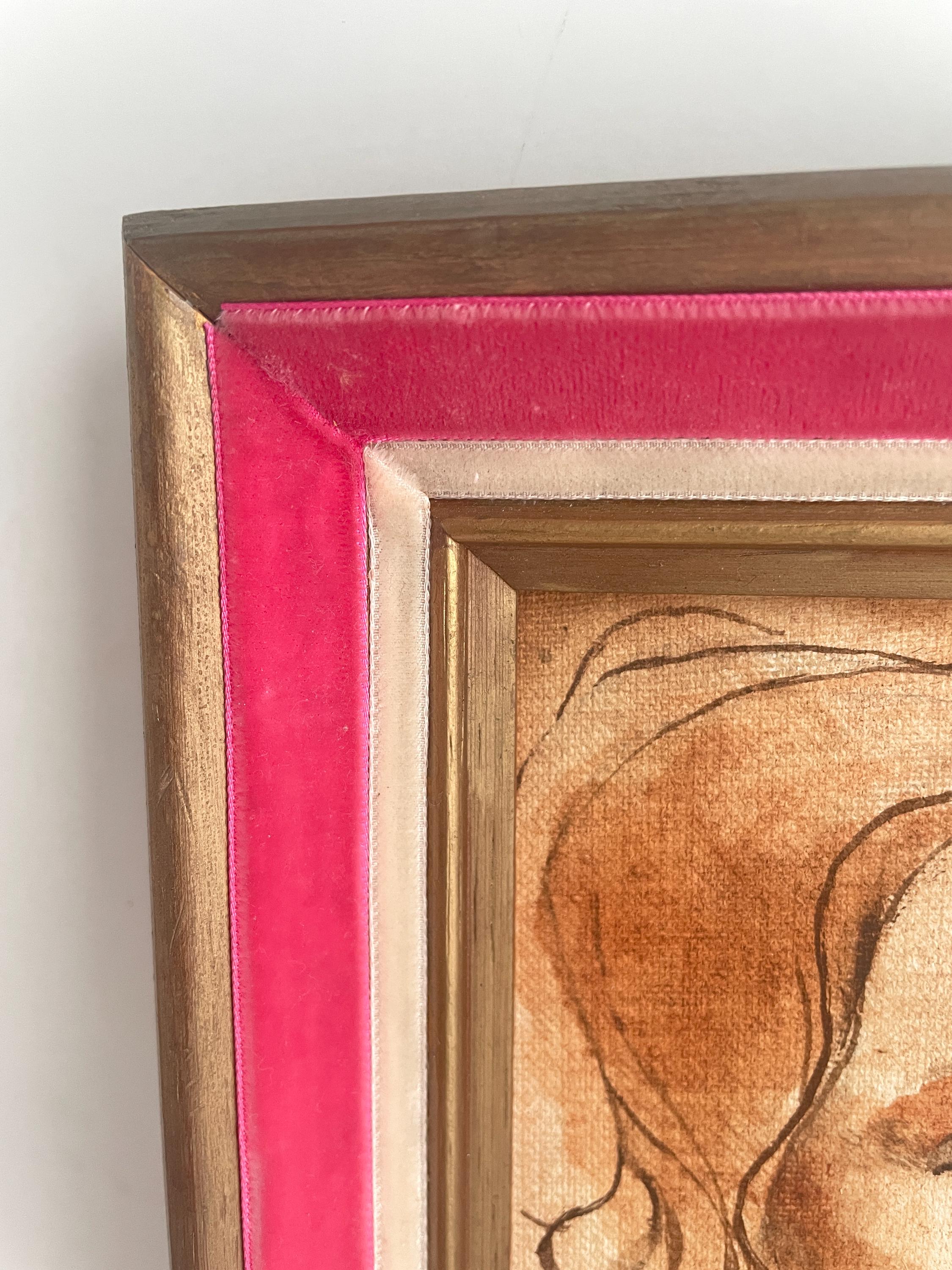 Vintage framed portrait of a woman in the style of Da Vinci. This Renaissance-style painted sketch on canvas is framed in a lovely wood frame with a pink velvet border. Perfect for portrait collectors or as an addition to a gallery wall. Artist signature in bottom right corner (artist unknown). Please check photos closely for condition. Very good vintage condition.