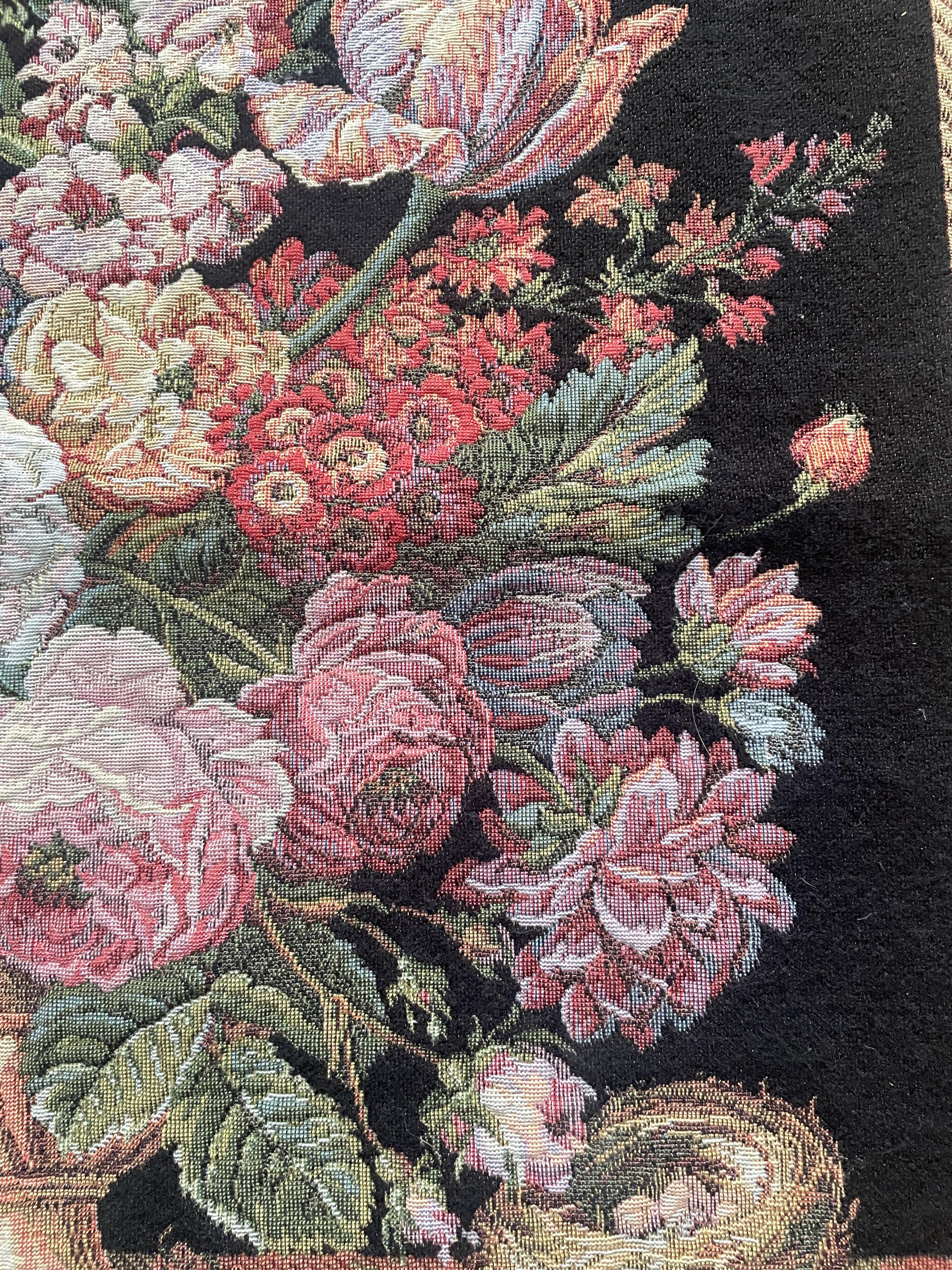 Stunning French Tapestry Wall Hanging created from a floral bouquest still-life painting by 1600s Dutch artist Jan Davidsz de Heem. It has a beautiful rich black background and vibrant colorful flowers in a pedestal urn. The backing is 100% cotton. There are three metal hanging clips on the back along with a tunnel insert for hanging with a rod (not included). There is a small stain or spot on the back (see photo) which is not visible on the front.