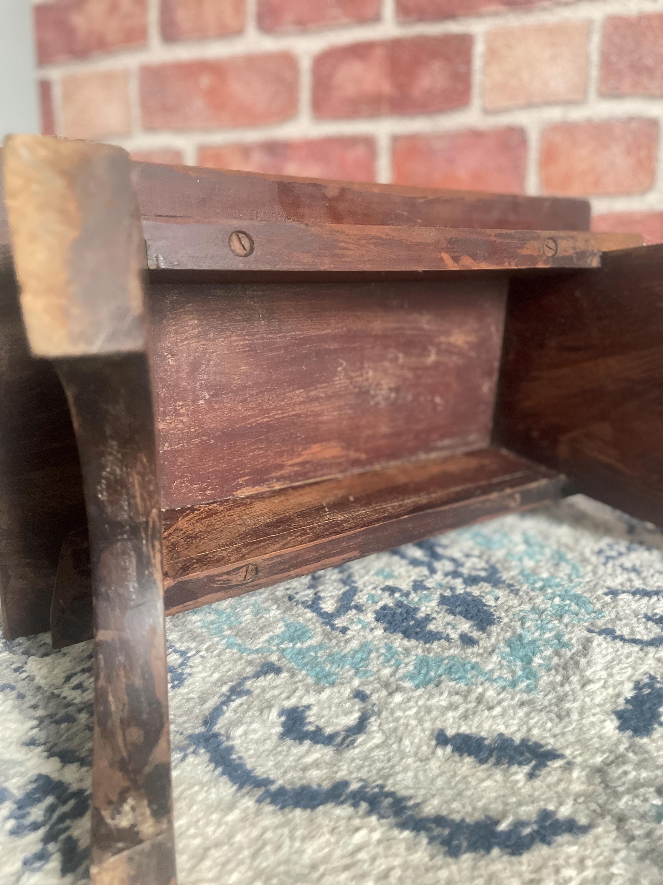 ❌ Condition: the wood finish is distressed and worn consistent with its vintage age. It has a time-worn top and is a perfectly aged rustic piece