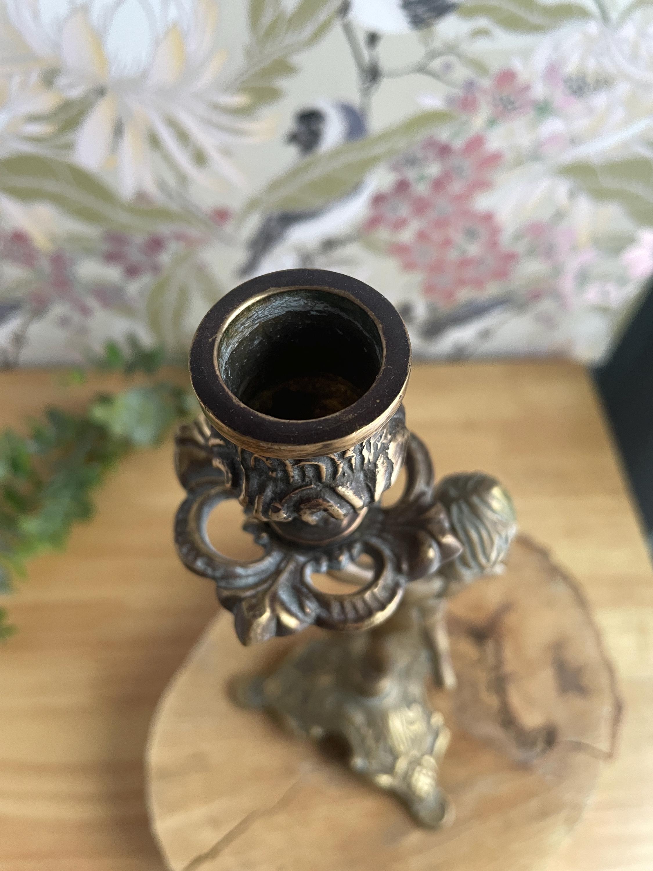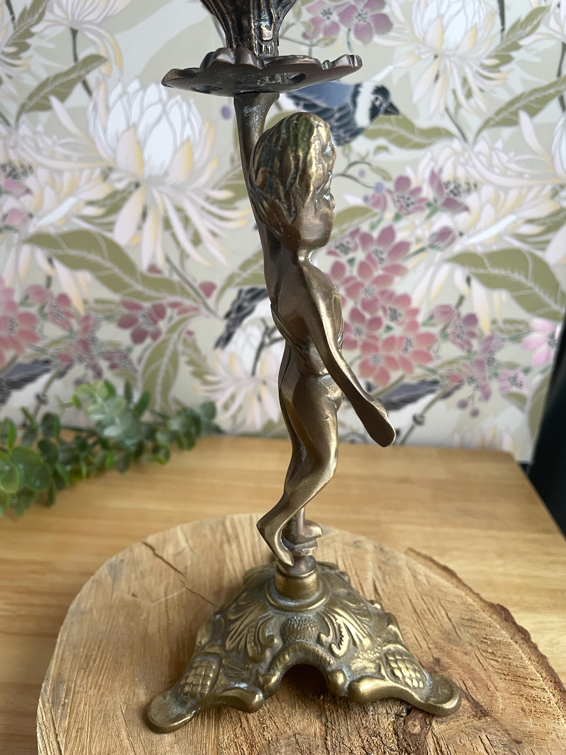 Lovely vintage brass candleholder of a little cherub-- putto-- running with a torch that holds a taper candle. This mid century piece has lovely patina and originates in Europe, either France, Italy or Hungary. There are 2 available. They are sold separately.