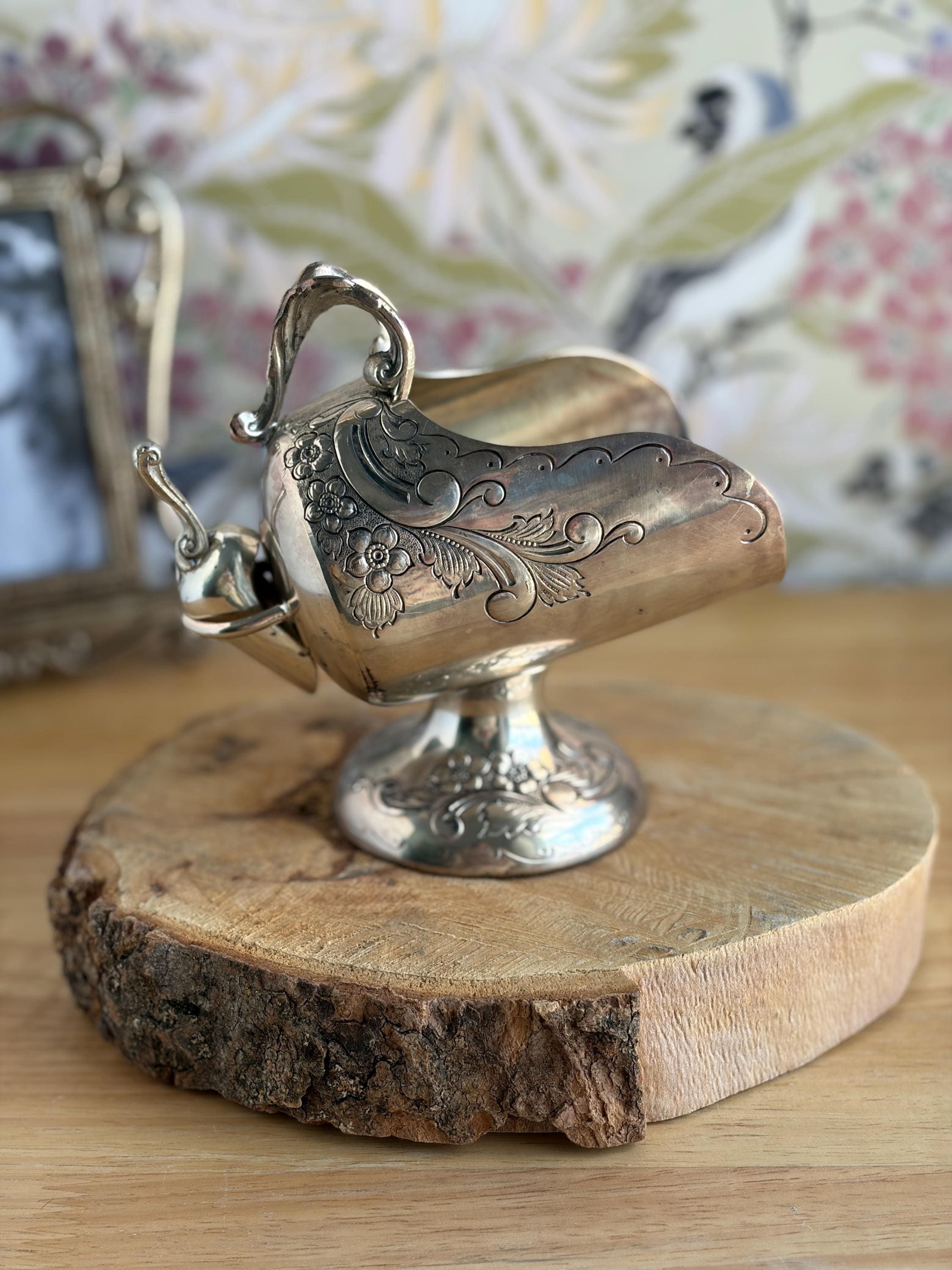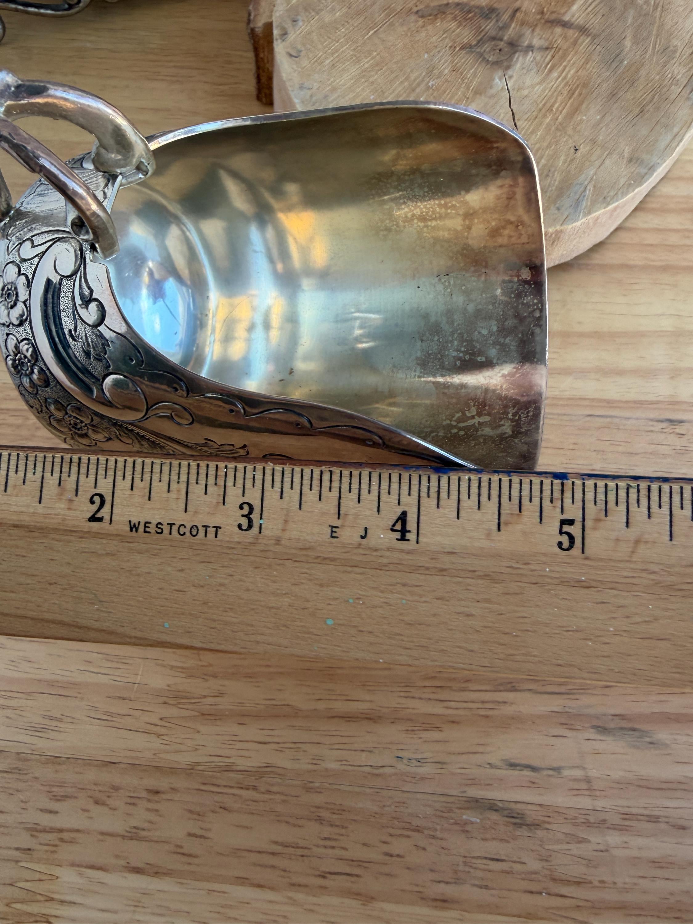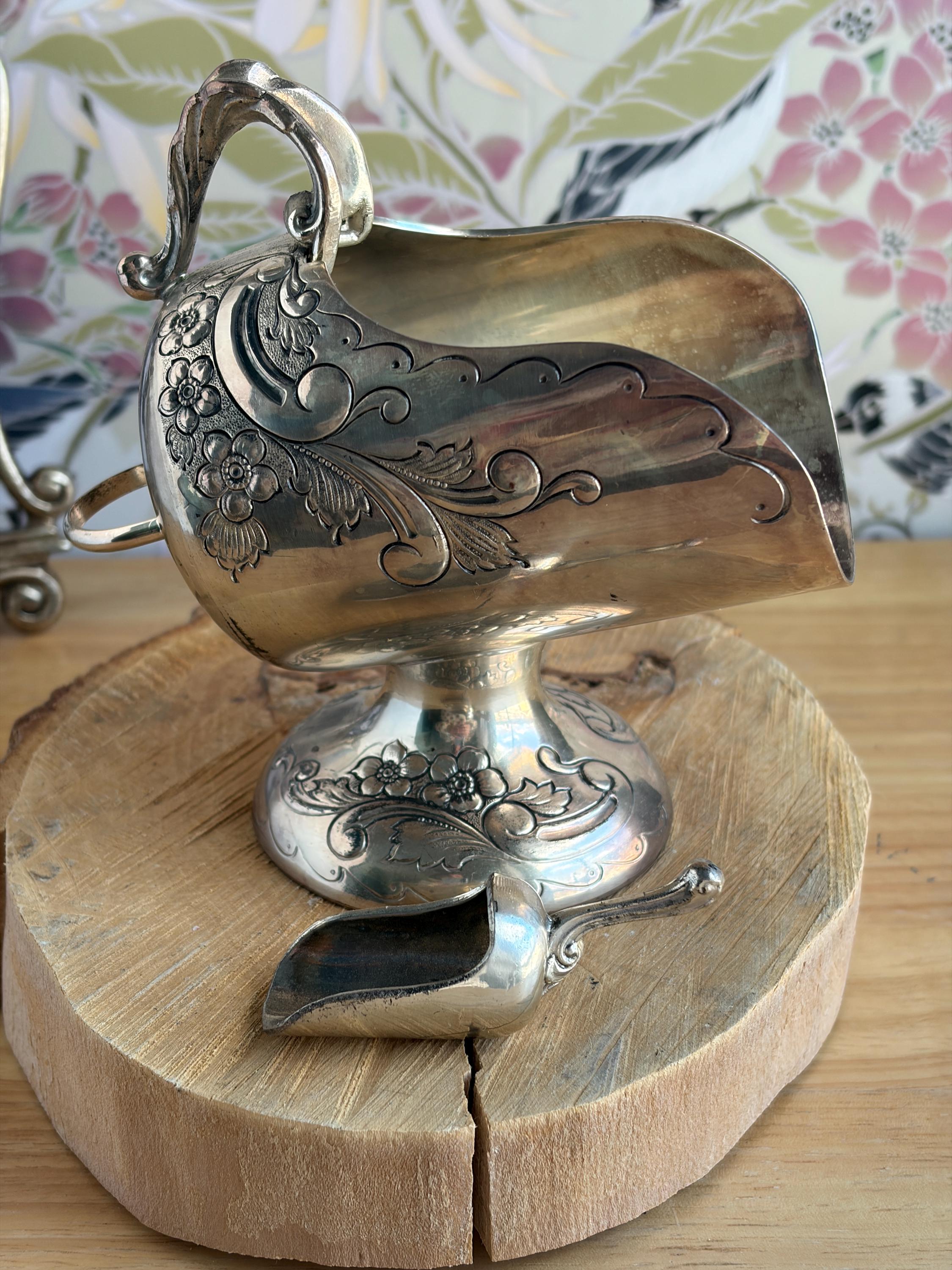 Lovely silver plated vintage sugar scuttle with small scoop. This would be a beautiful addition to your coffee routine, but it can also be used in creative ways, such as, to hold your bath salts, mints for after dinner, to hold jewelry or small trinkets on your vanity or sink, and many other ideas.
