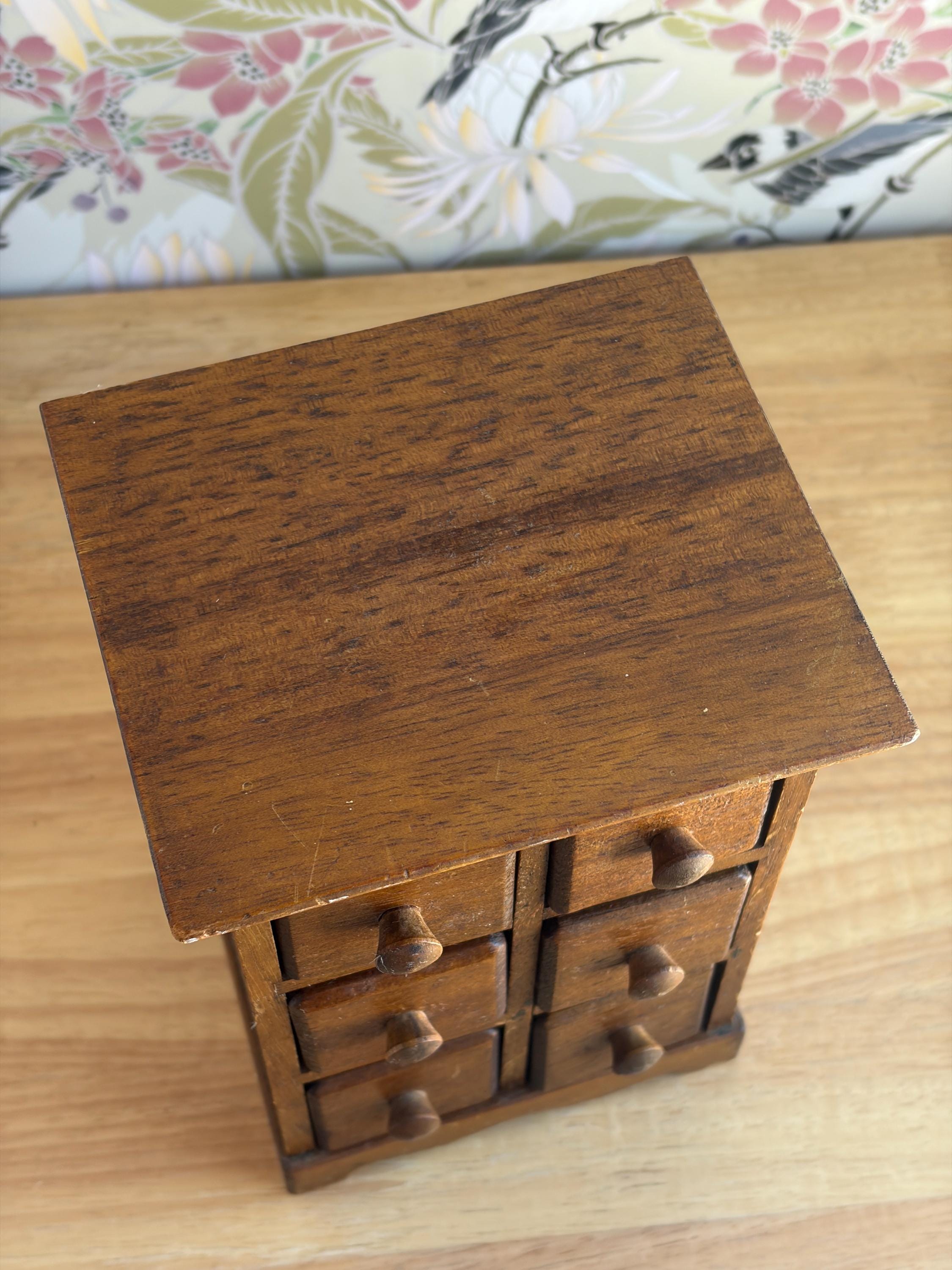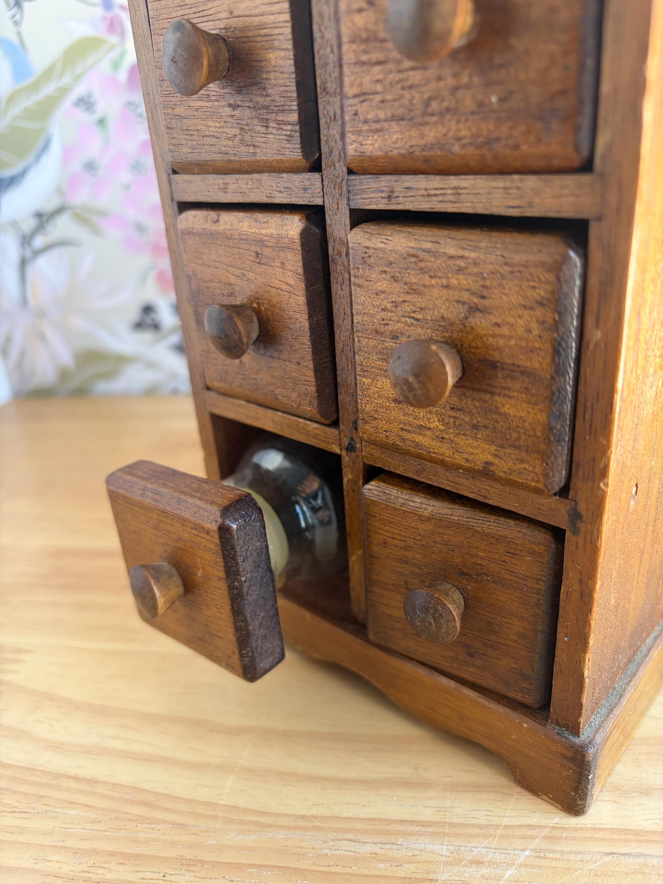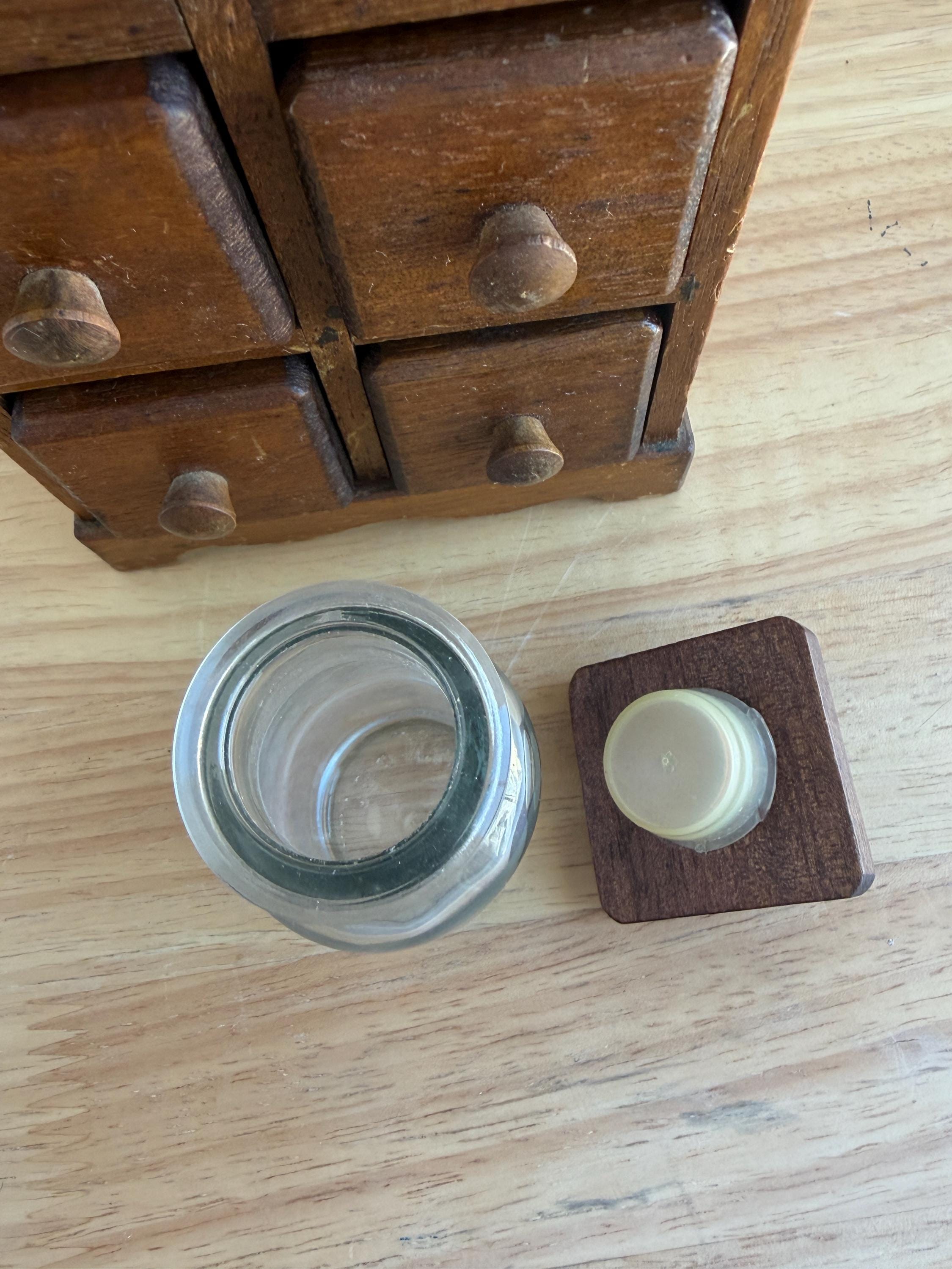 Adorable countertop apothecary spice cabinet with six jars attached to the wood caps to form the drawer fronts. This could easily be used as a craft storage for beads or jewelry projects, sewing bits or bath salts. Made of solid wood. Jars are 3 1/2 inches tall with plastic sealsattached to the wood tops.