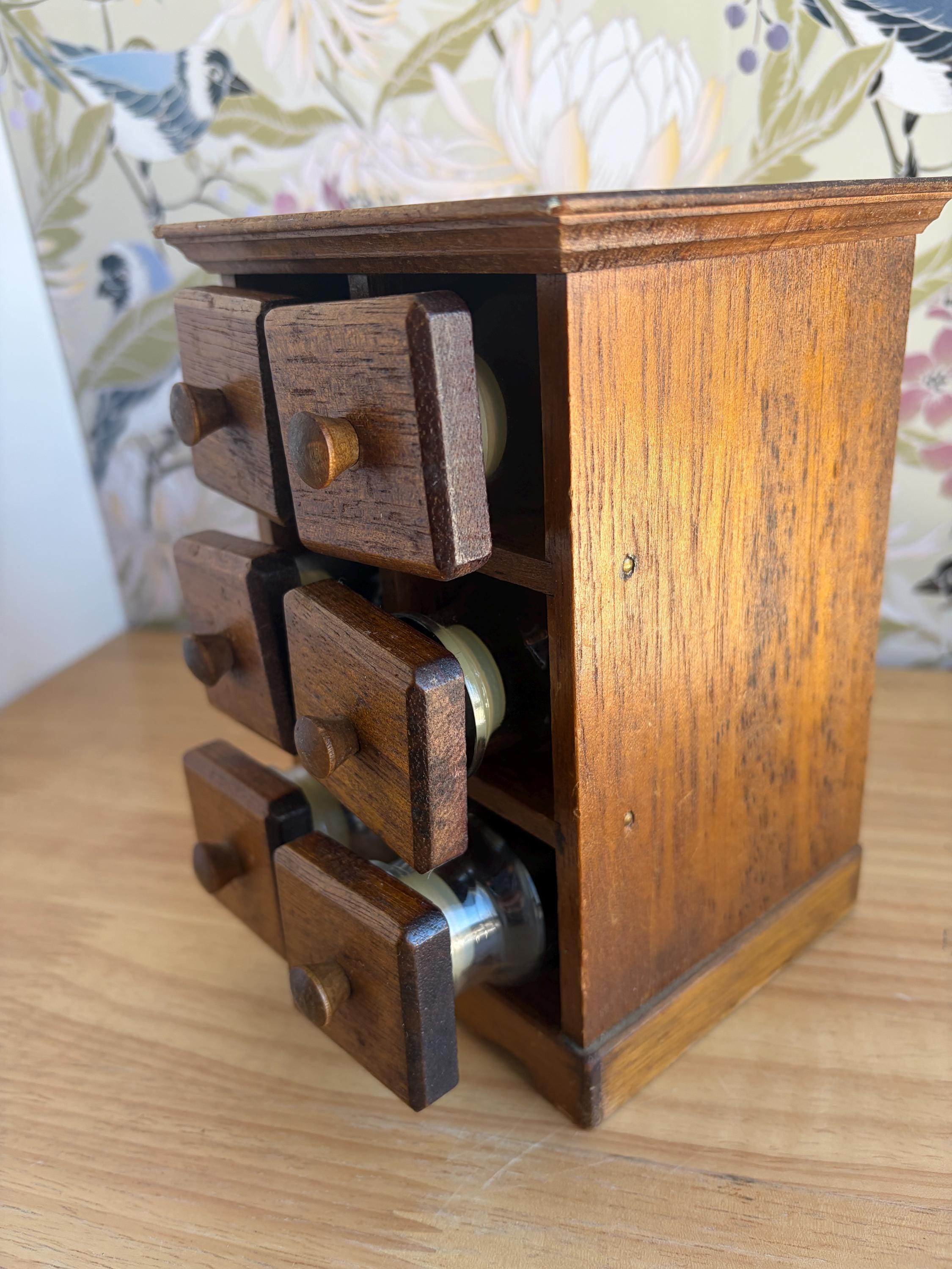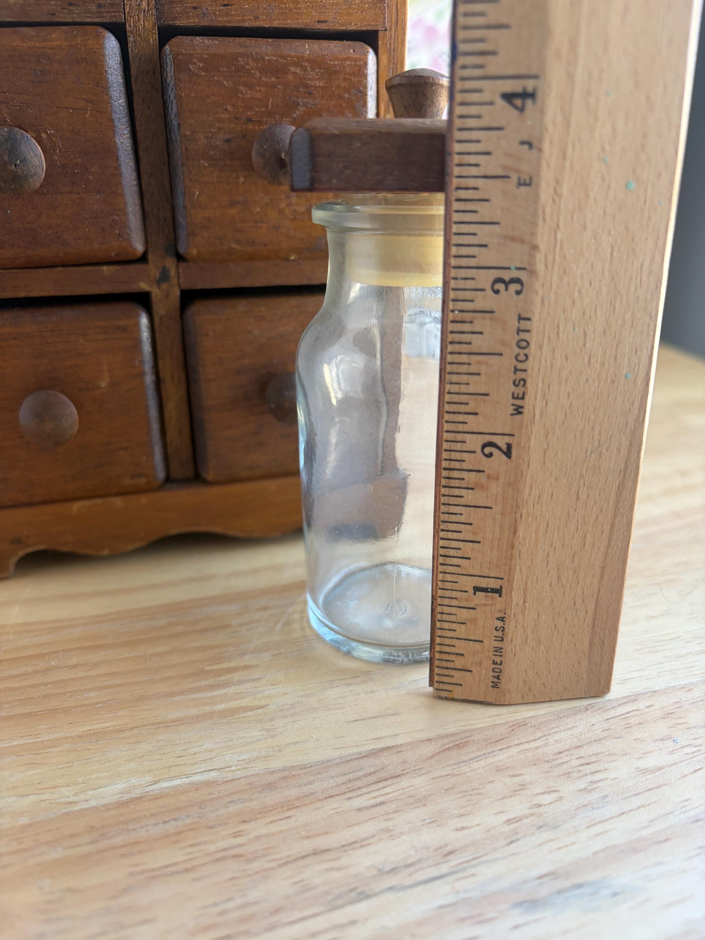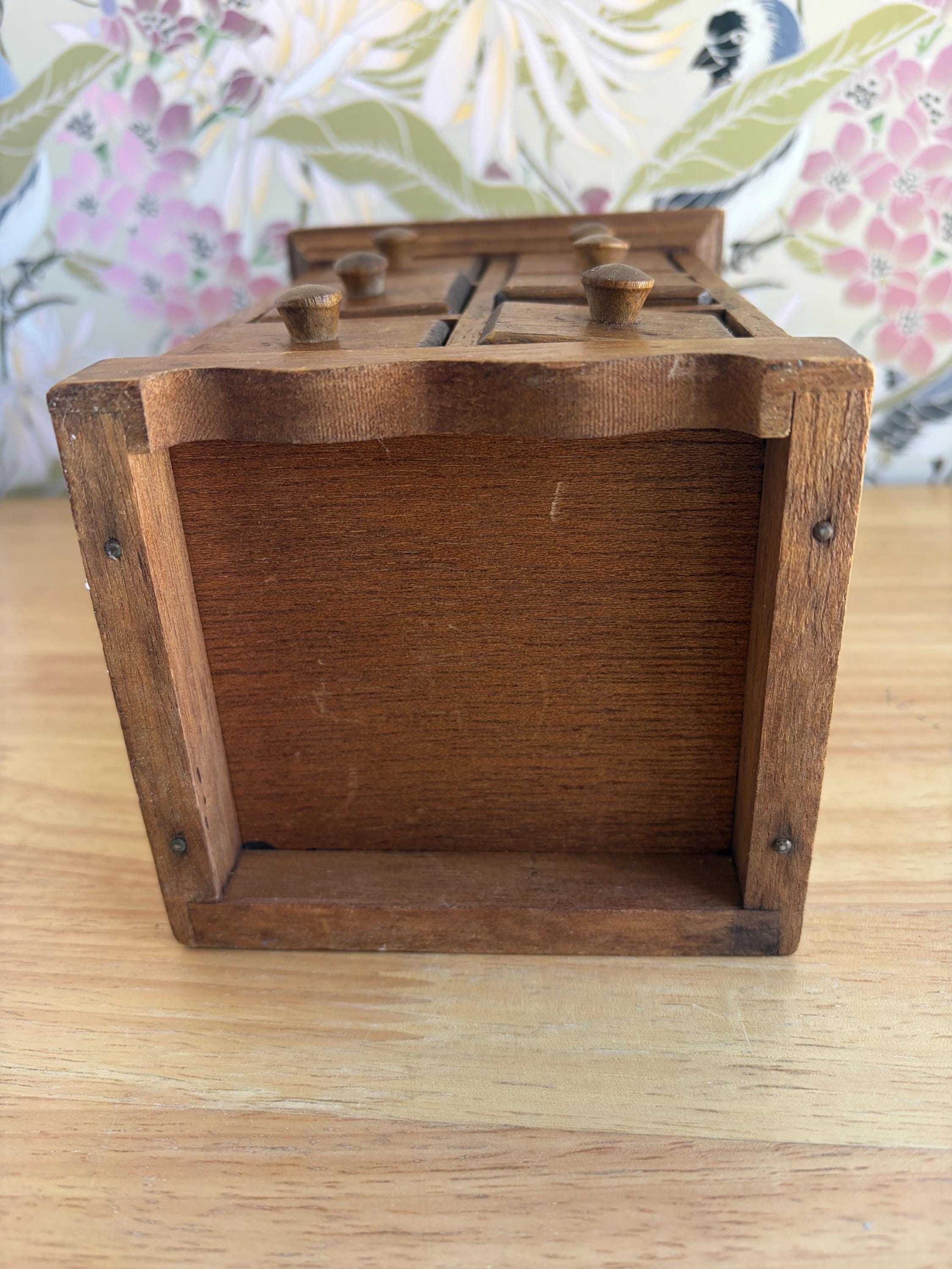 Adorable countertop apothecary spice cabinet with six jars attached to the wood caps to form the drawer fronts. This could easily be used as a craft storage for beads or jewelry projects, sewing bits or bath salts. Made of solid wood. Jars are 3 1/2 inches tall with plastic sealsattached to the wood tops.