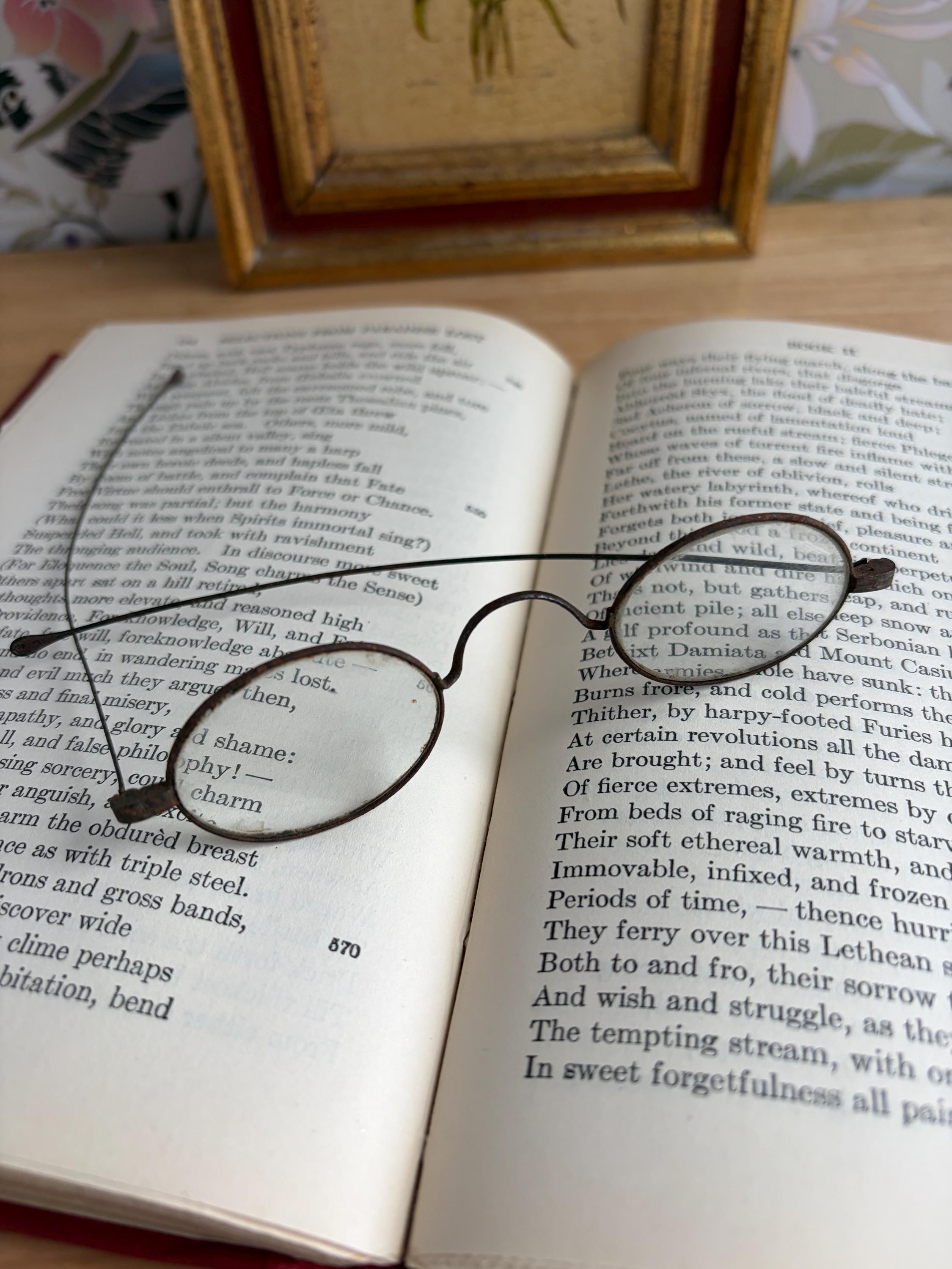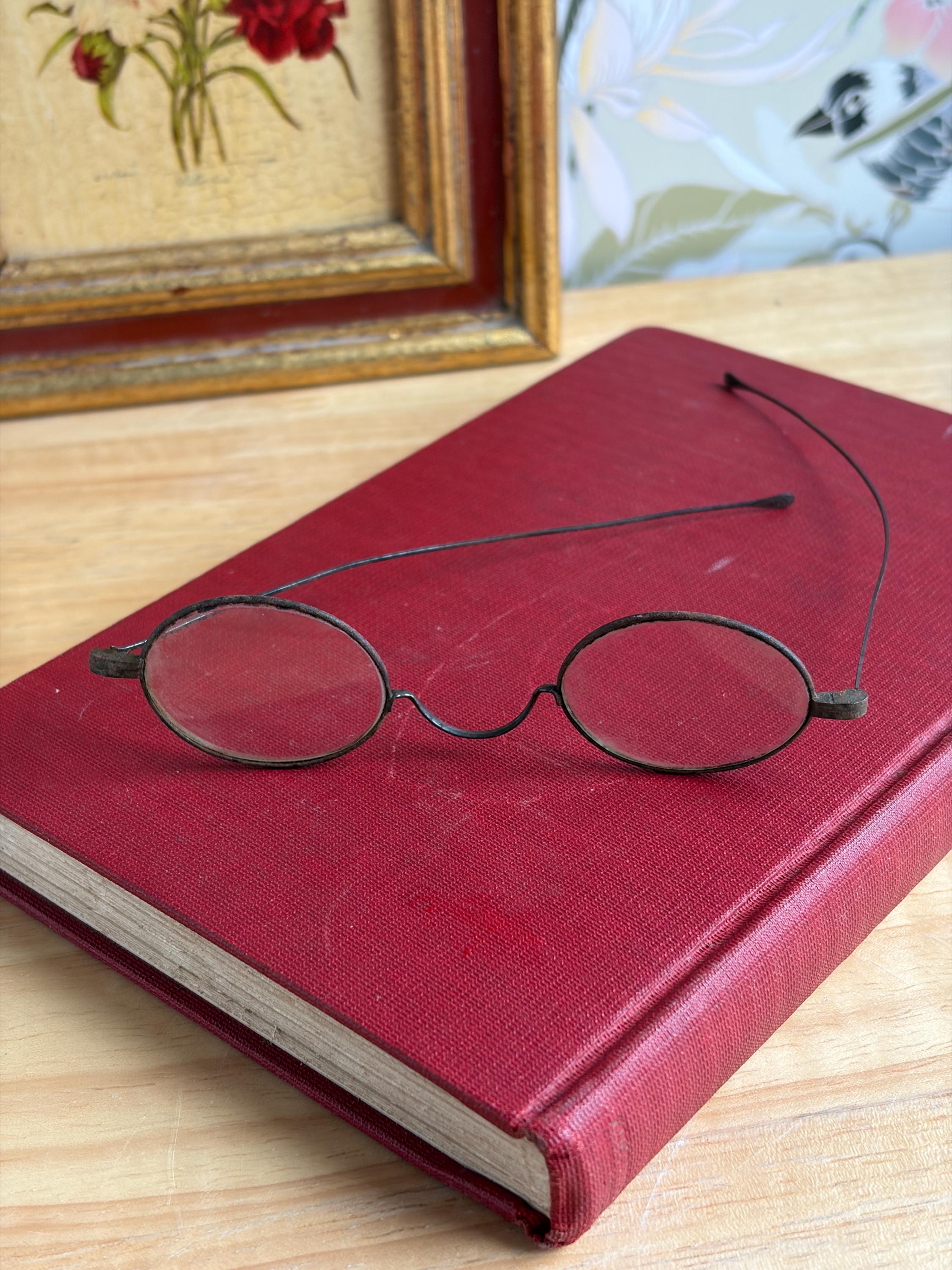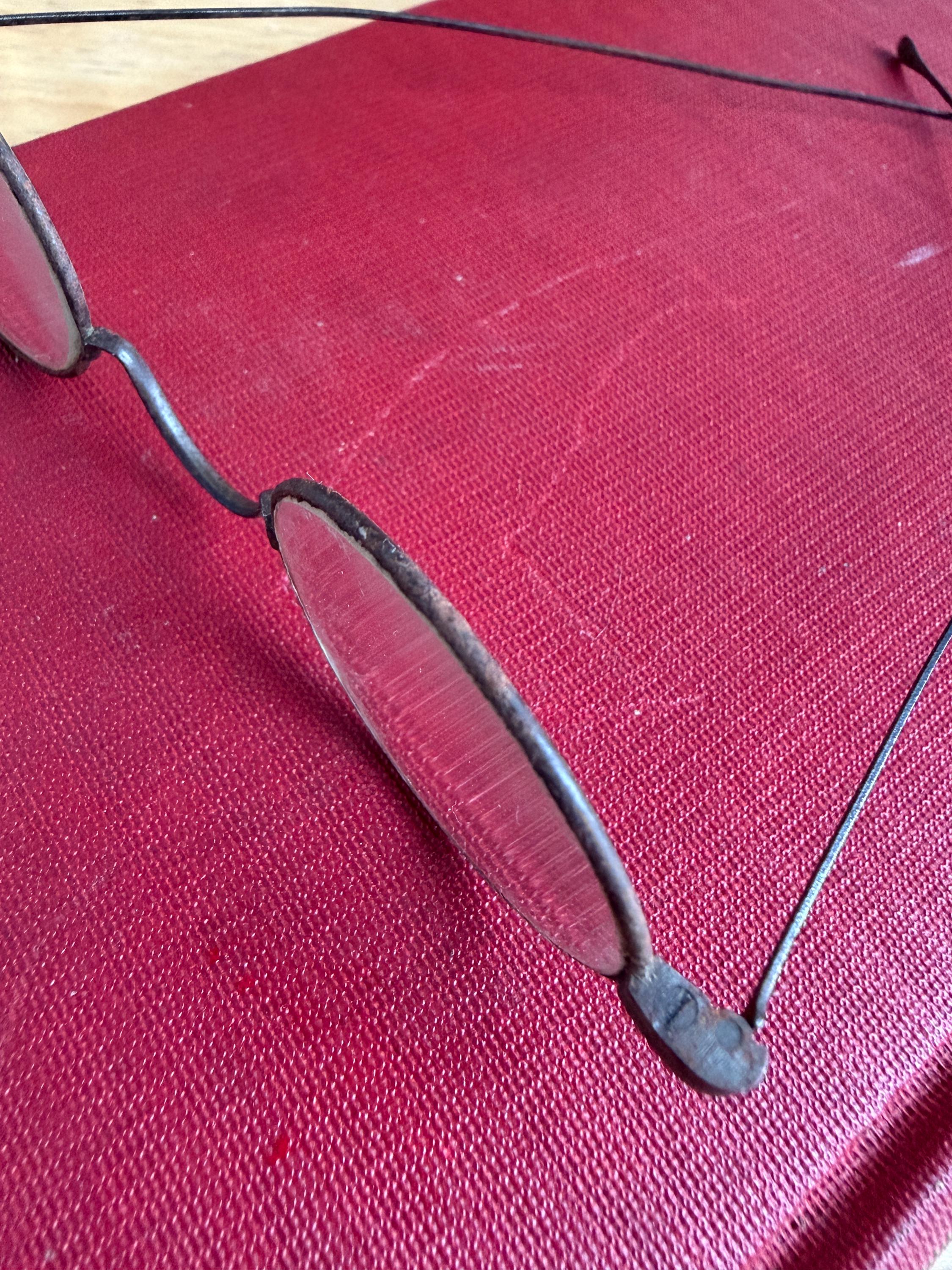 Antique Victorian Era wire-rimmed tinted spectacles for use as part of a costume or to decorate your shelves. The glass in the round frames is reminiscent of Ben Franklin or Grover Cleveland style glasses and may be only standard glass with either no prescription for reading or very low. The metal wire arms are relatively straight and fold closed easily.