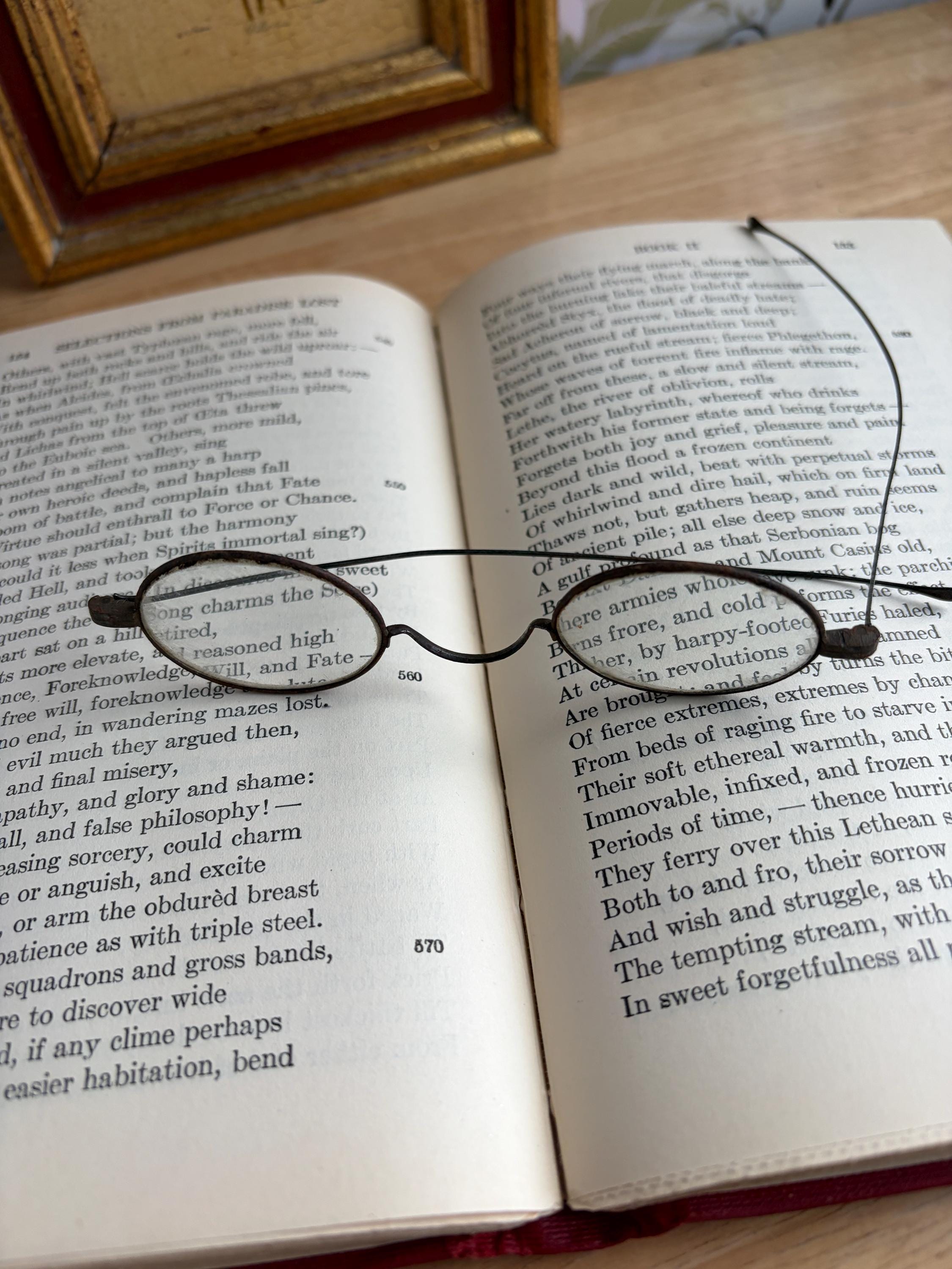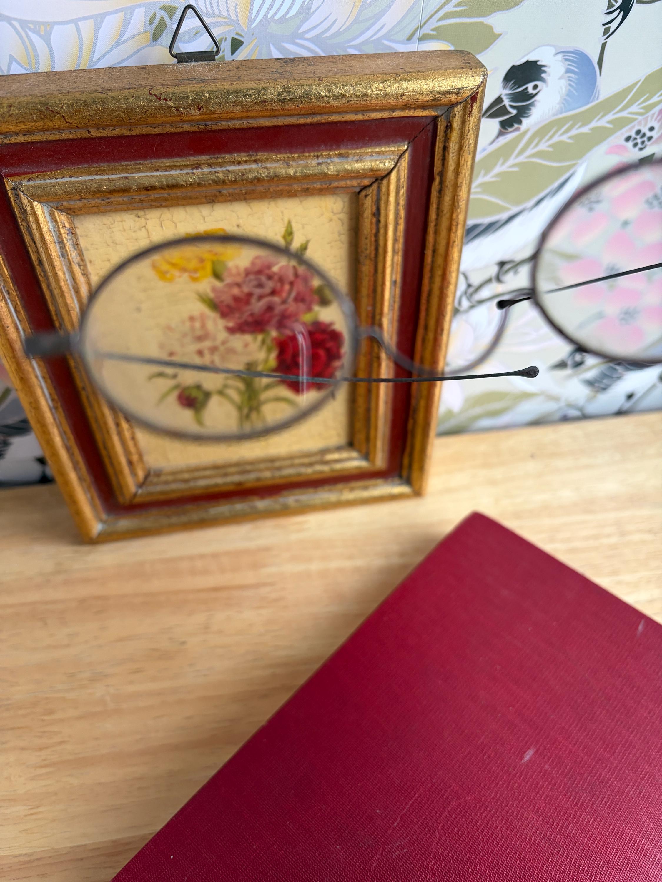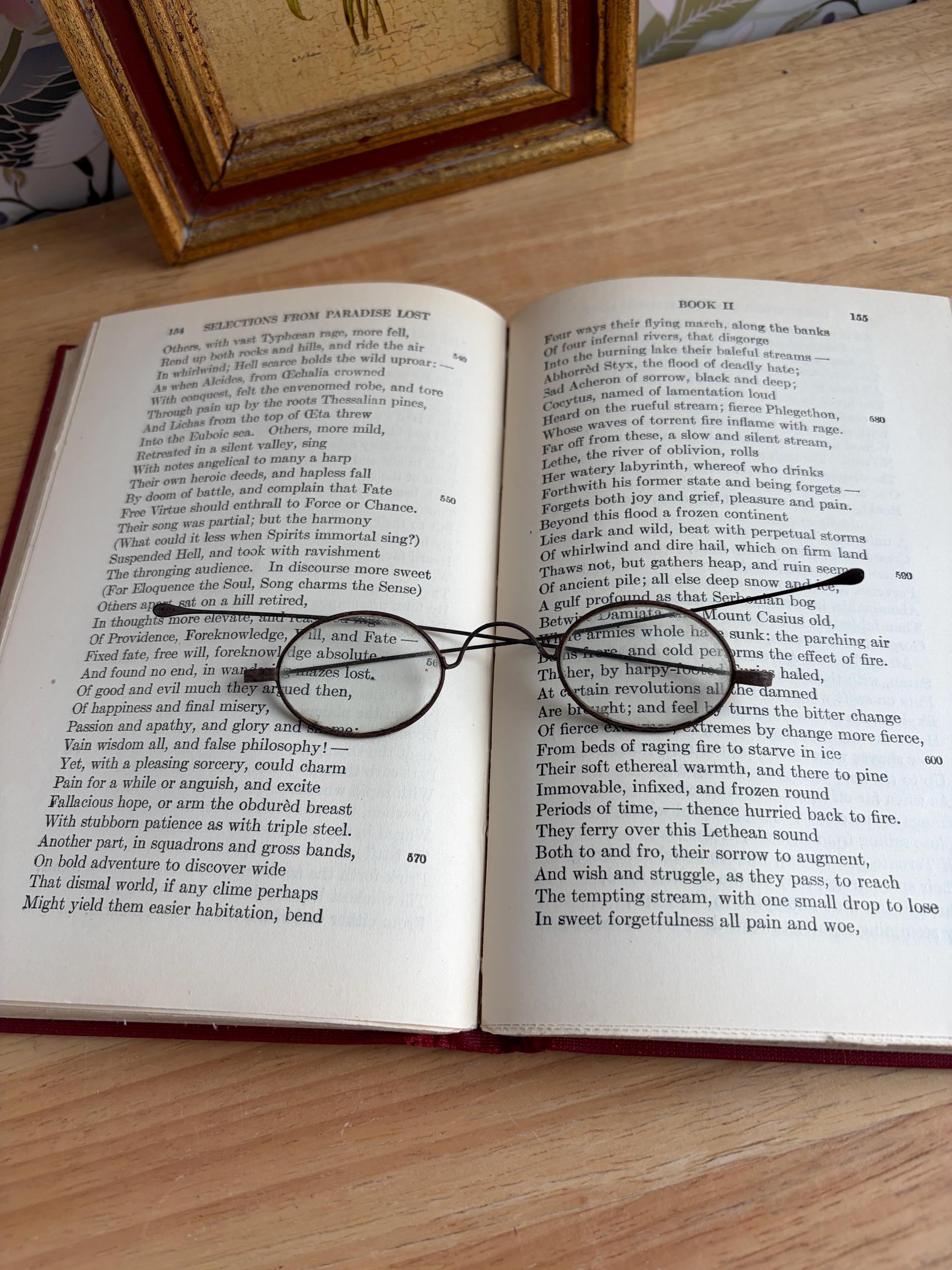 Antique Victorian Era wire-rimmed tinted spectacles for use as part of a costume or to decorate your shelves. The glass in the round frames is reminiscent of Ben Franklin or Grover Cleveland style glasses and may be only standard glass with either no prescription for reading or very low. The metal wire arms are relatively straight and fold closed easily.