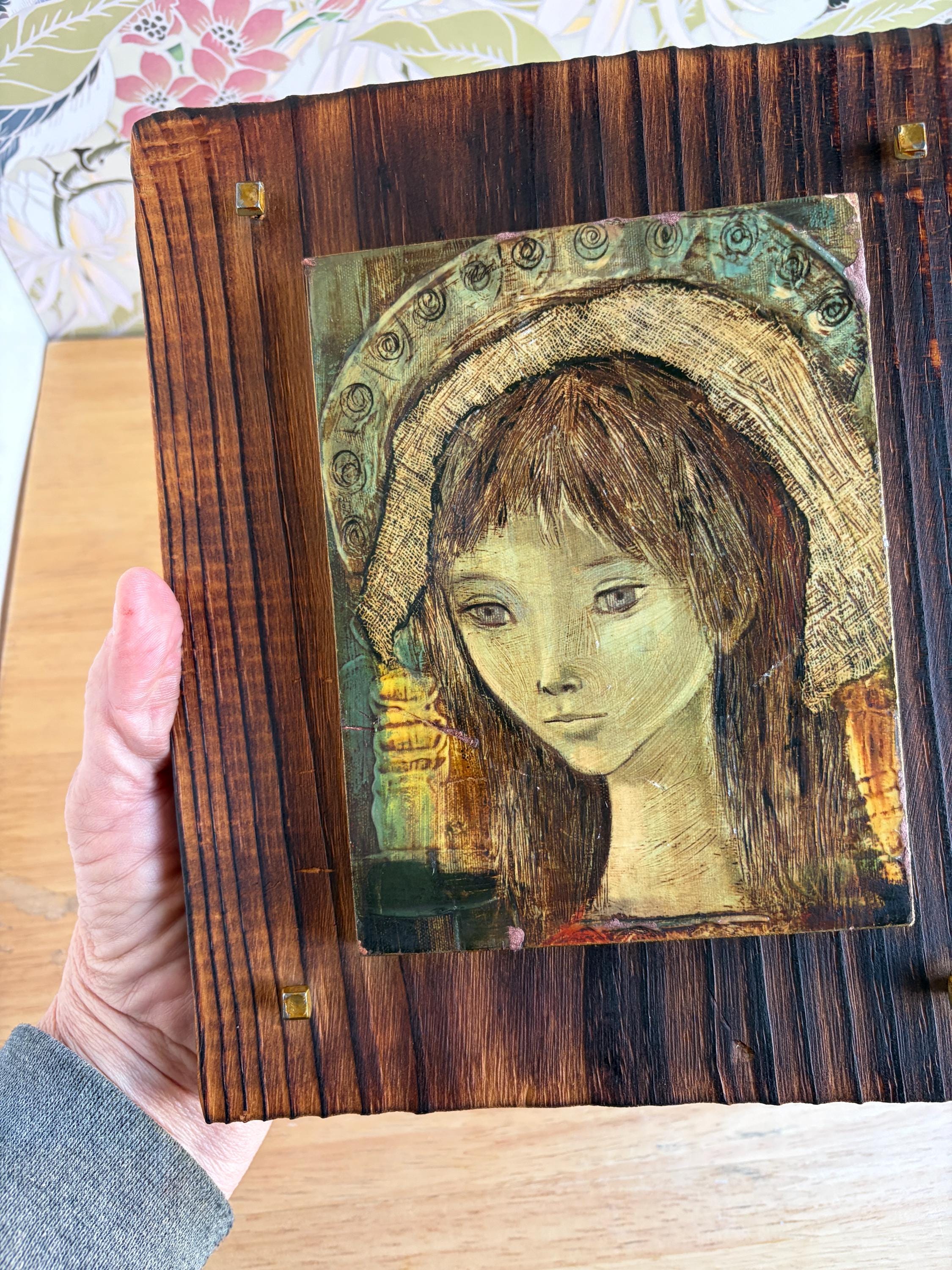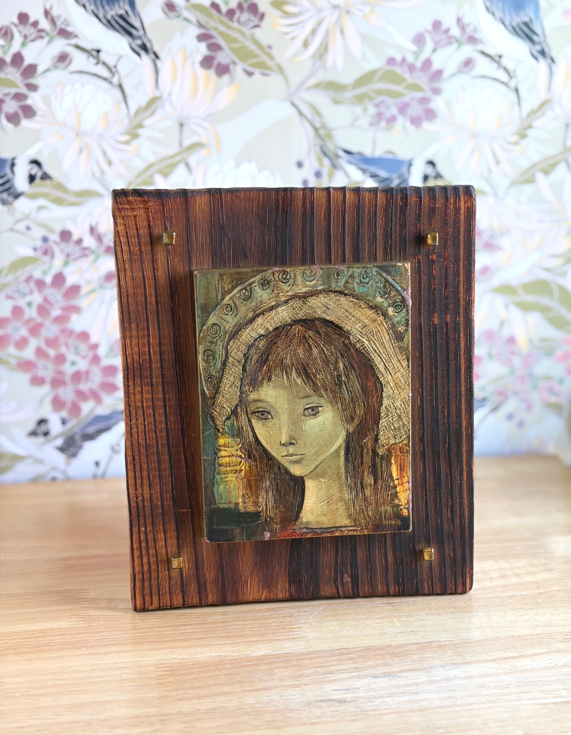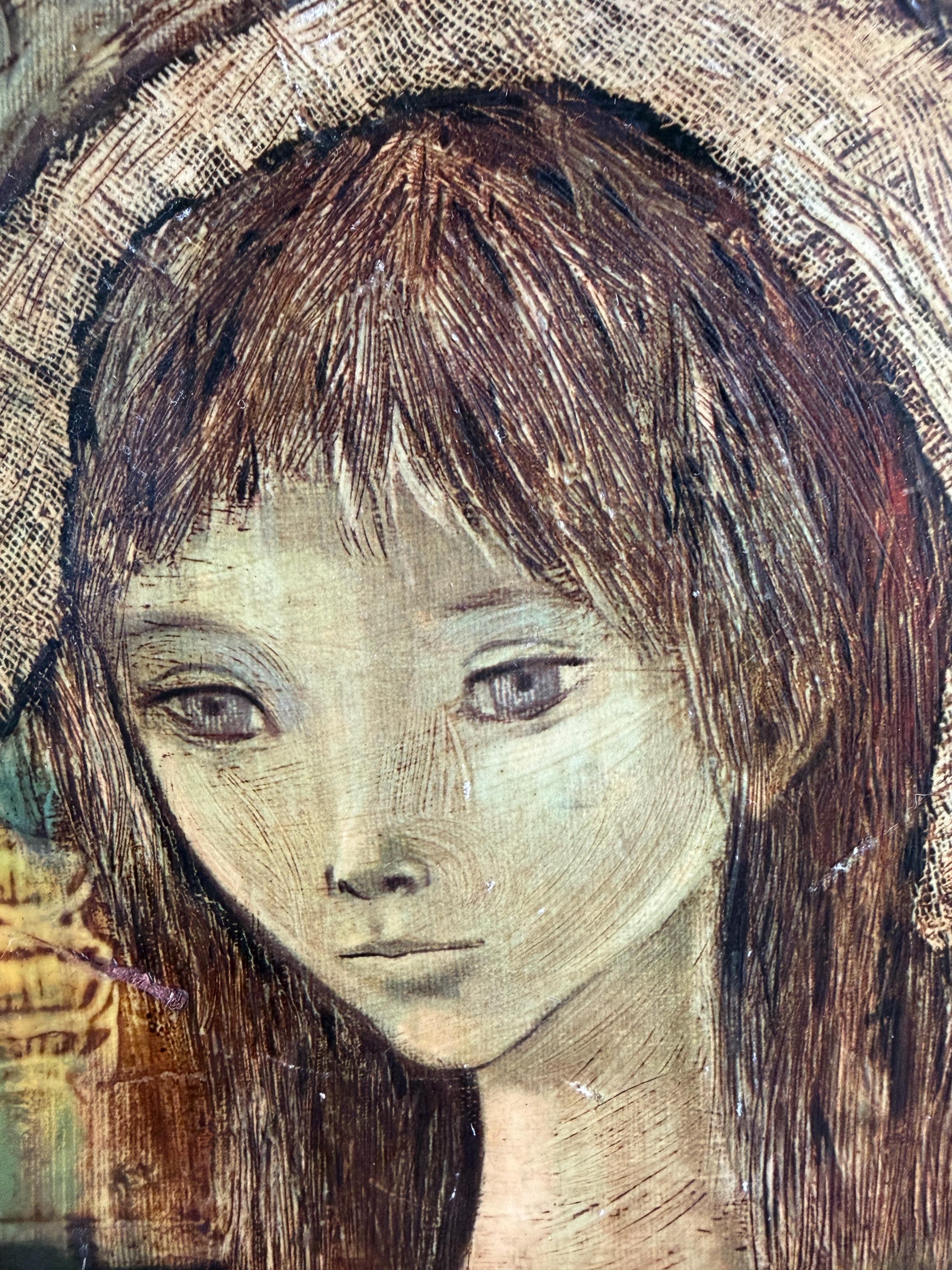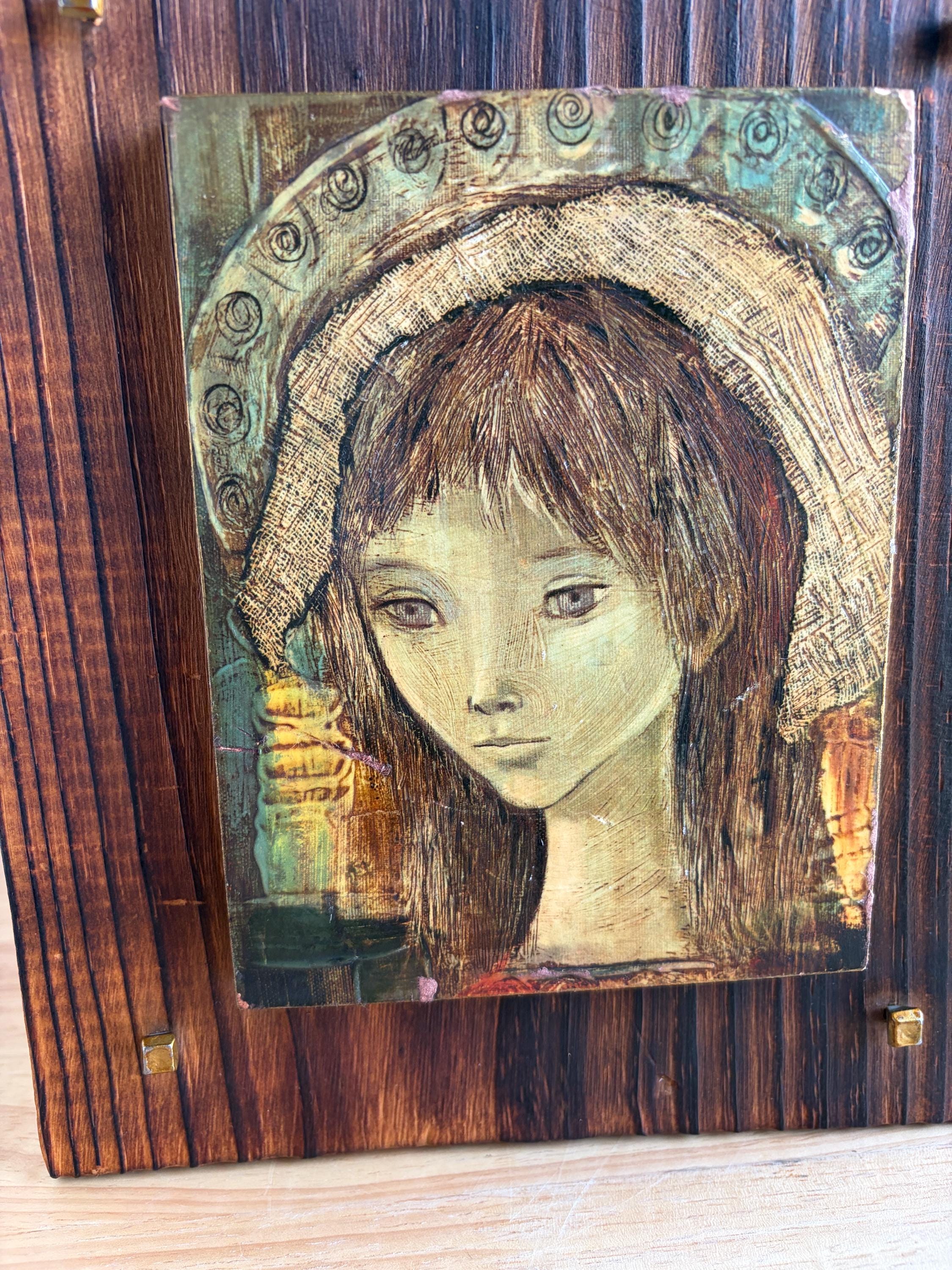 Vintage giclee on board of Spanish artist Rose Agell’s “Madonna.” This is a beautiful and moody piece of brutalist art that would be an amazing addition to a gallery wall or bookshelves. Board is 8 by 9 inches and the giclee on board is approximately 6 by 7 inches.