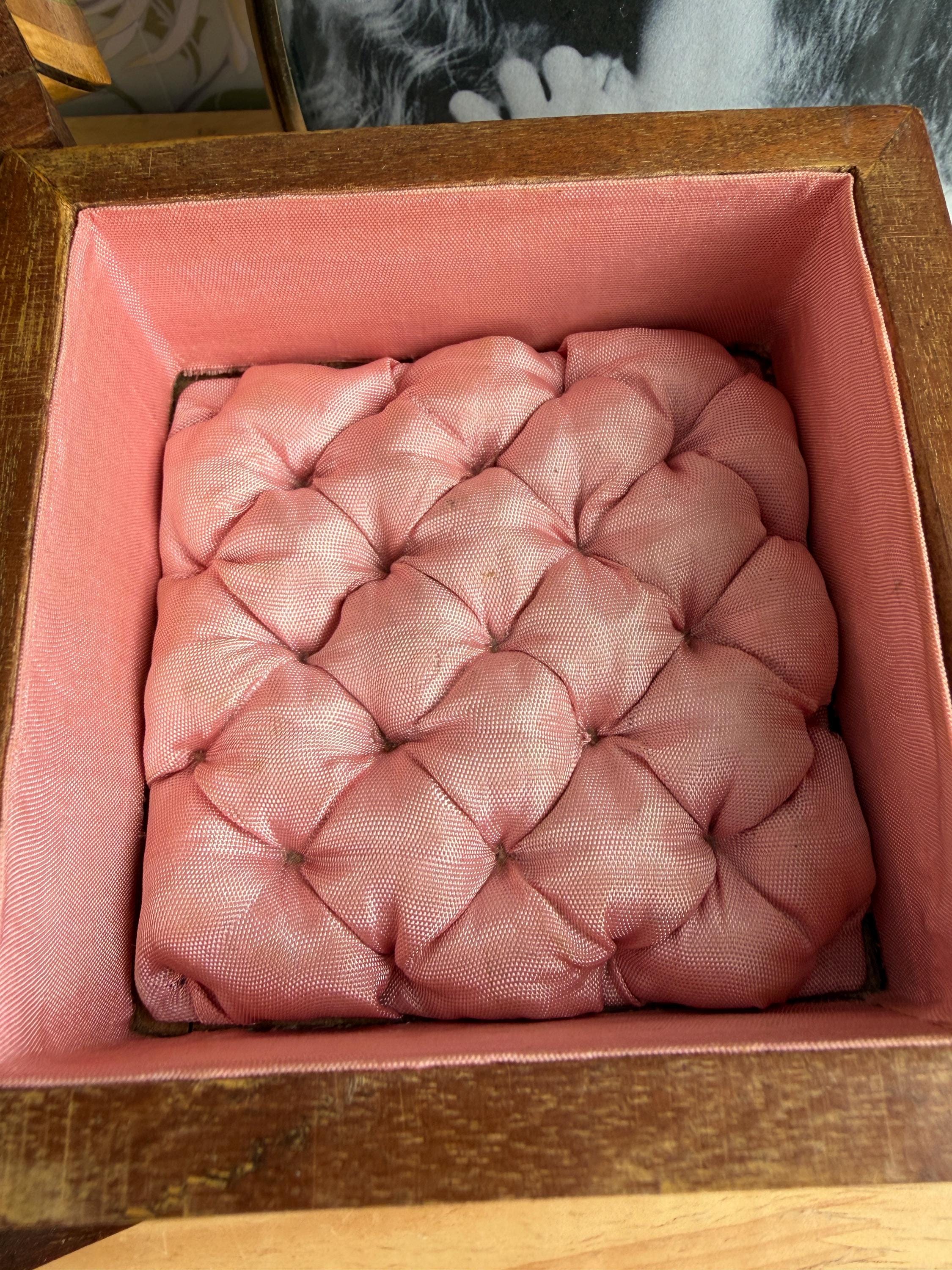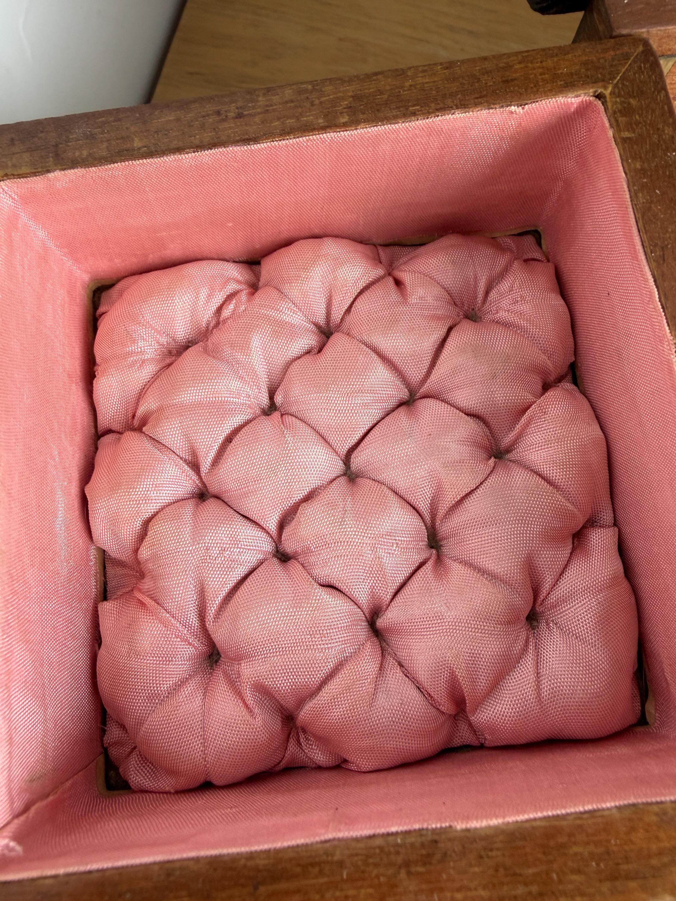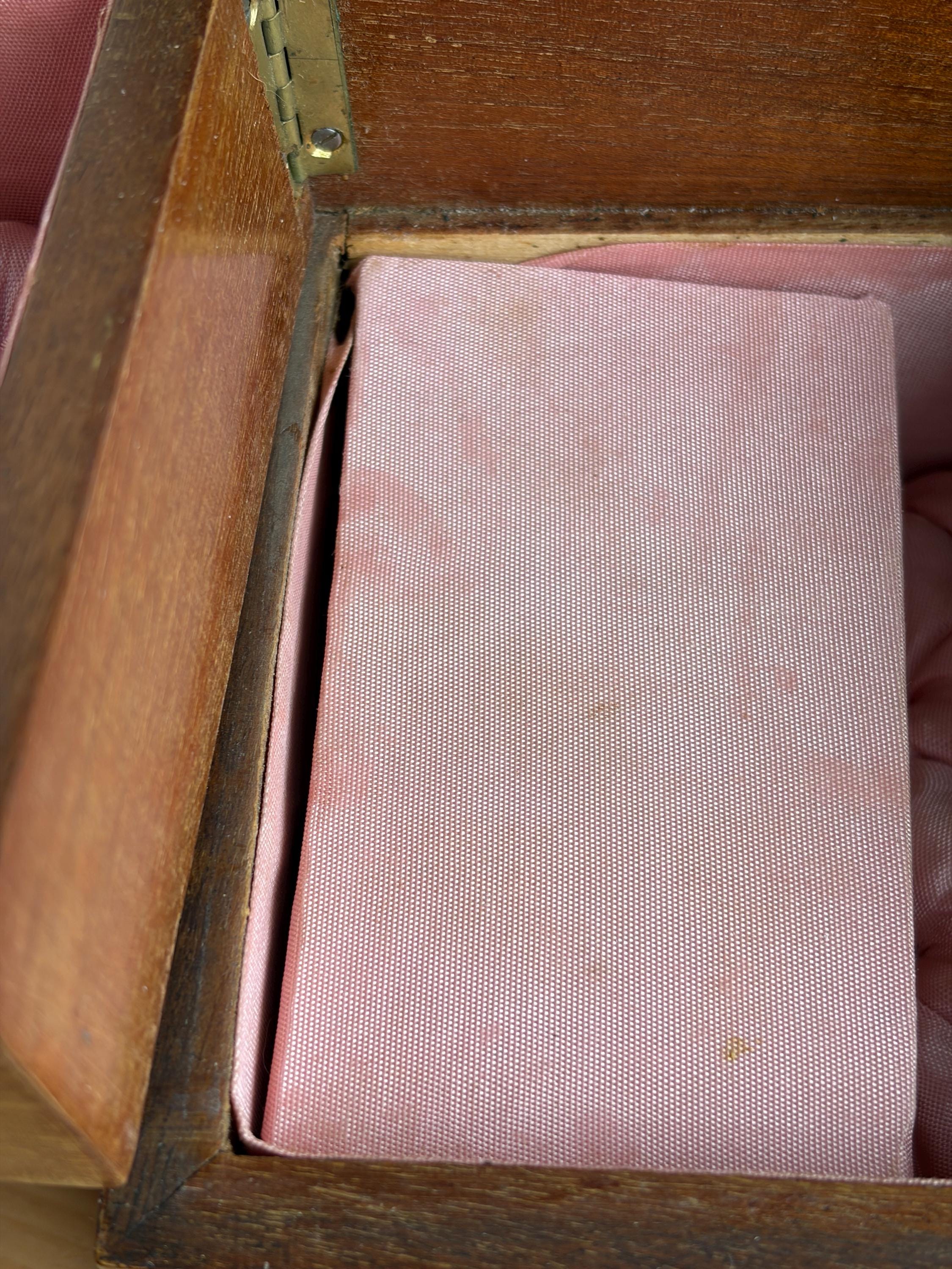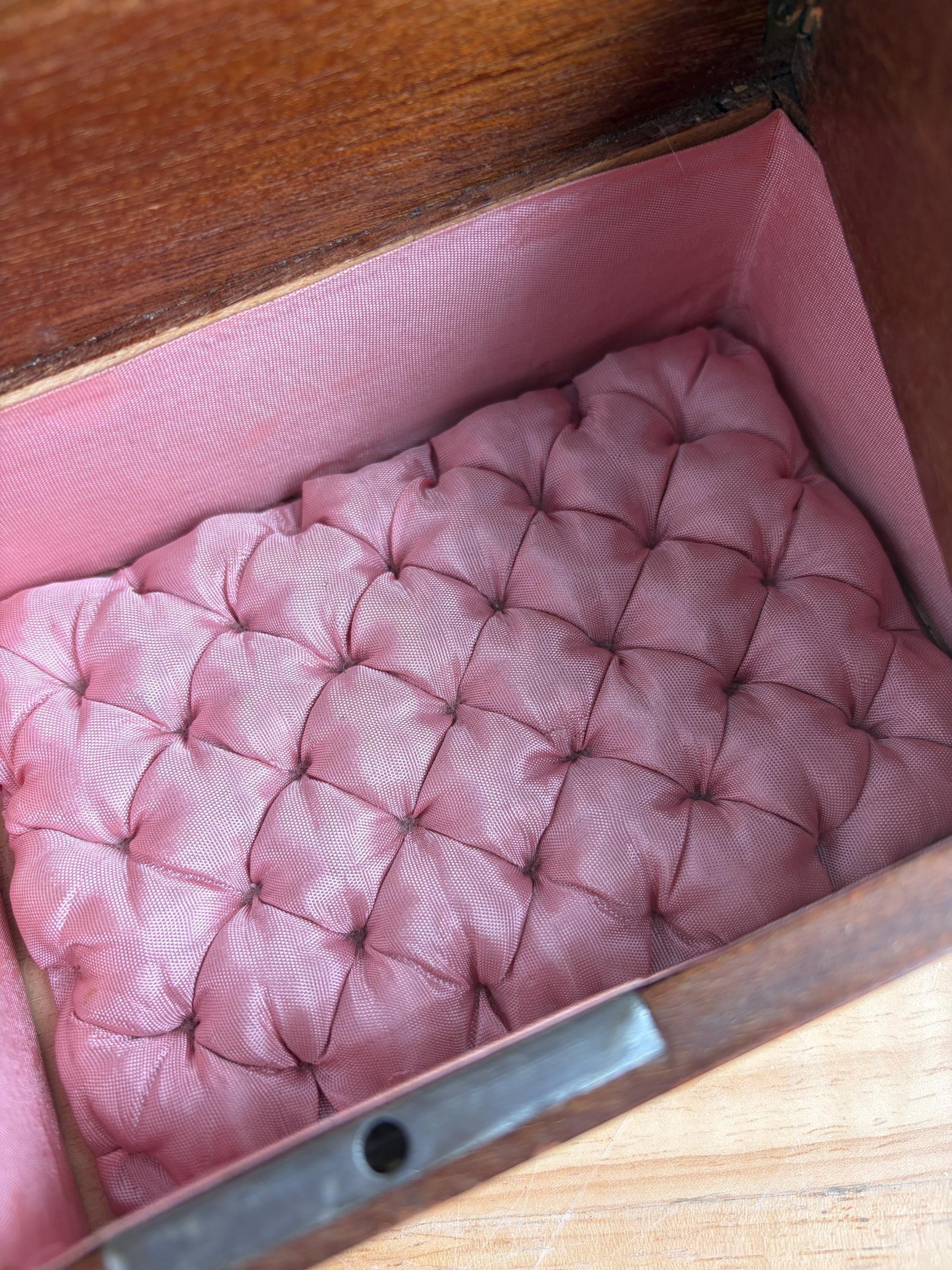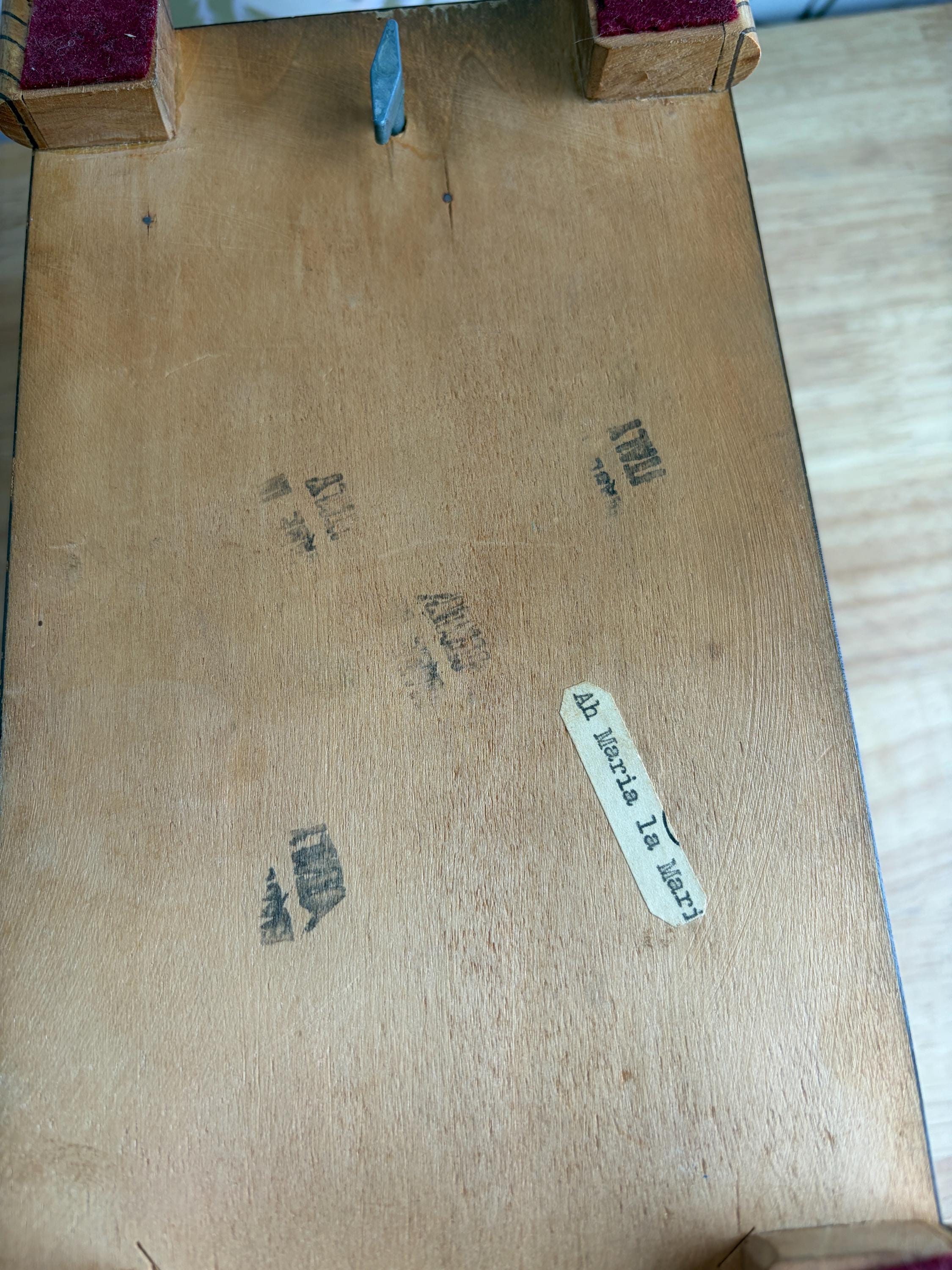 There is some minor spotting on the satin in the bottom section of the box and the satin lining is pulling slightly away from the side where the cover to the music box is. The music plays “Ah Maria” (see stamp on bottom).