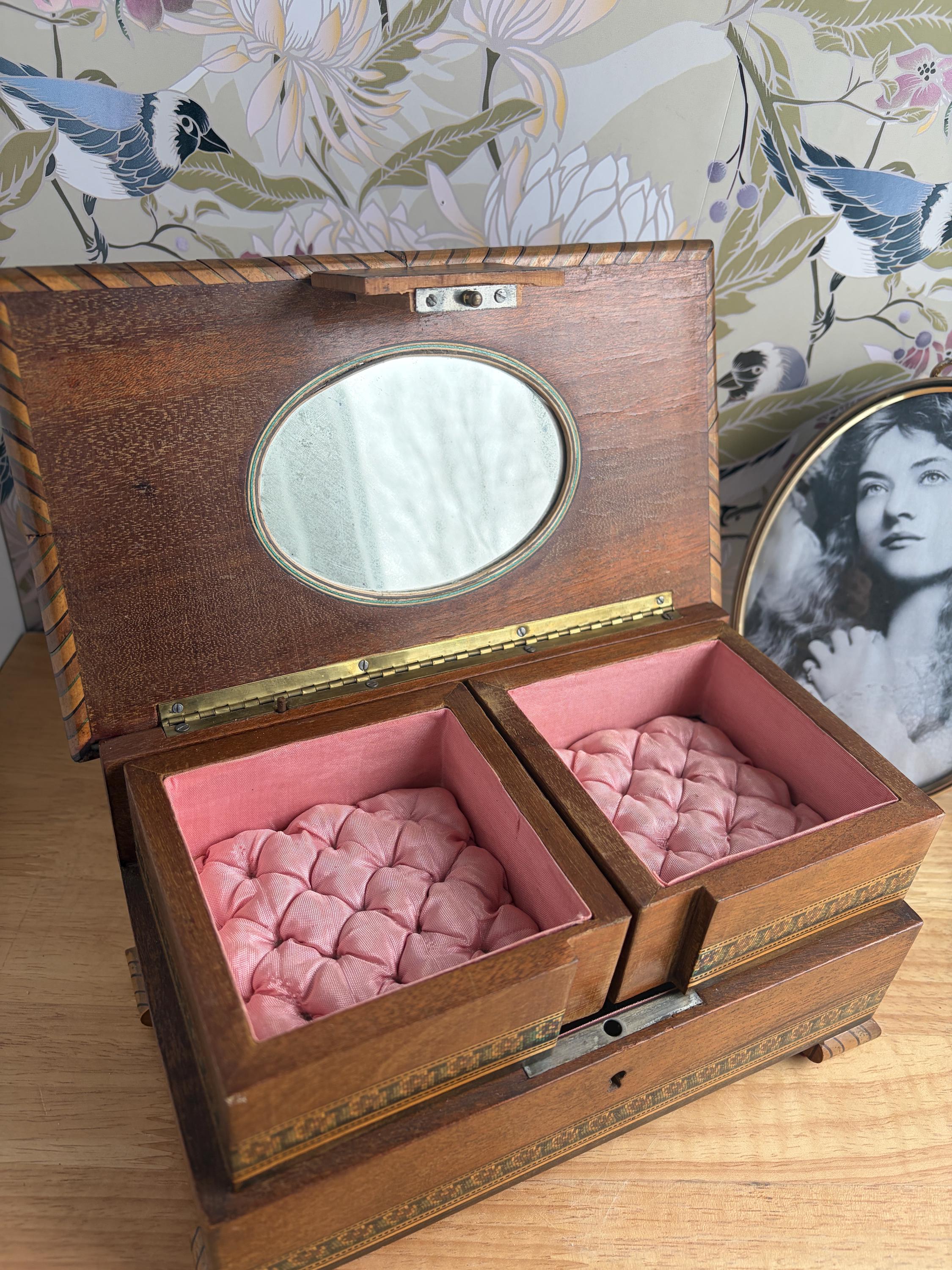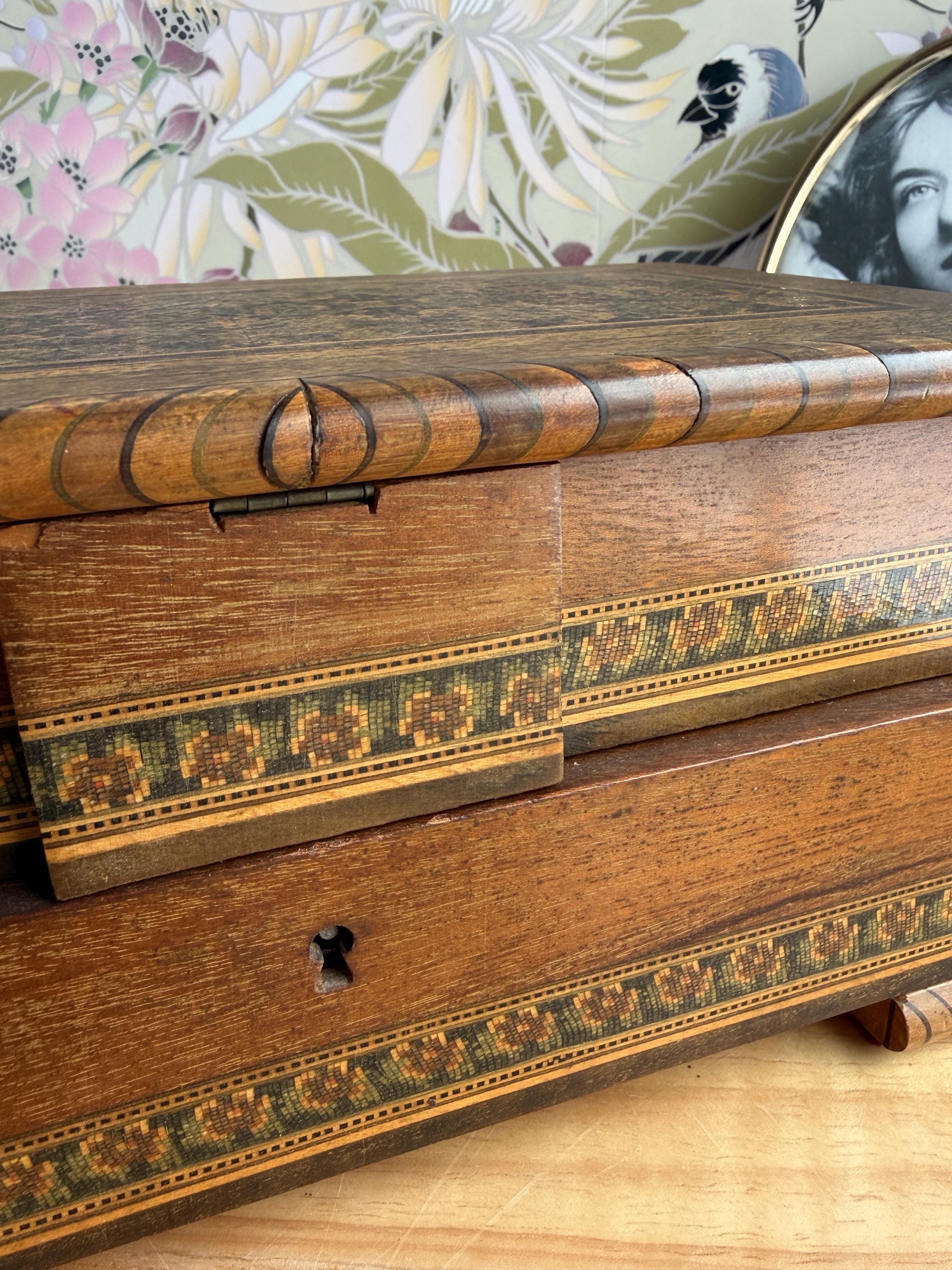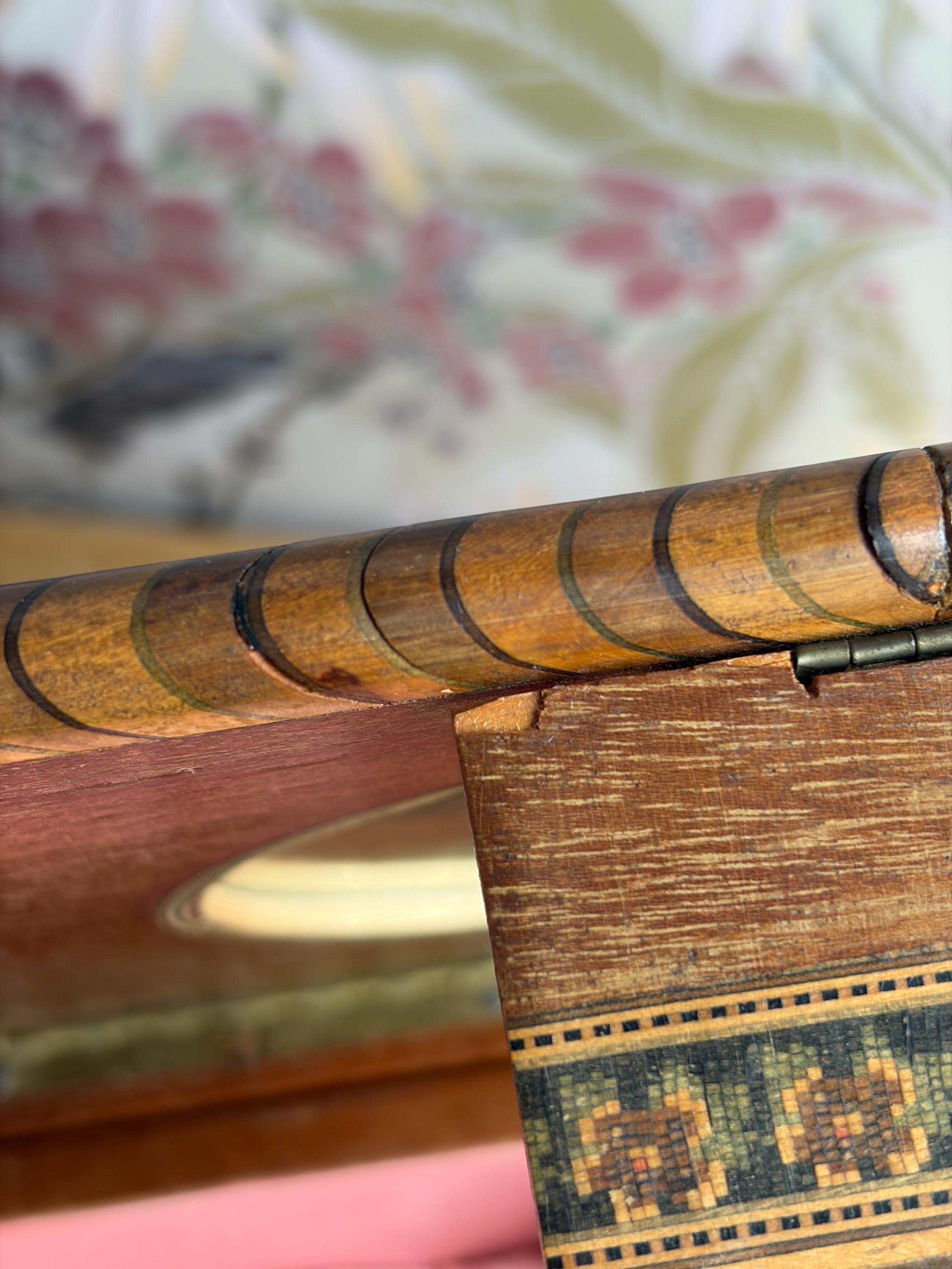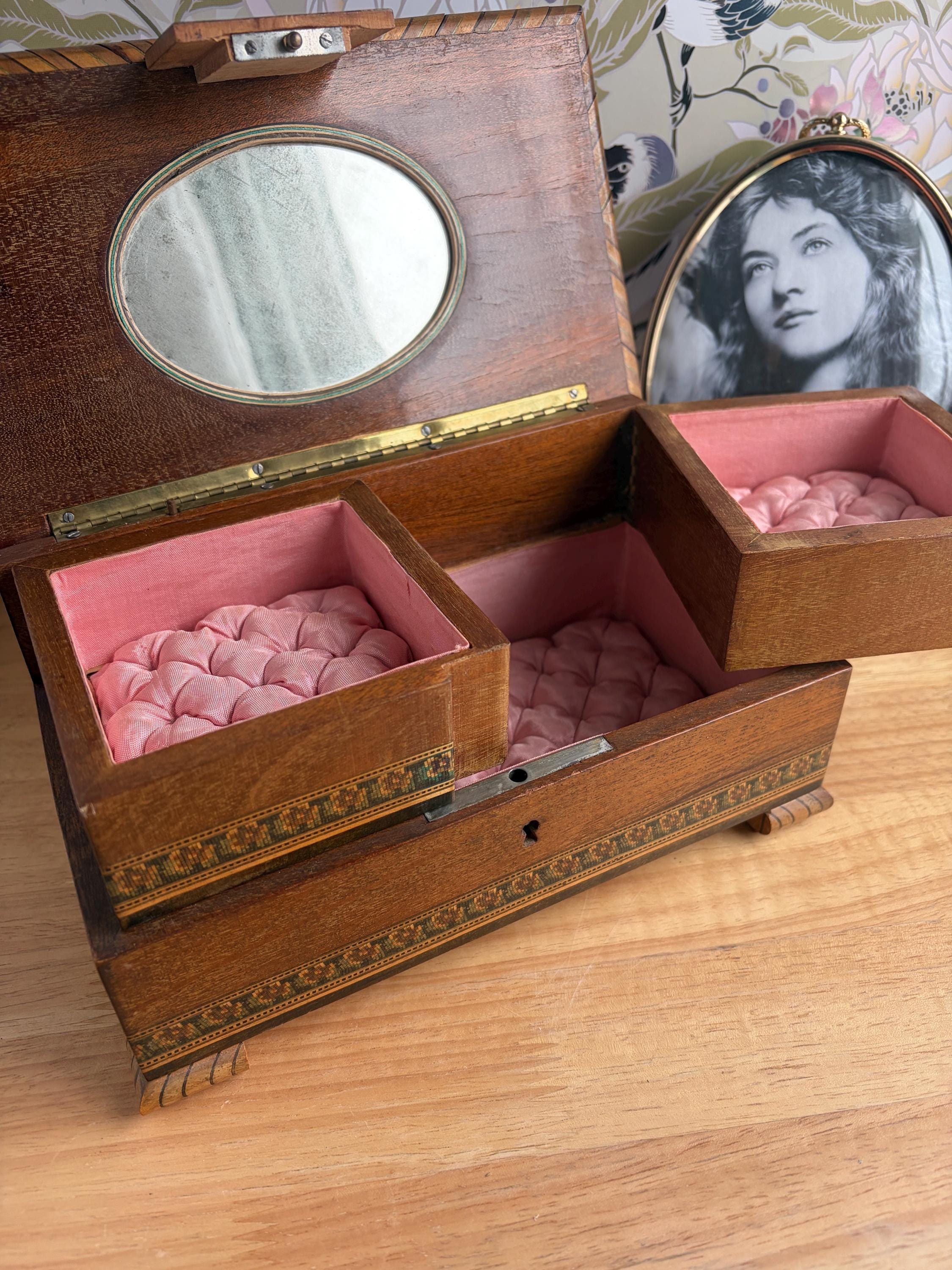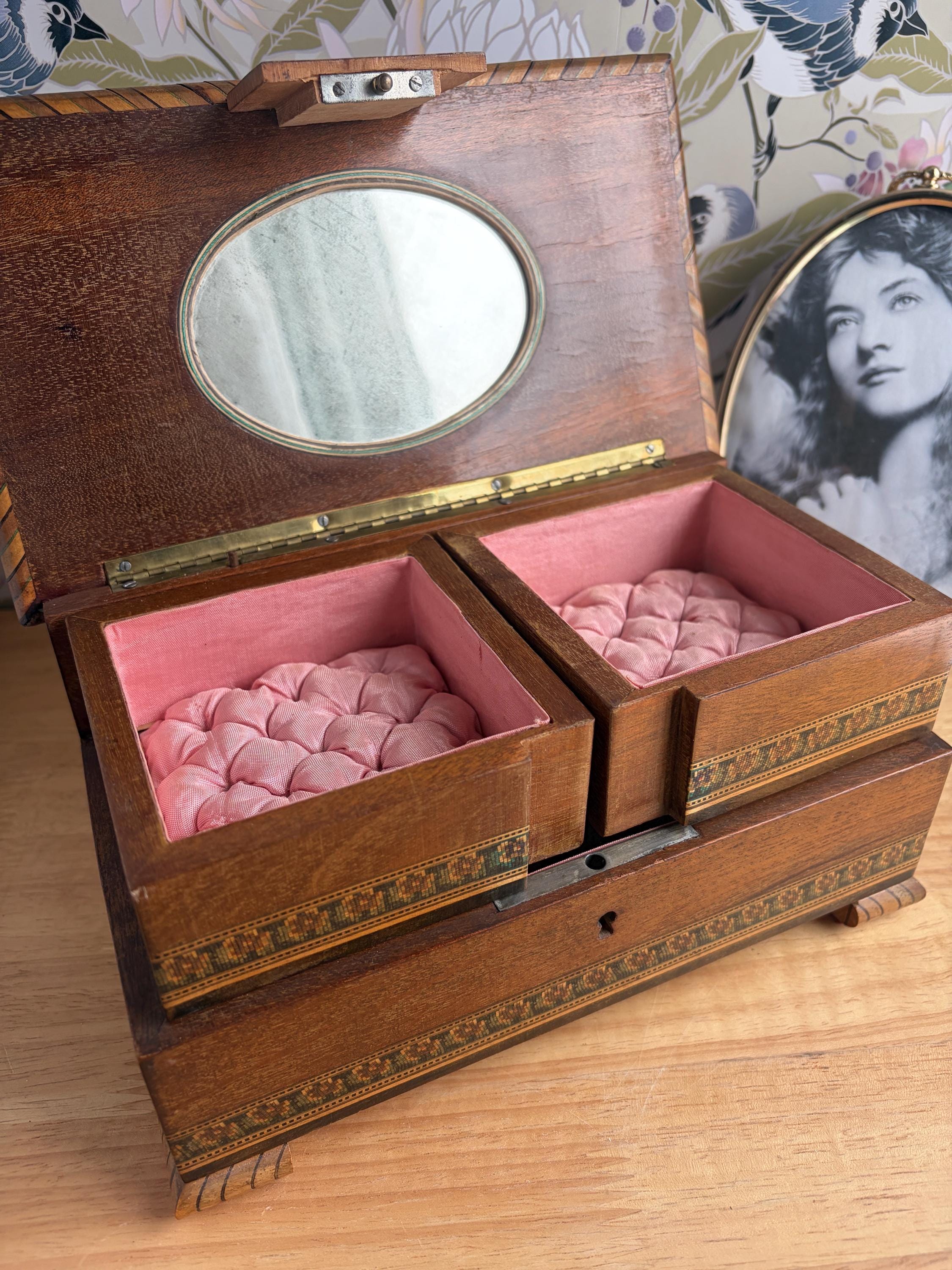 Beautiful Italian-made wood inlaid and decoupaged jewelry box. This beautiful vintage box (likely from the 1940s) has a lovely pink tufted satin lining and oval mirror on the underside of the lid. There is a key hole but unfortunately the key is no longer with it. It is unlocked and can be open by lifting the wooden latch on the lid. The two top sides swing out to provide access to the interior of the box.