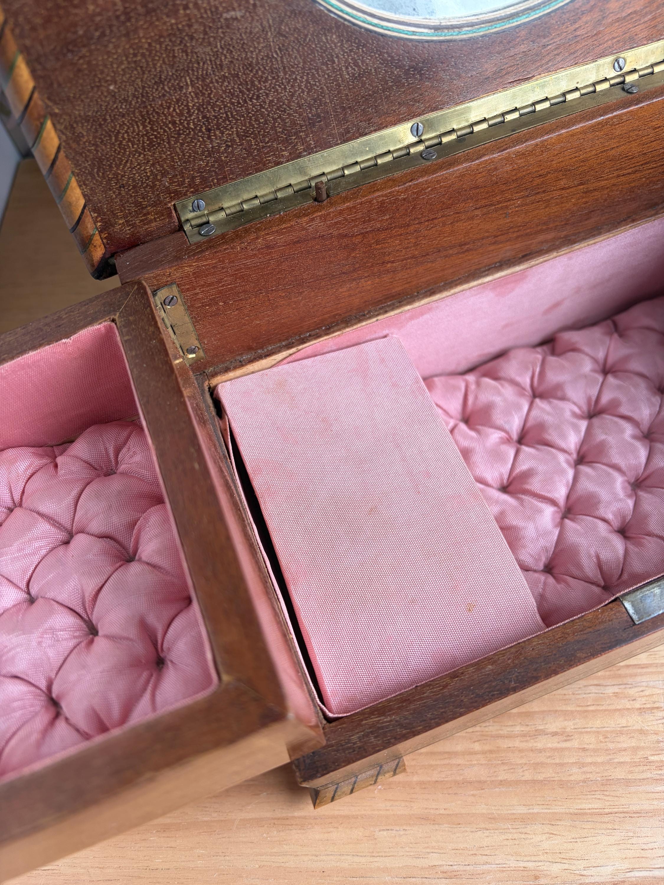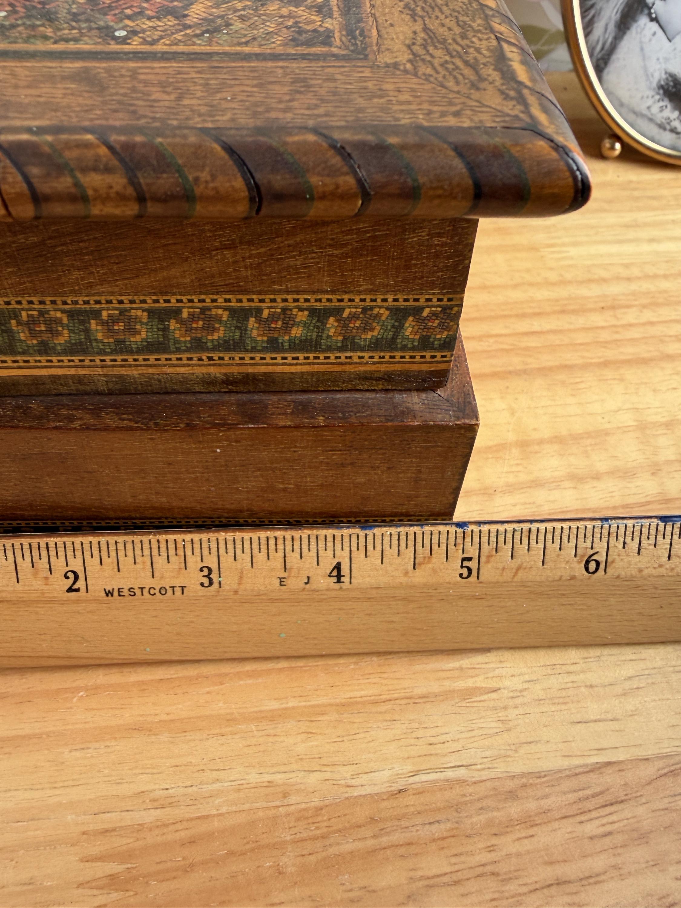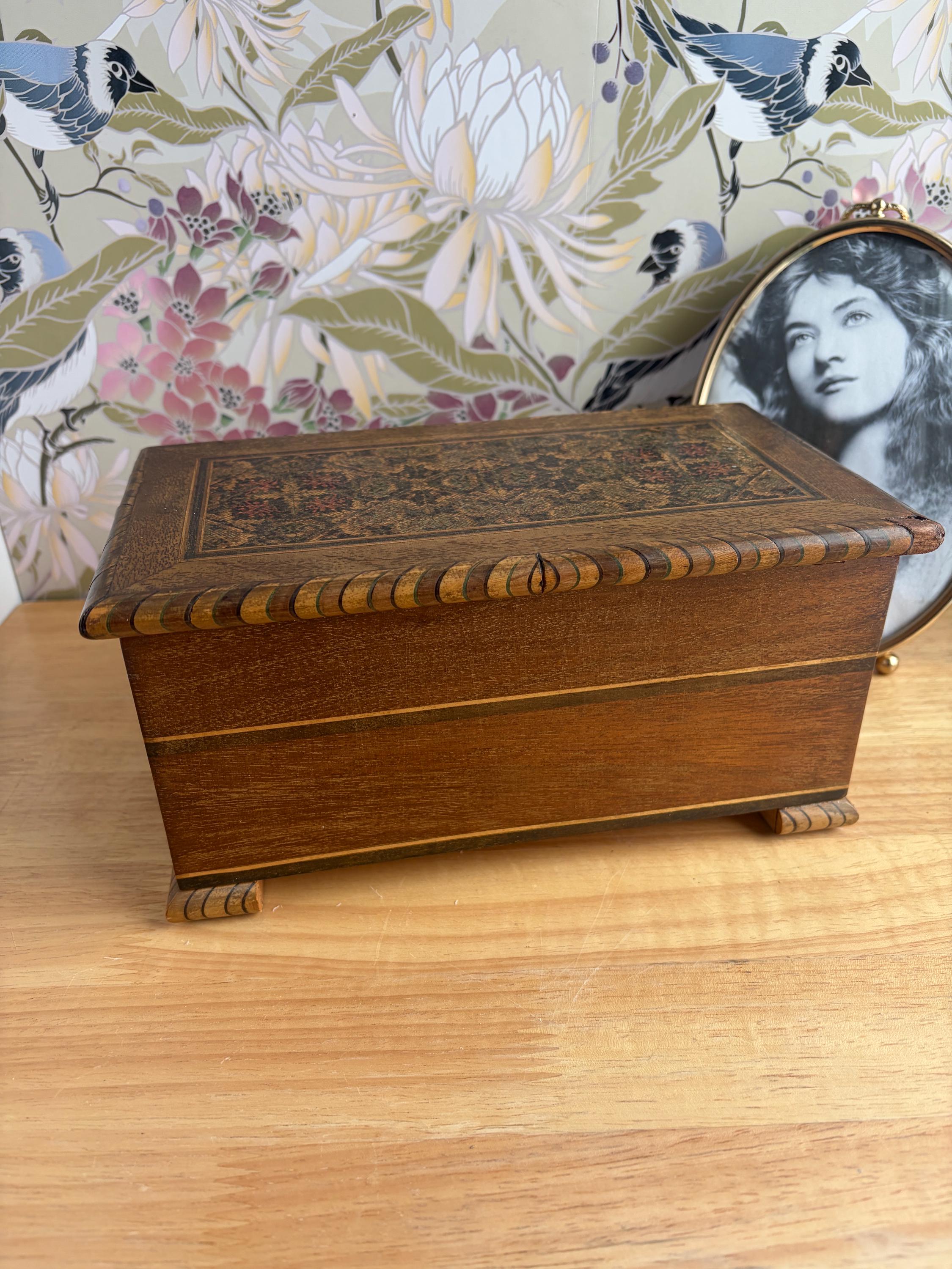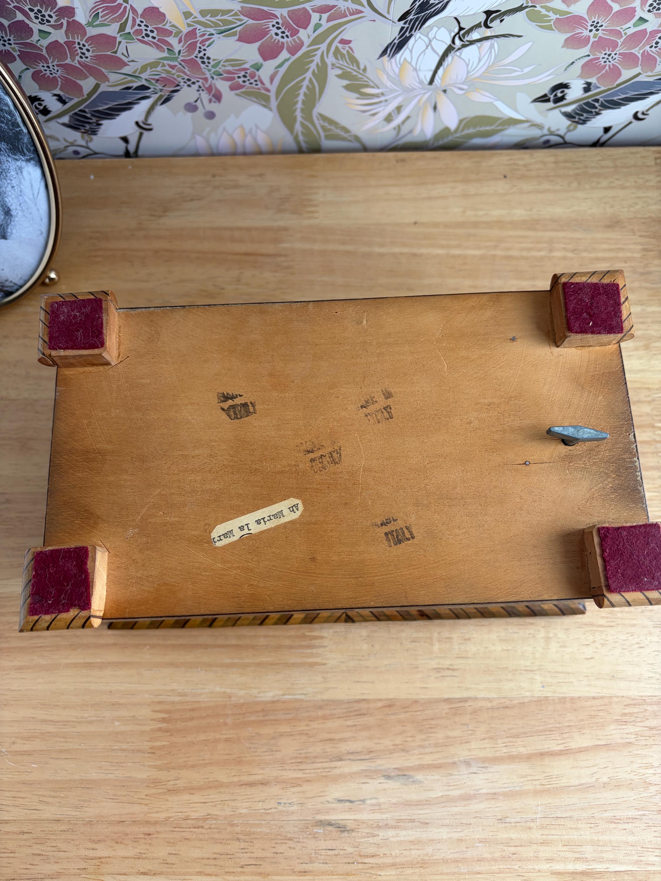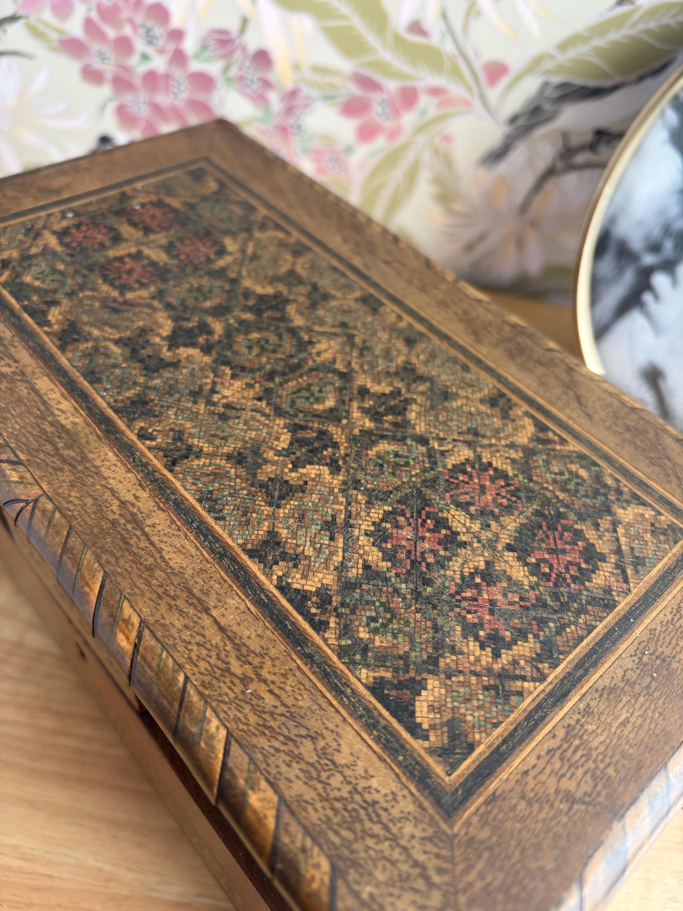Beautiful Italian-made wood inlaid and decoupaged jewelry box. This beautiful vintage box (likely from the 1940s) has a lovely pink tufted satin lining and oval mirror on the underside of the lid. There is a key hole but unfortunately the key is no longer with it. It is unlocked and can be open by lifting the wooden latch on the lid. The two top sides swing out to provide access to the interior of the box.
