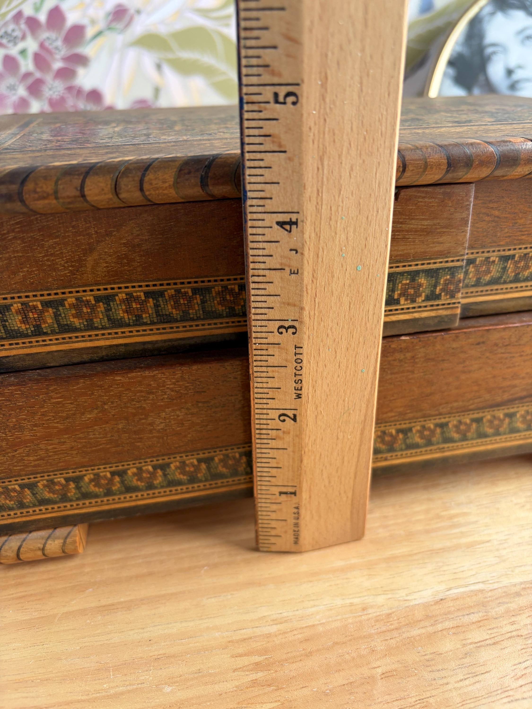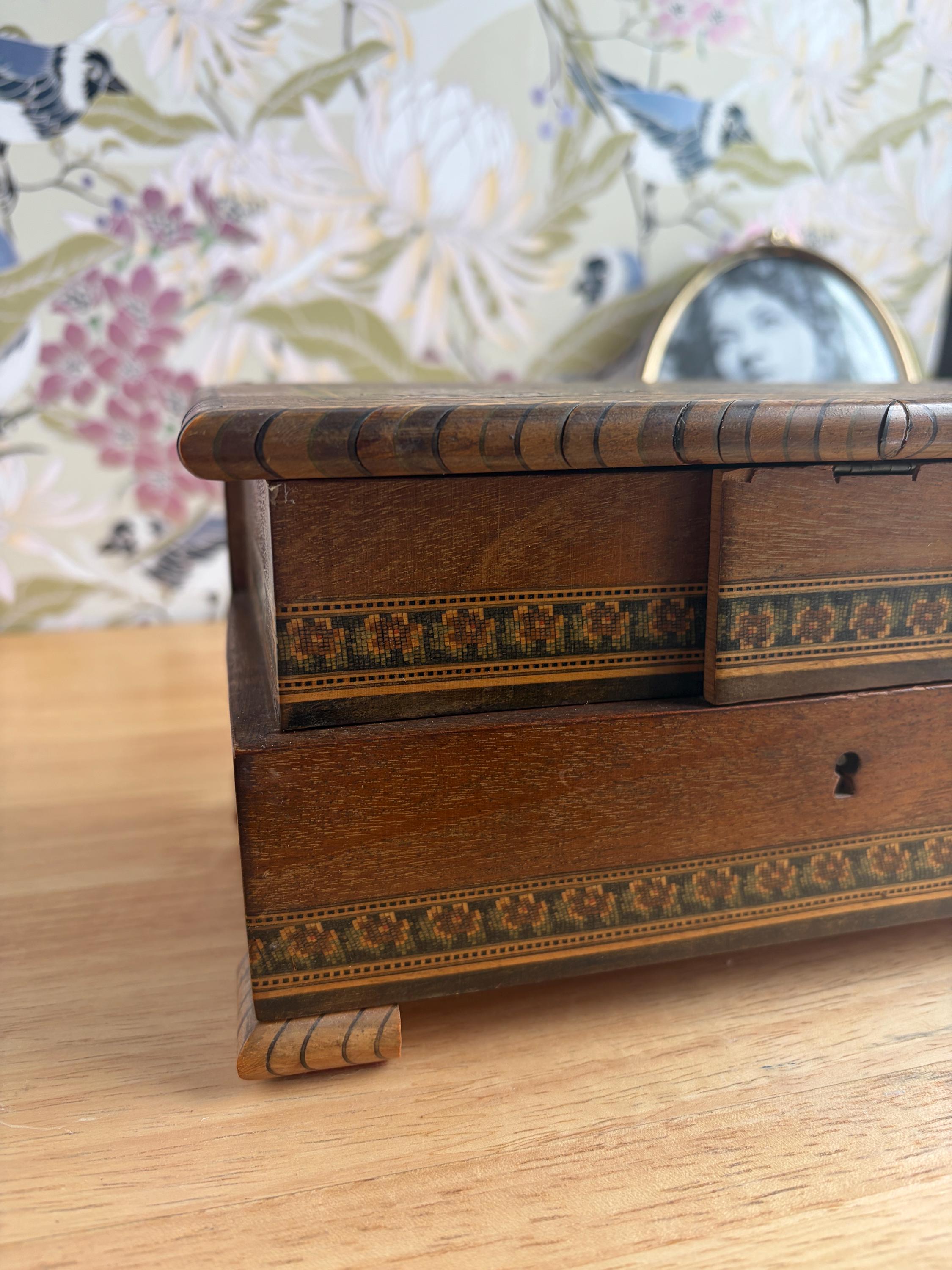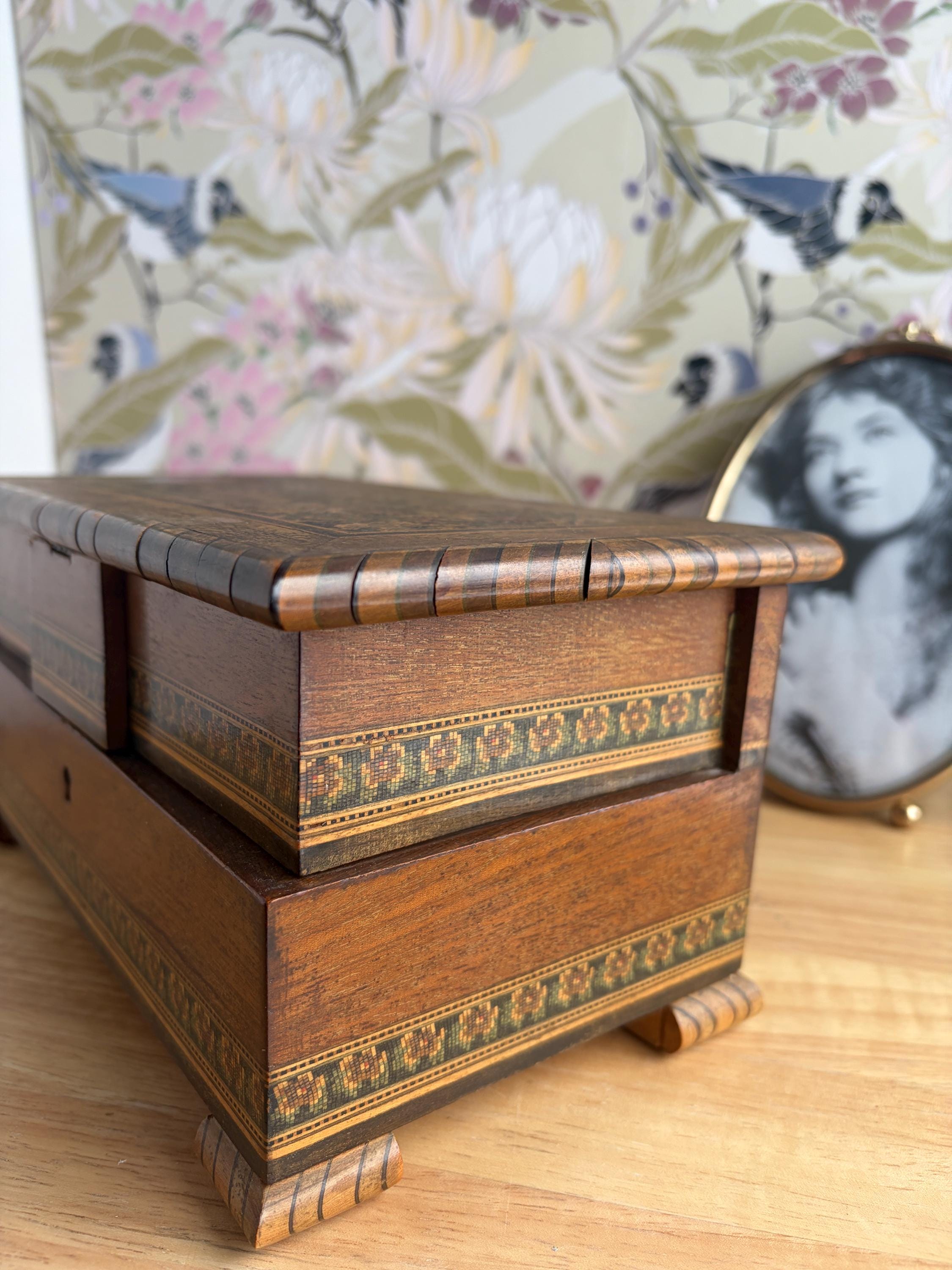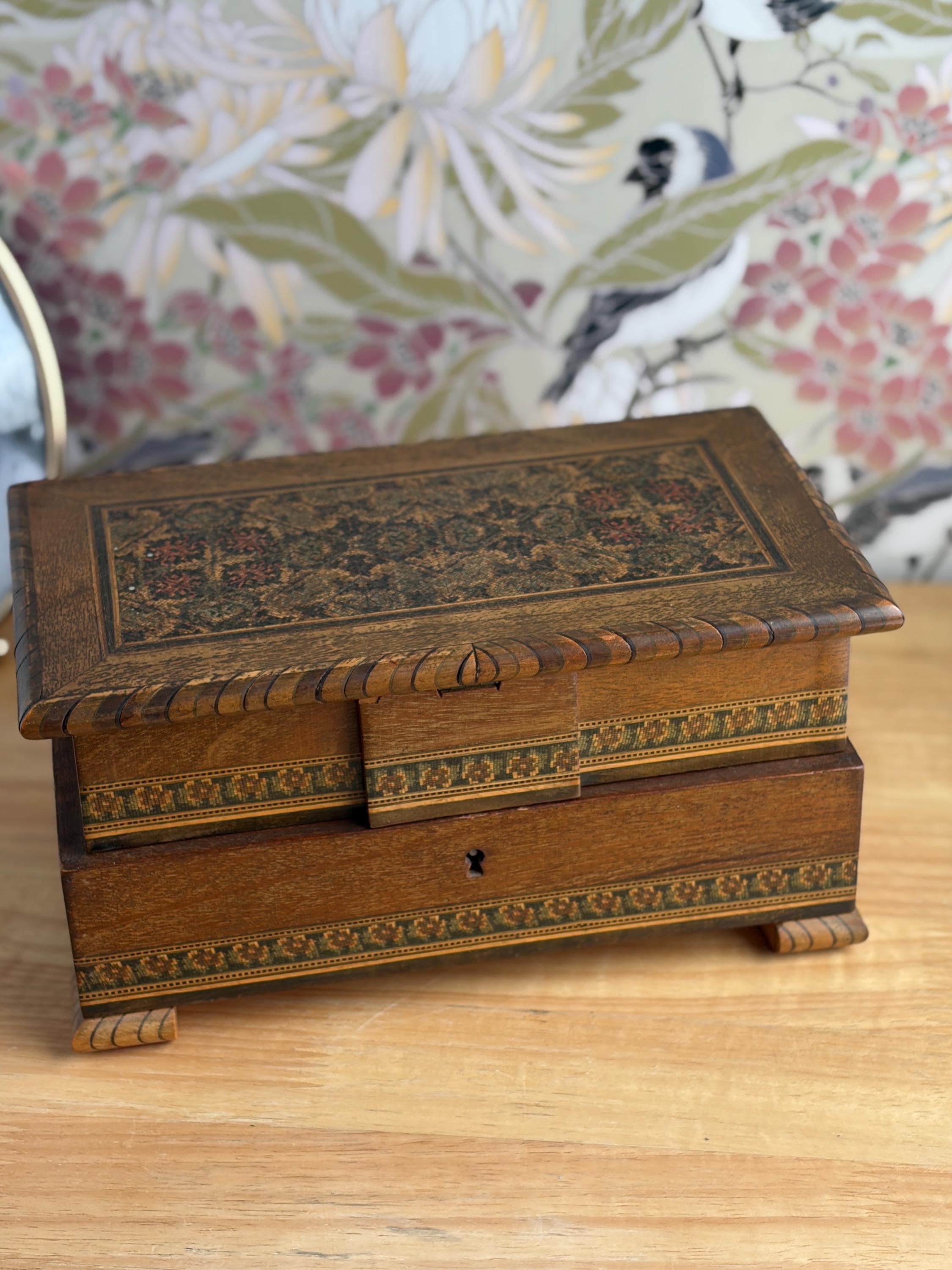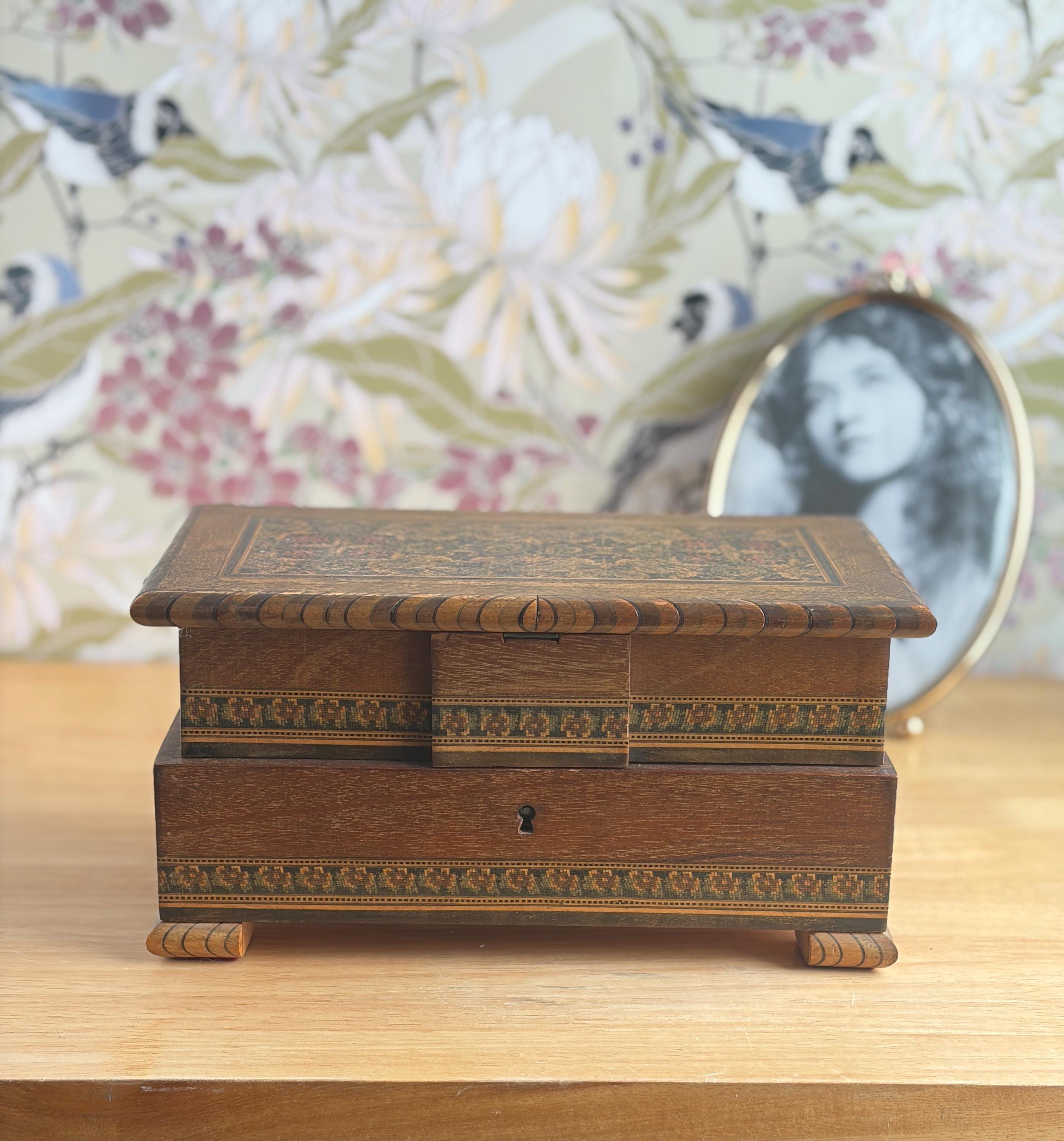 Beautiful Italian-made wood inlaid and decoupaged jewelry box. This beautiful vintage box (likely from the 1940s) has a lovely pink tufted satin lining and oval mirror on the underside of the lid. There is a key hole but unfortunately the key is no longer with it. It is unlocked and can be open by lifting the wooden latch on the lid. The two top sides swing out to provide access to the interior of the box.
