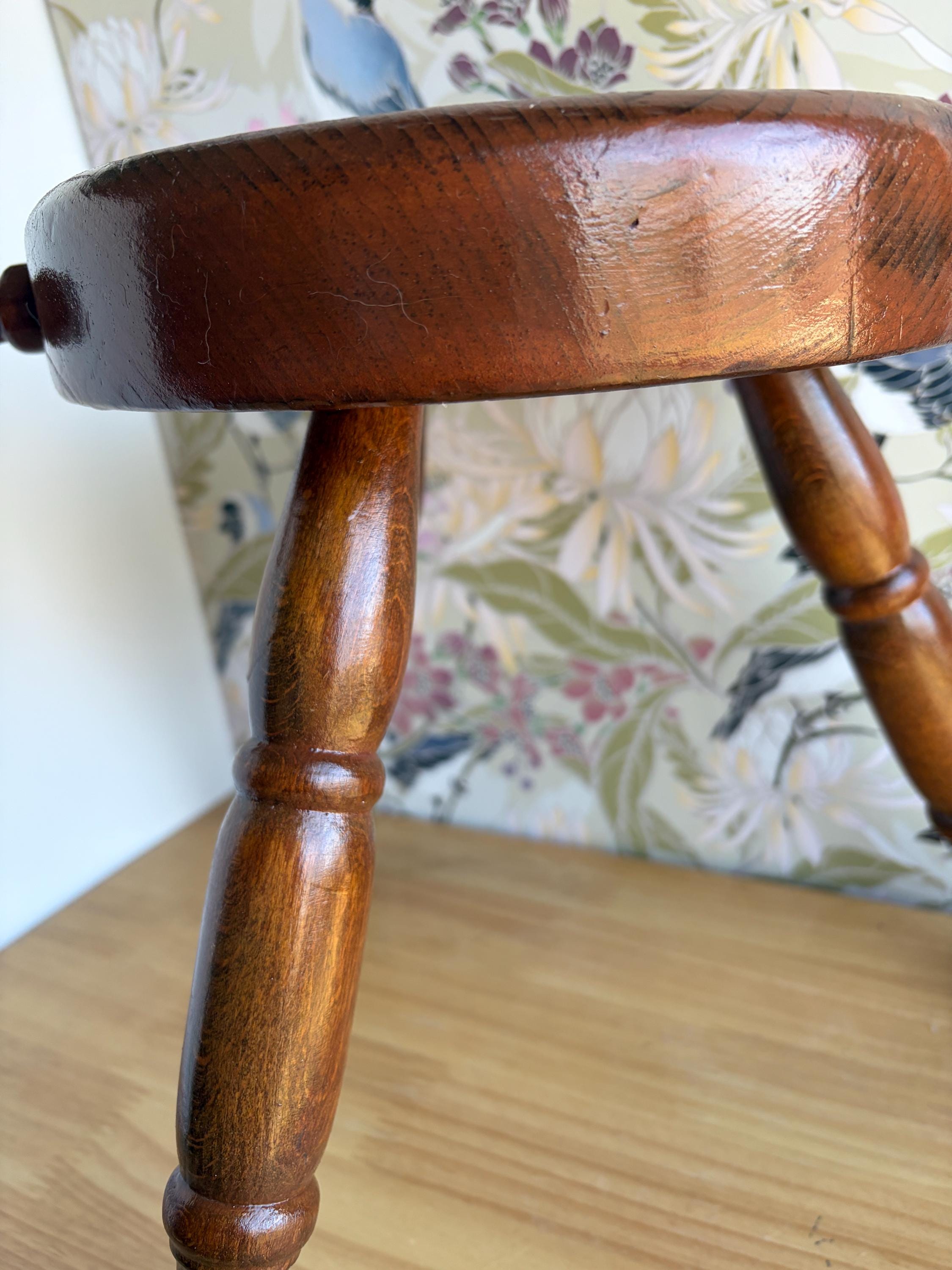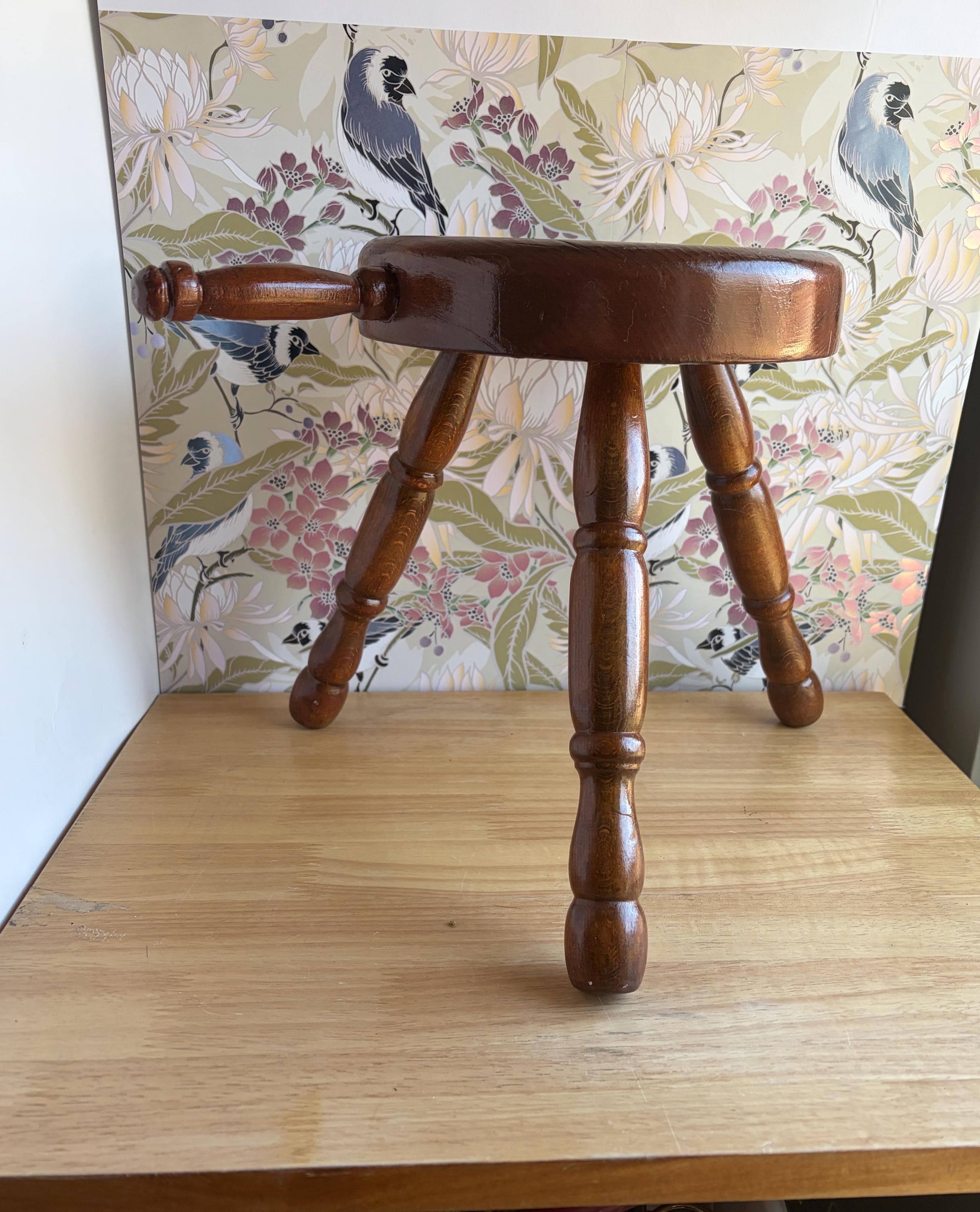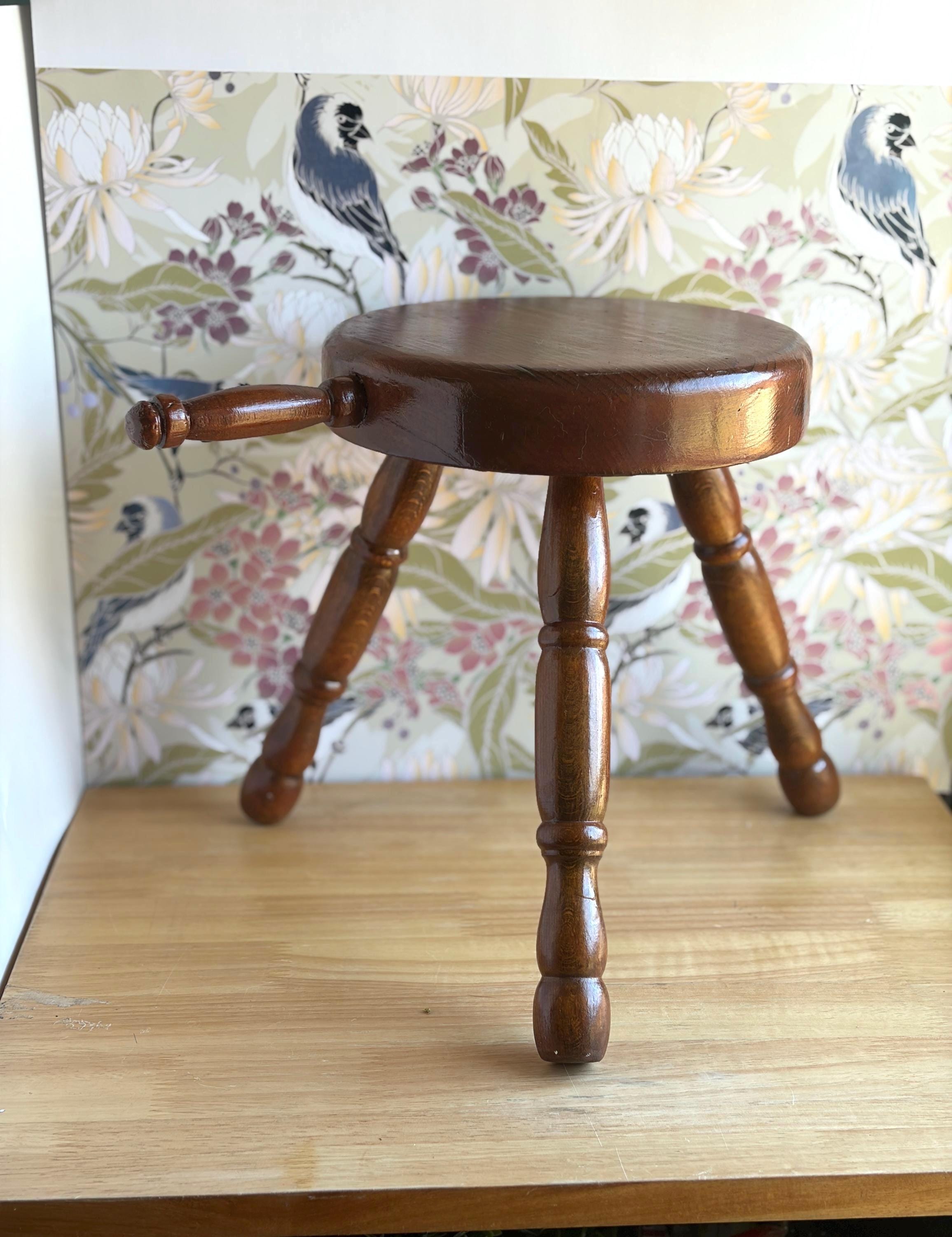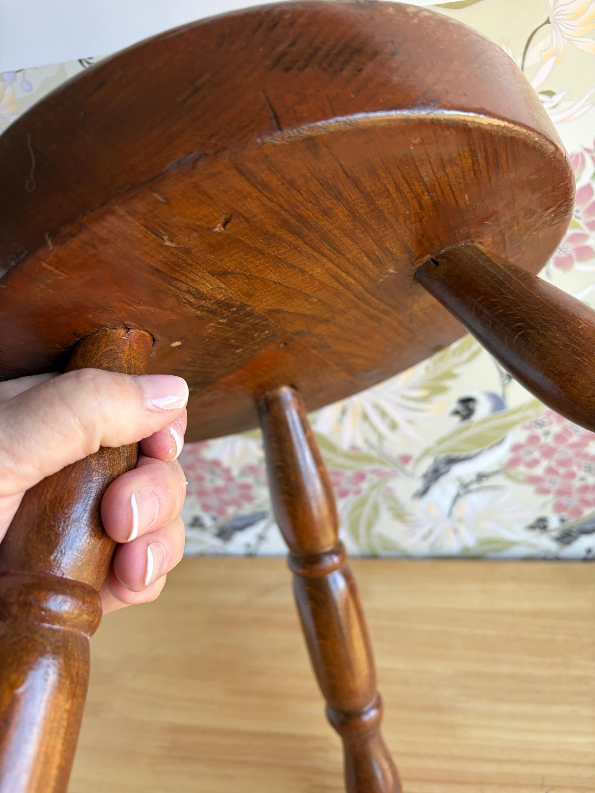 Very sturdy, high quality, vintage wooden milking stool can be used in a bathroom, as a riser on a shelf or plant stand. Three turned spindle legs and thick seat 9 inches in diameter. Handle extends from seat. Rich dark brown stain. Excellent condition.