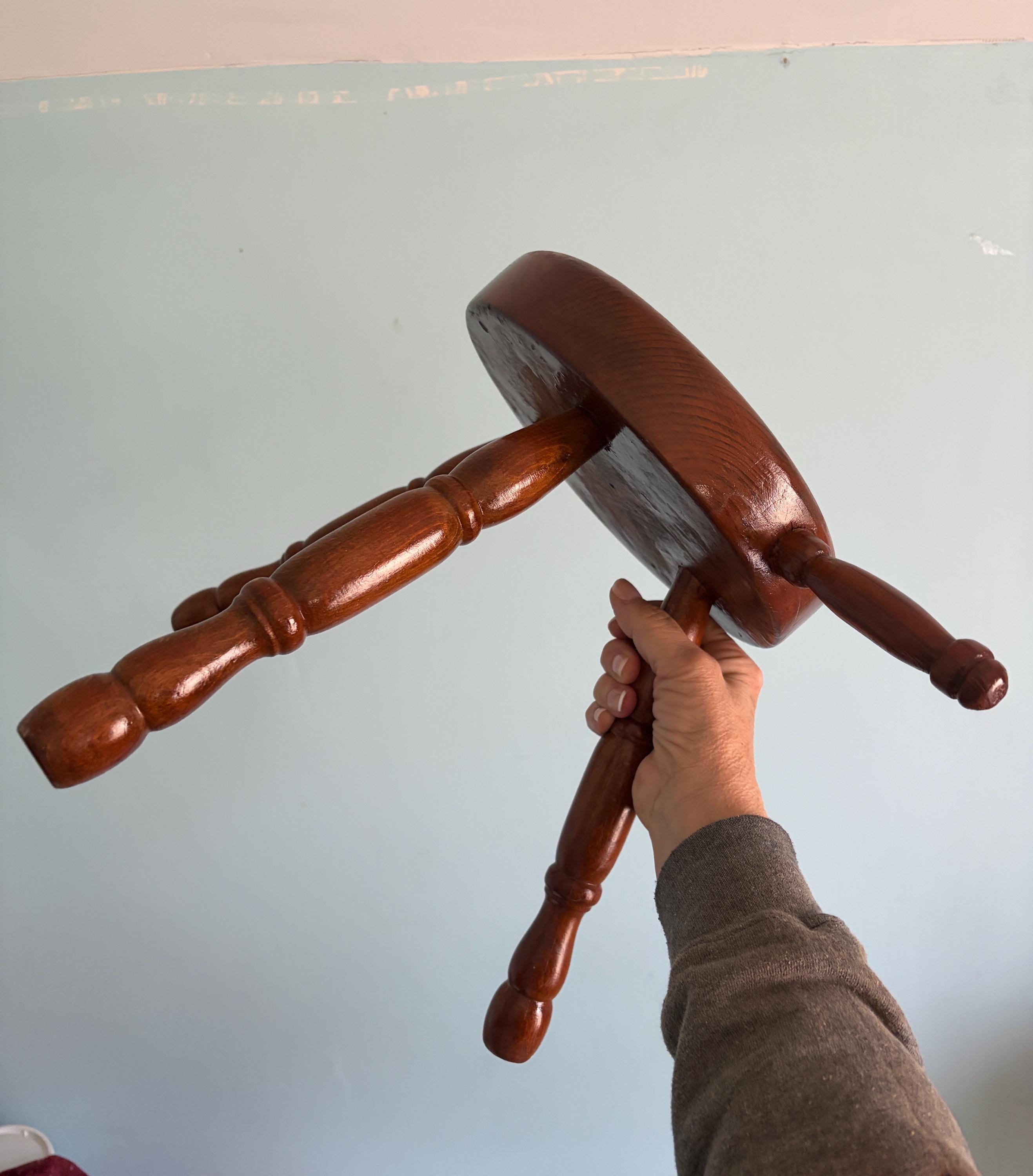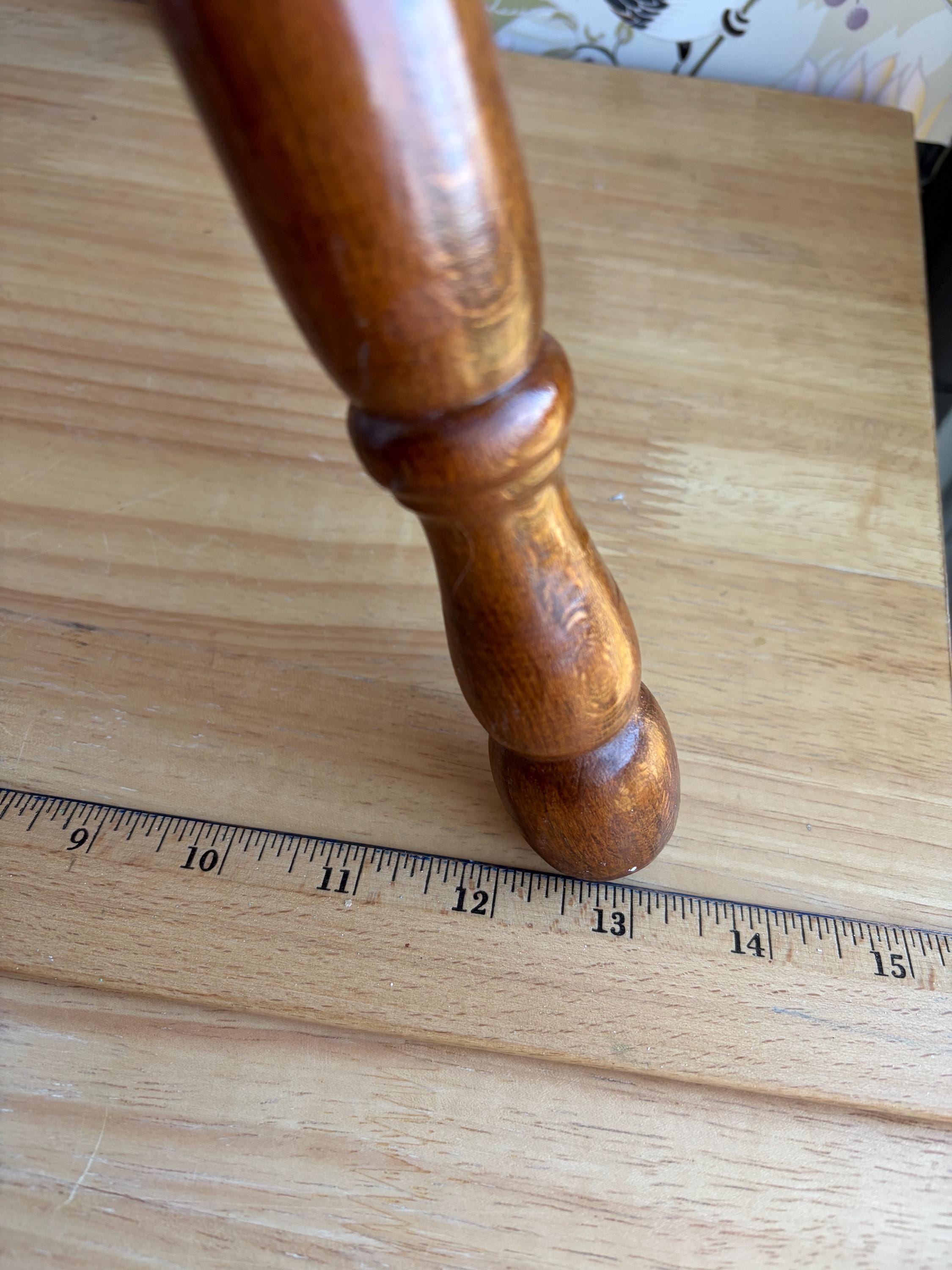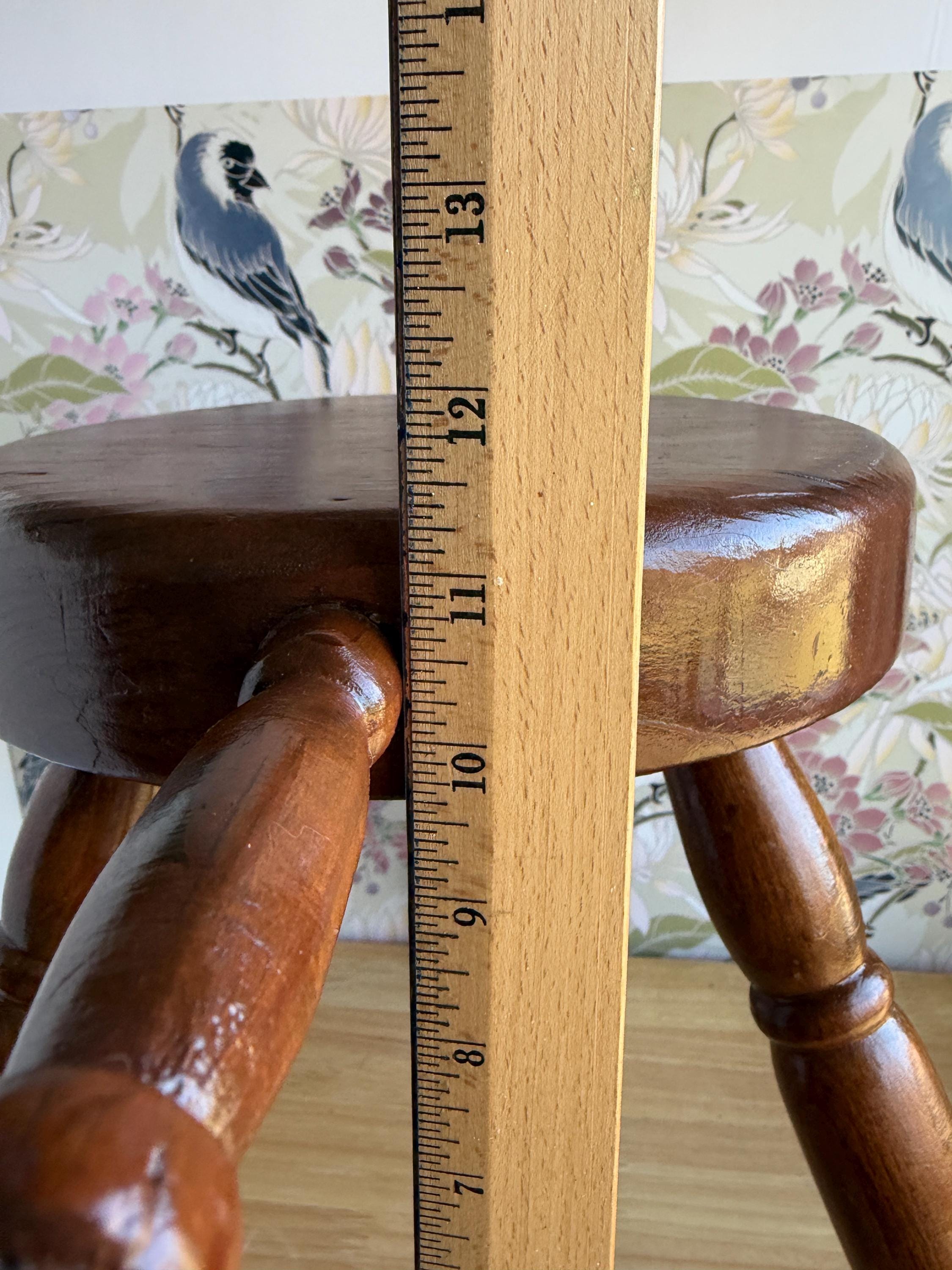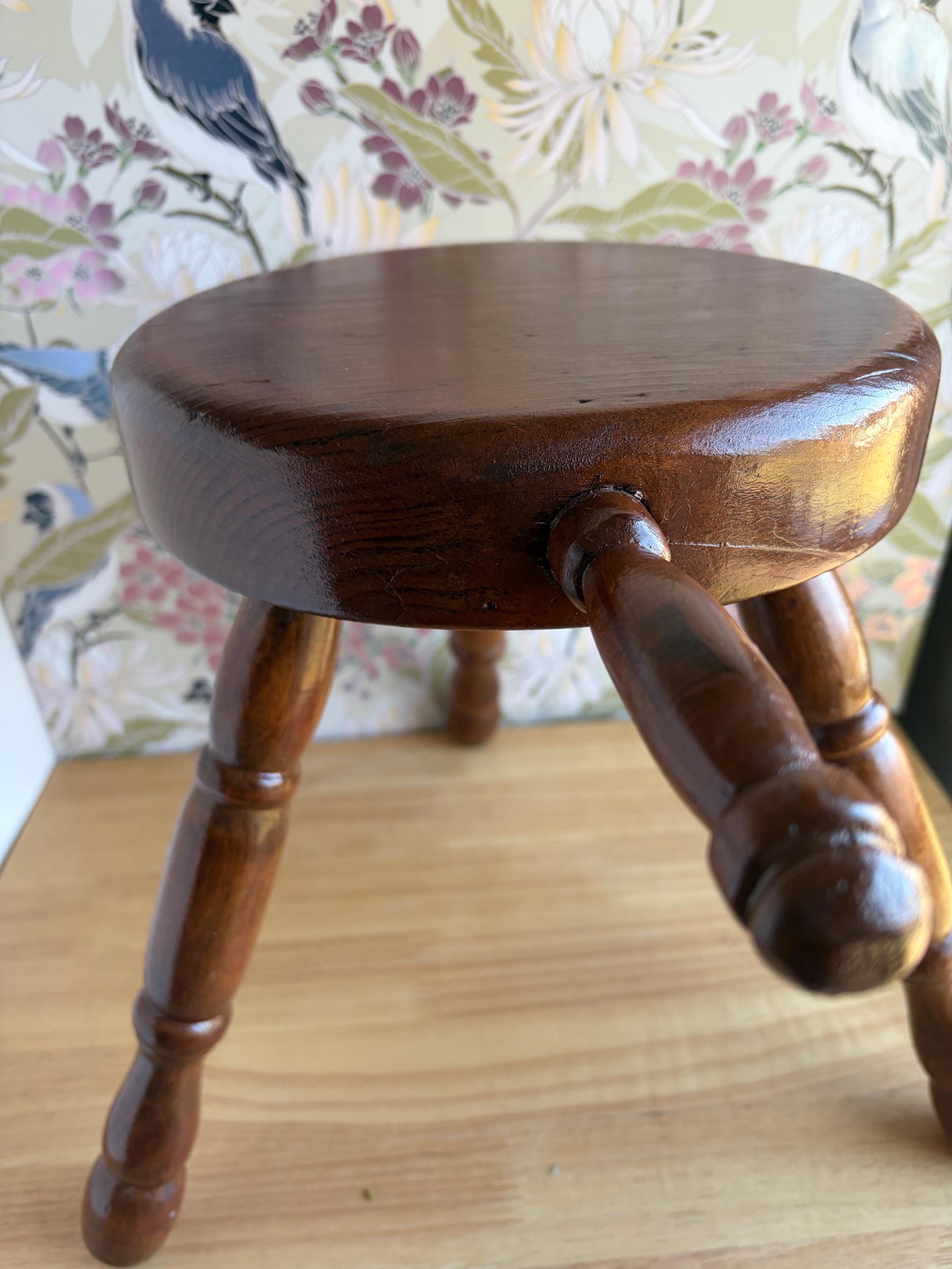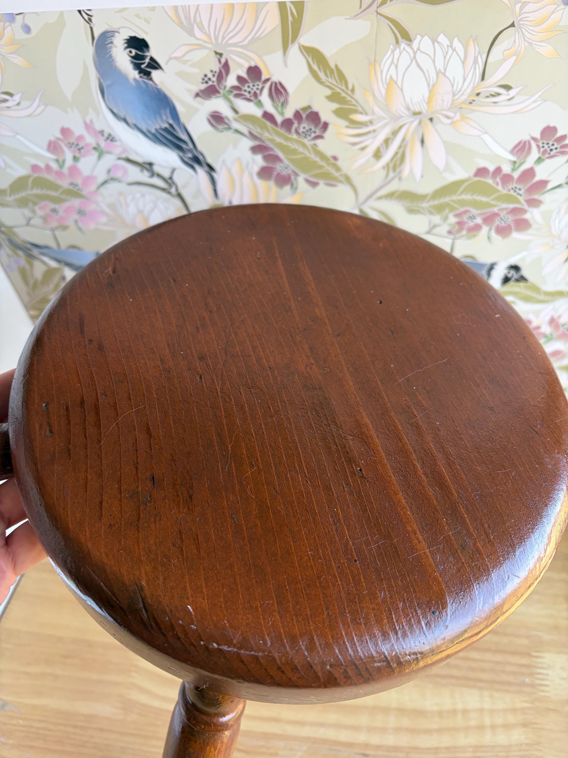 Very sturdy, high quality, vintage wooden milking stool can be used in a bathroom, as a riser on a shelf or plant stand. Three turned spindle legs and thick seat 9 inches in diameter. Handle extends from seat. Rich dark brown stain. Excellent condition.