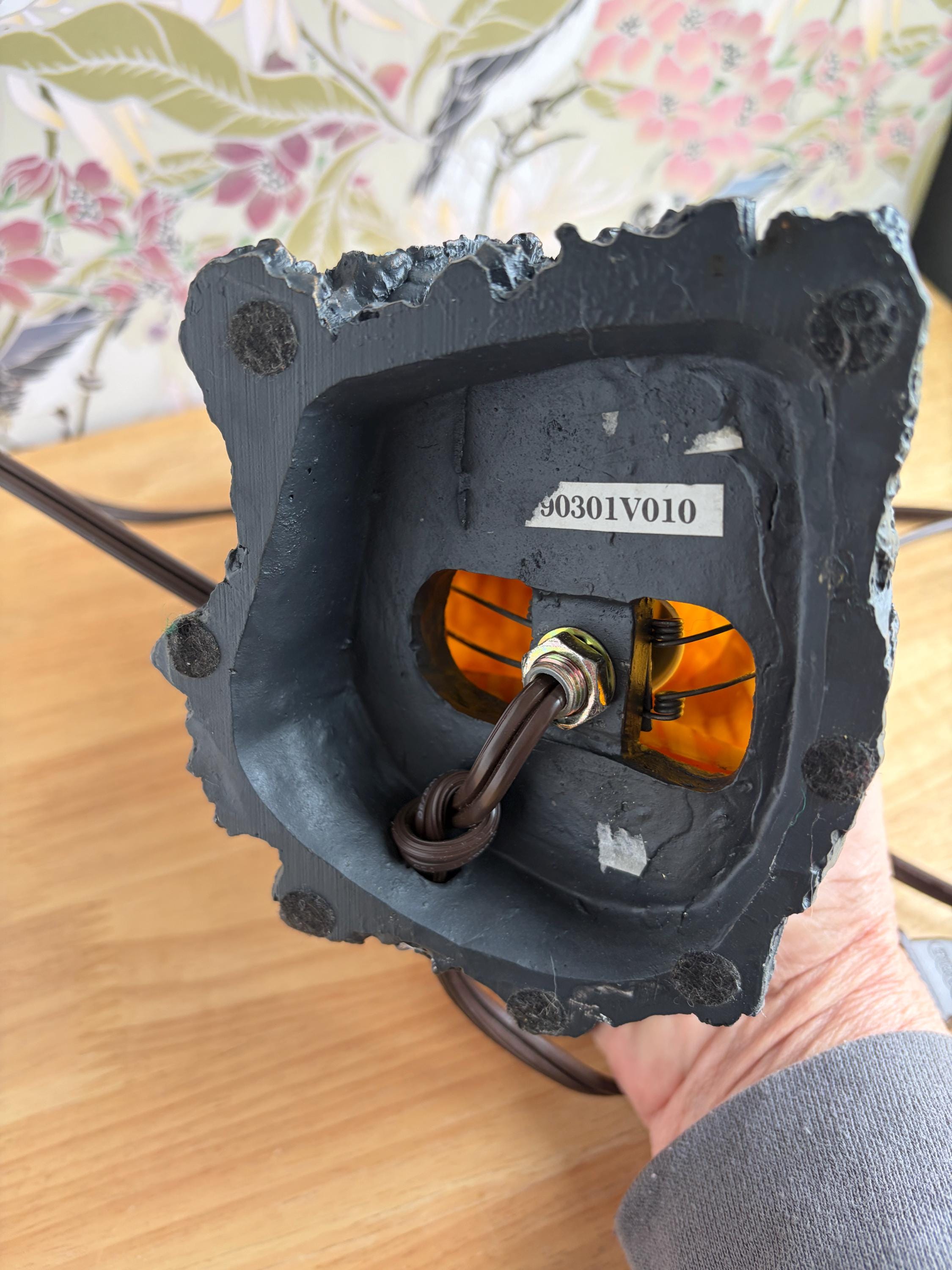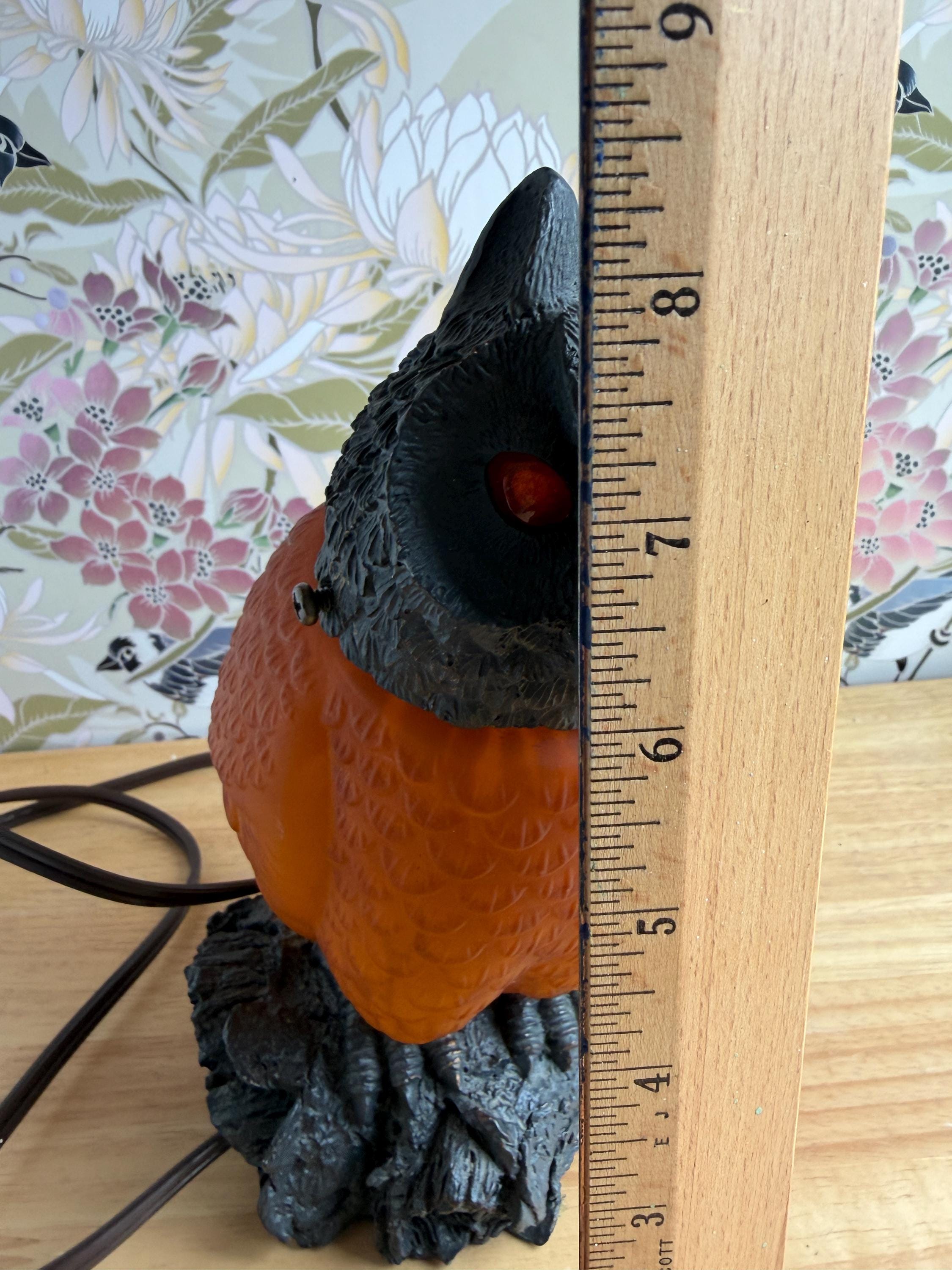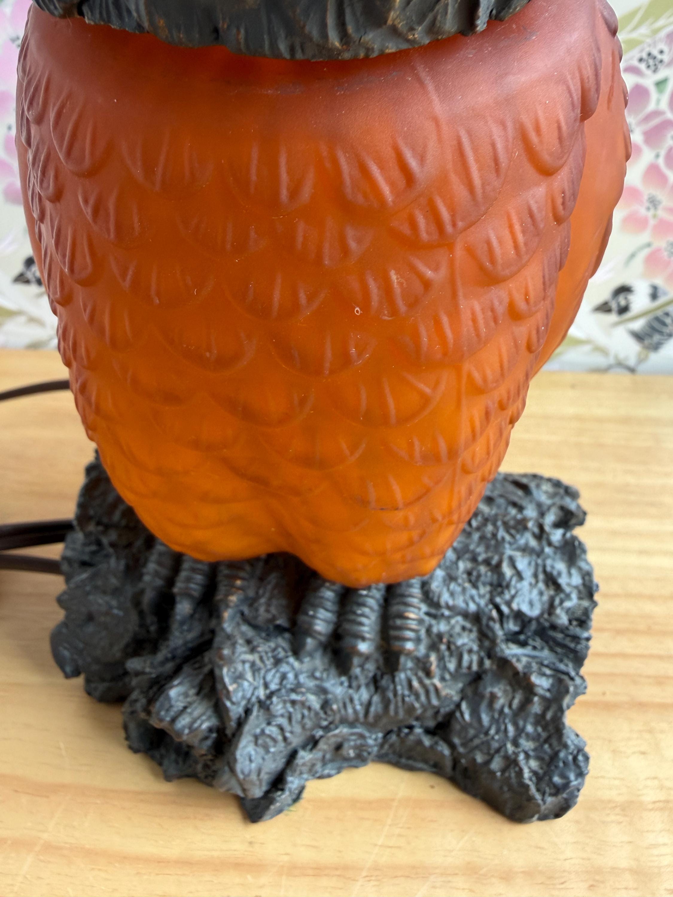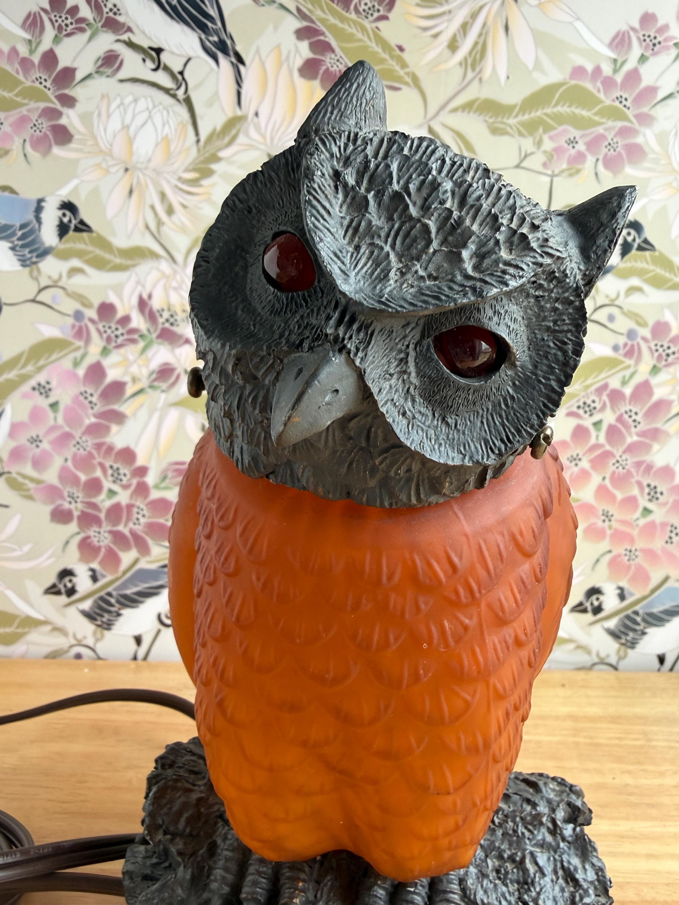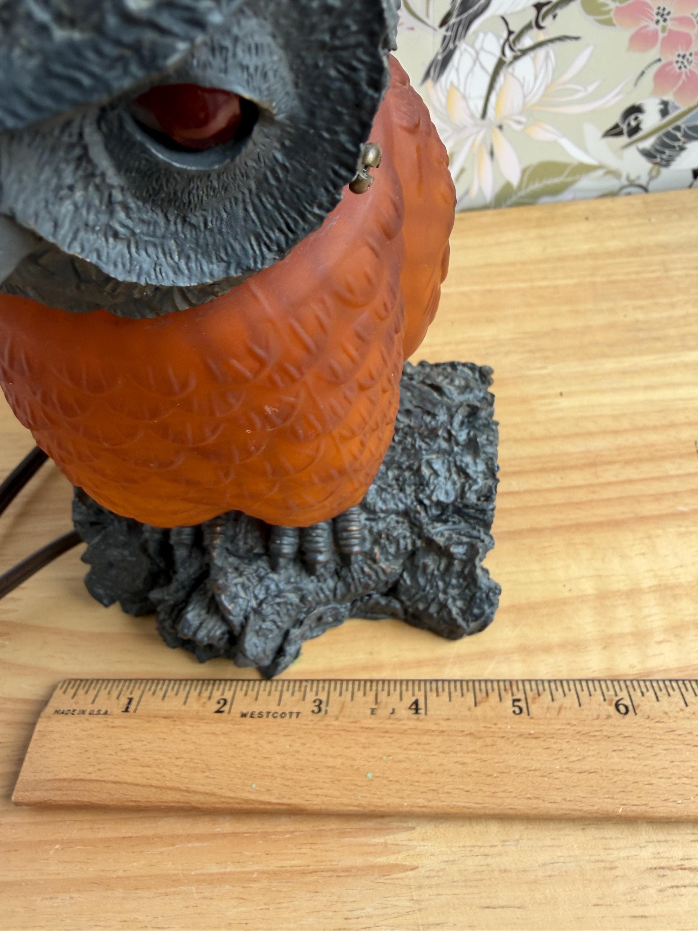 Beautiful orange | amber glass owl lamp nightlight. It has an amber slag glass body and red glass eyes that glow when lit. It is head and base are resin. It has a 6 foot cord with a rocker switch to turn on and off. This is a unique and lovely piece.