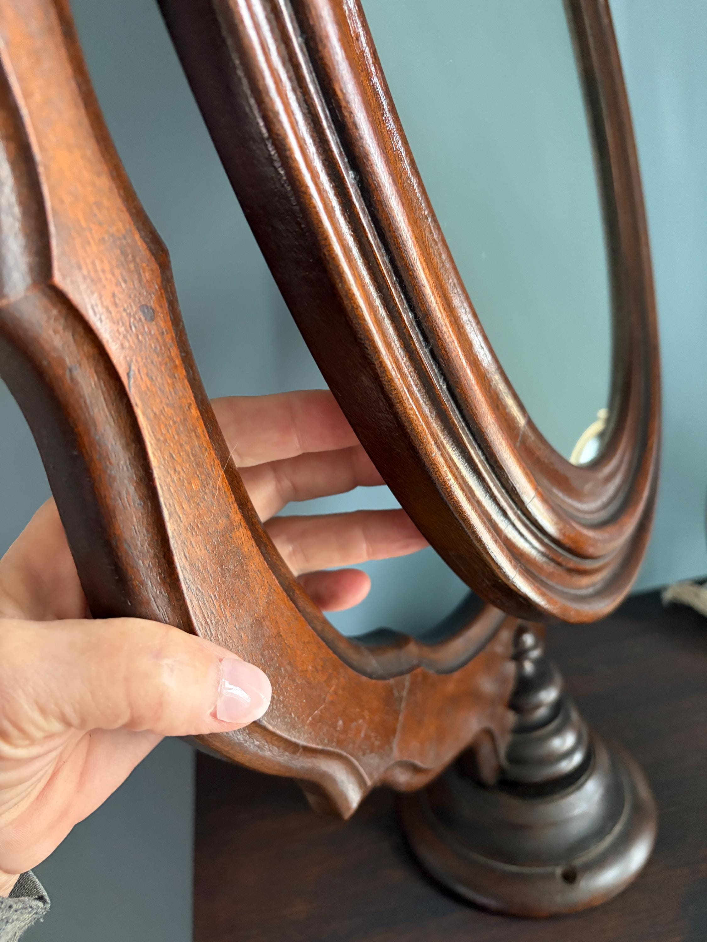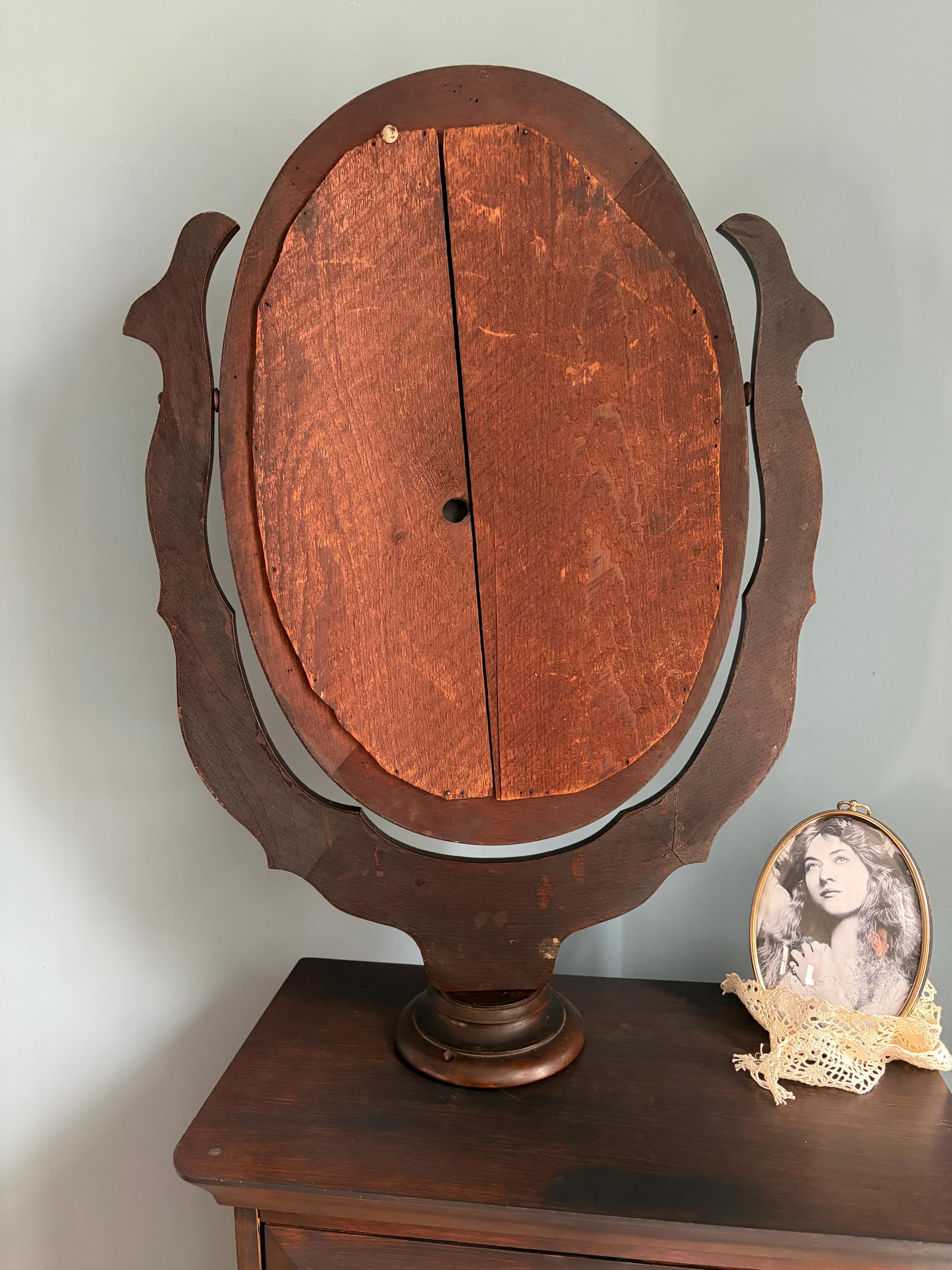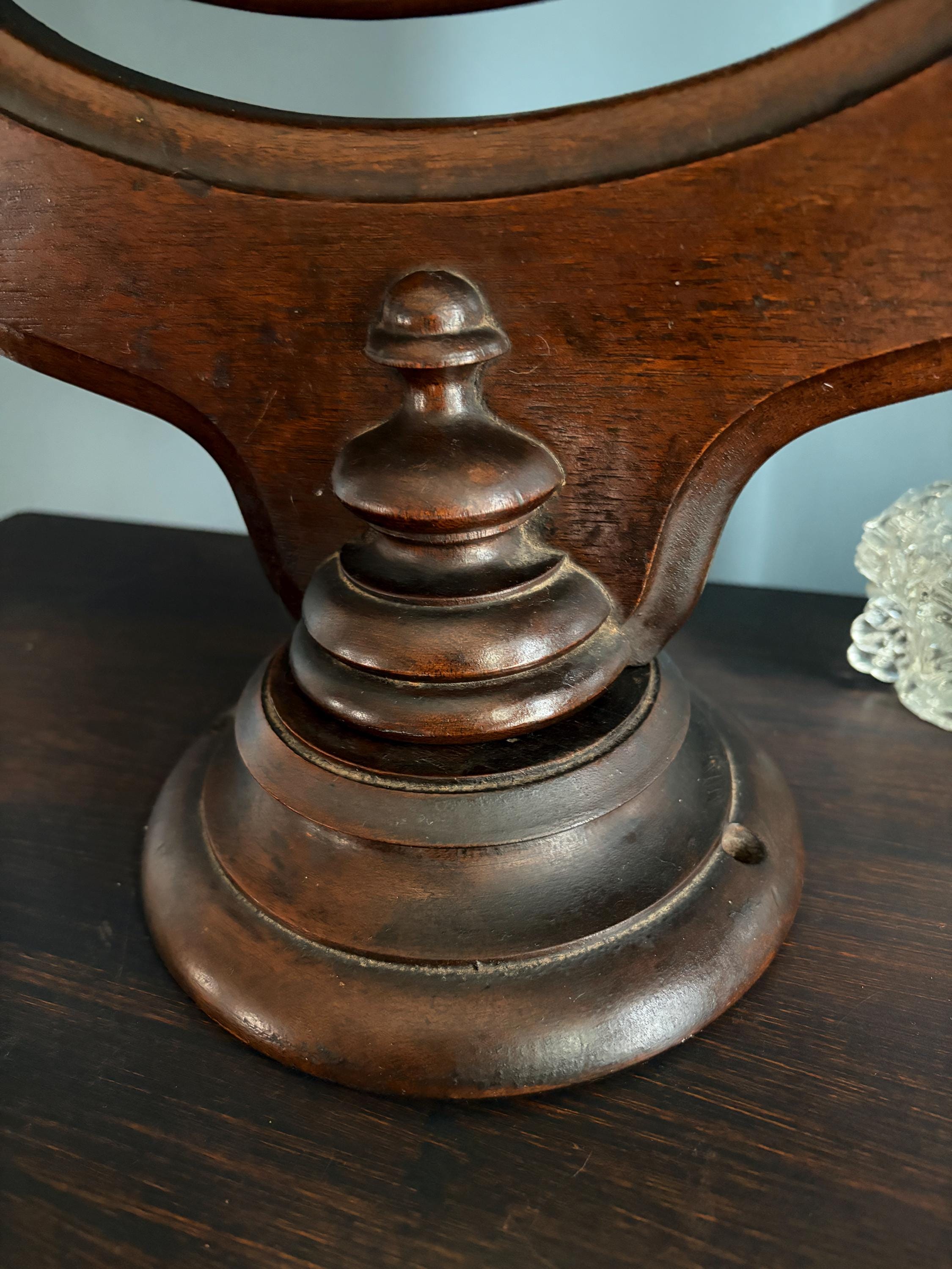 Unique and lovely oval mirror to mount onto a dresser or dressing table. It can swivel on an ornately carved wood harp and inserts into a 6 inch diameter wooden base. It has two holes in the base for adding screws if you chooses to mount it more permanently. It soes stand in the base without mounting (screws not included).