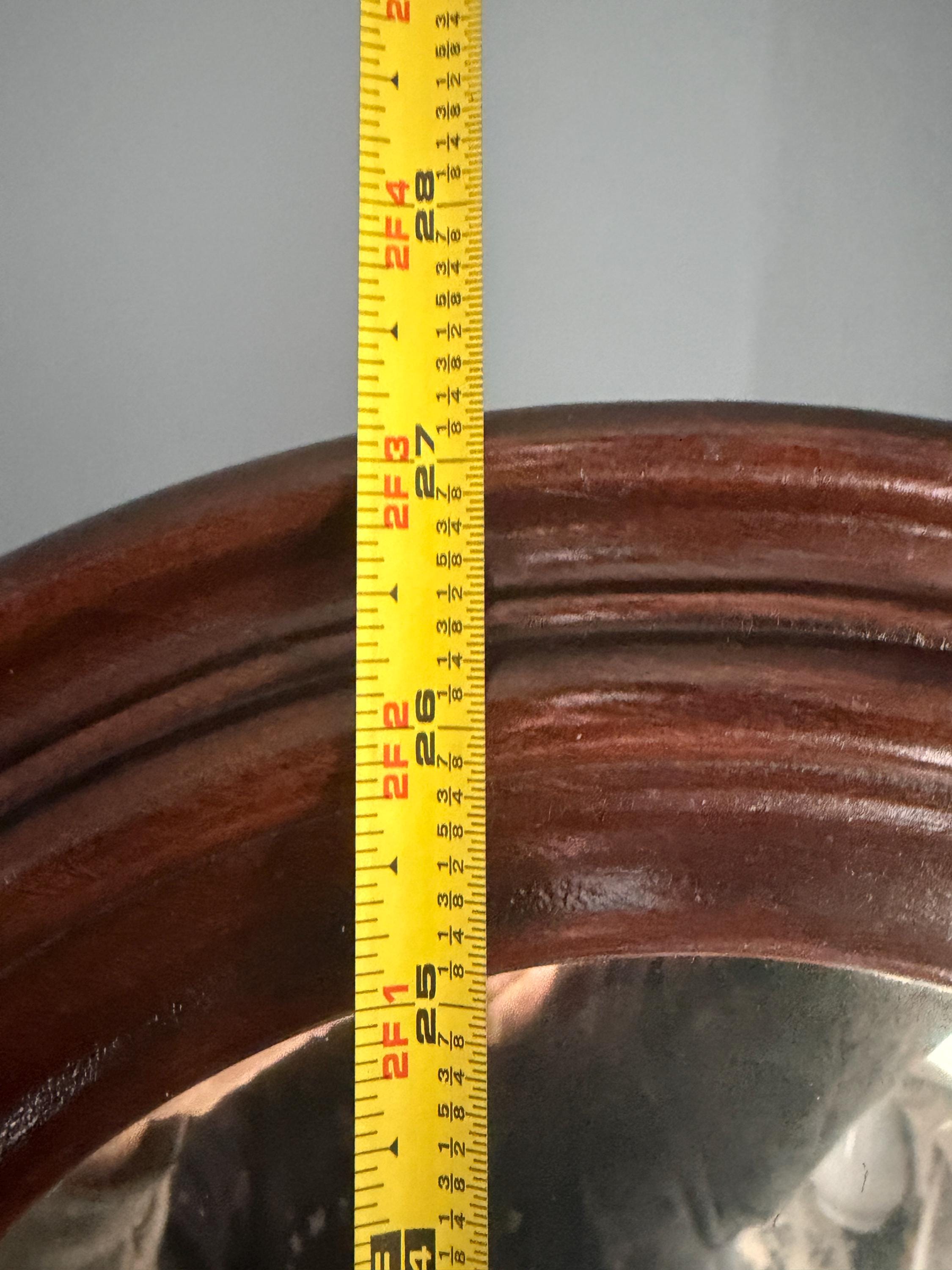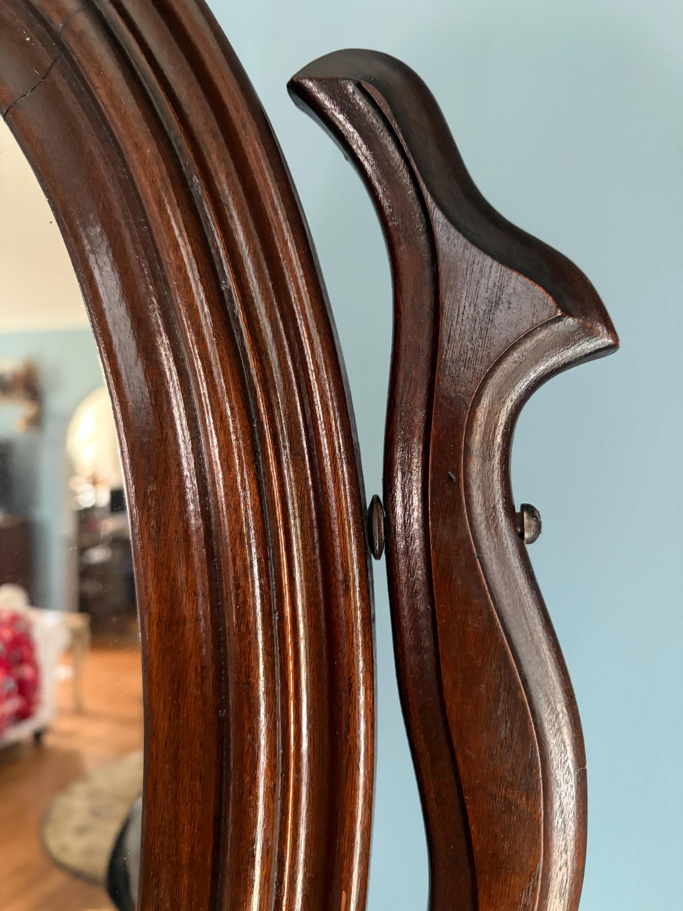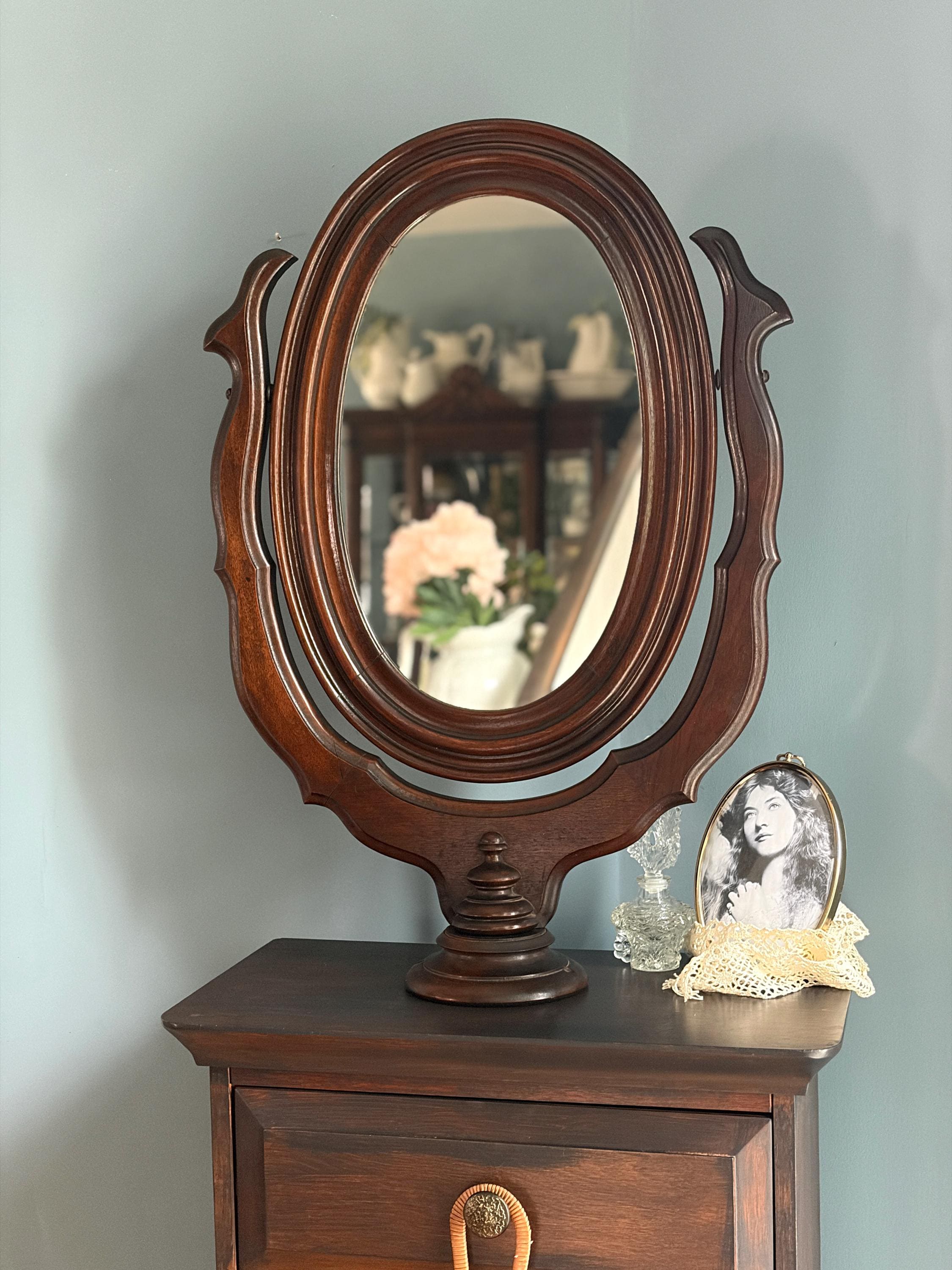 Unique and lovely oval mirror to mount onto a dresser or dressing table. It can swivel on an ornately carved wood harp and inserts into a 6 inch diameter wooden base. It has two holes in the base for adding screws if you chooses to mount it more permanently. It soes stand in the base without mounting (screws not included).