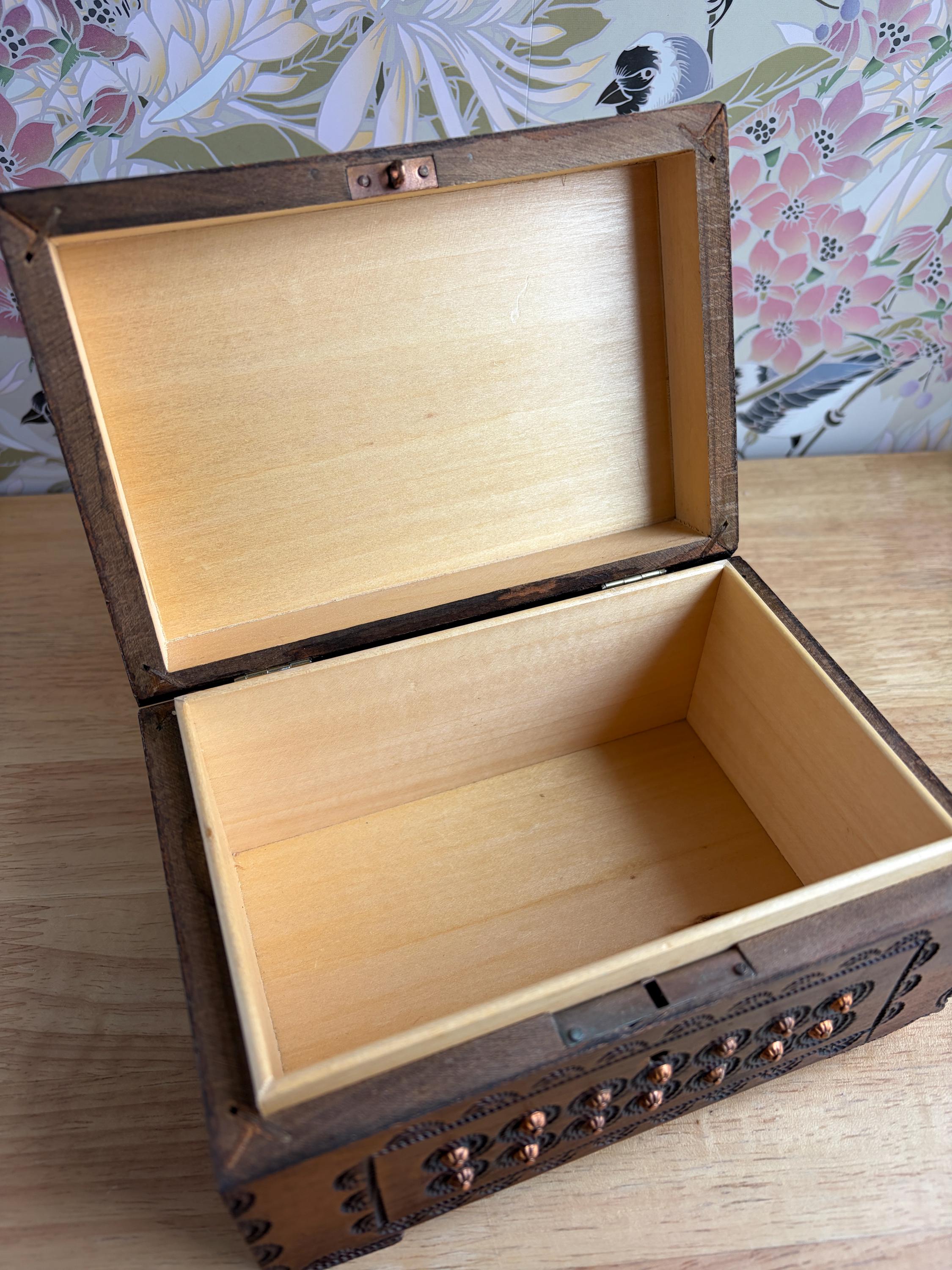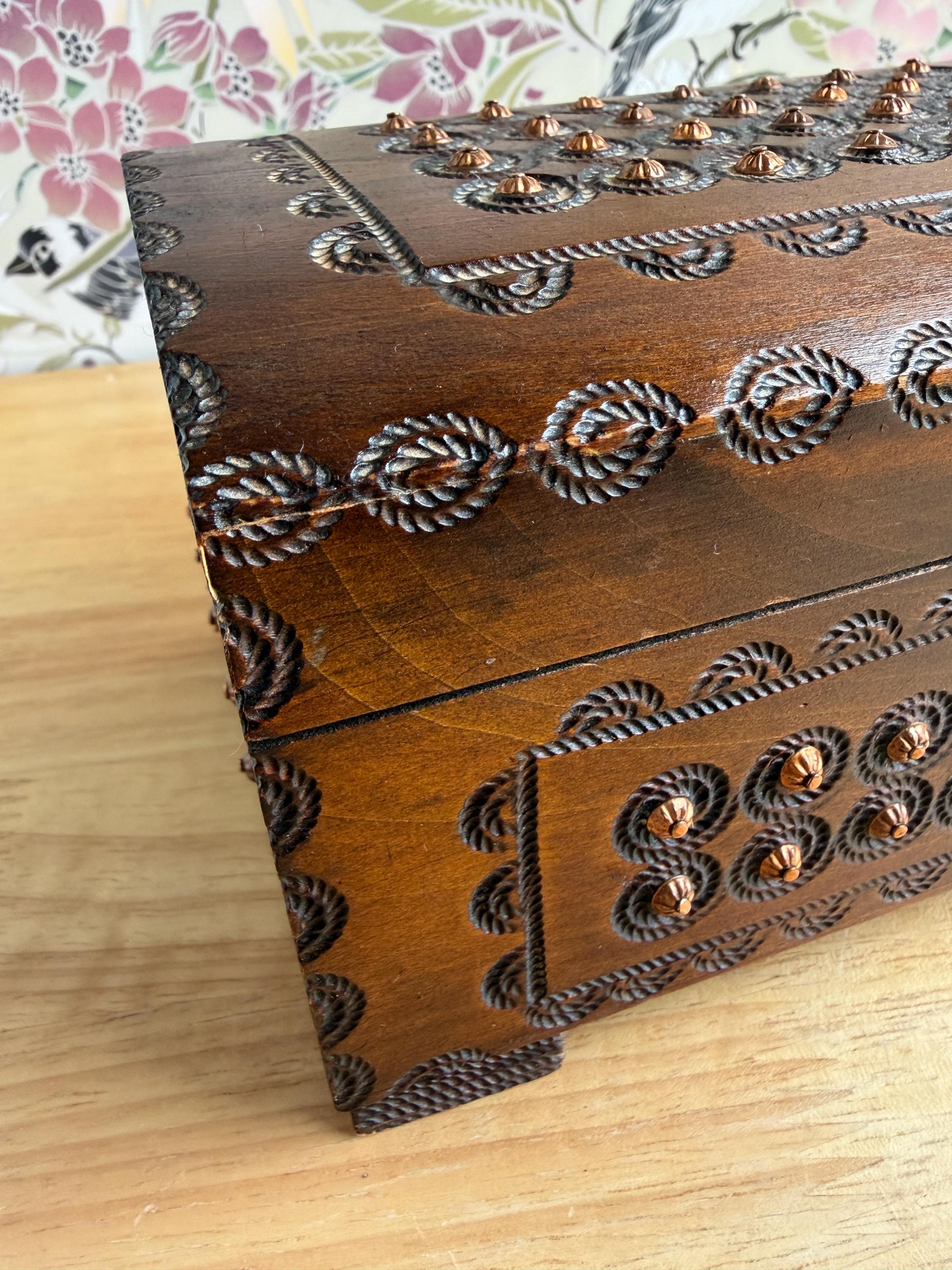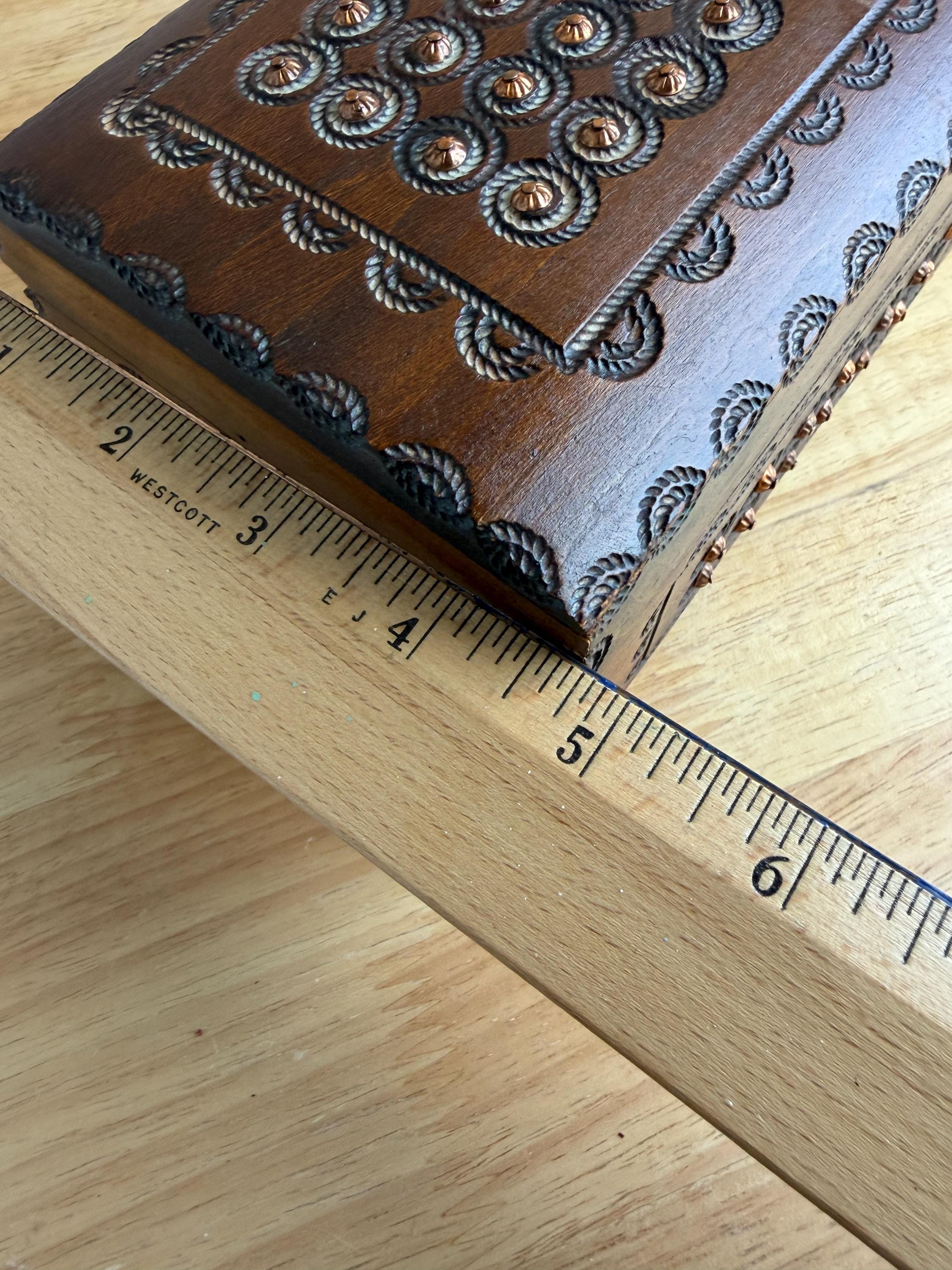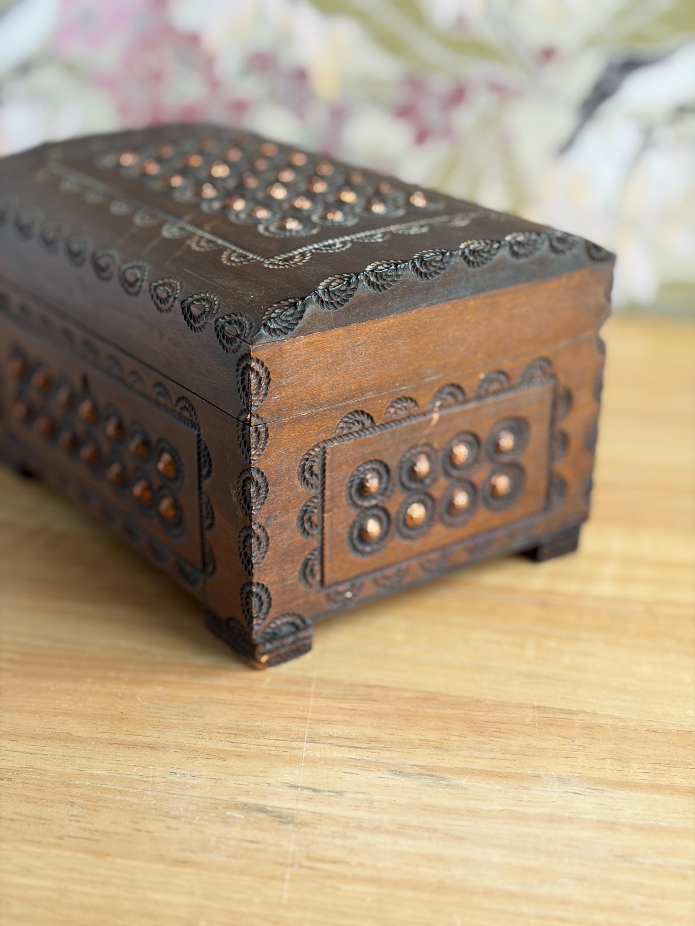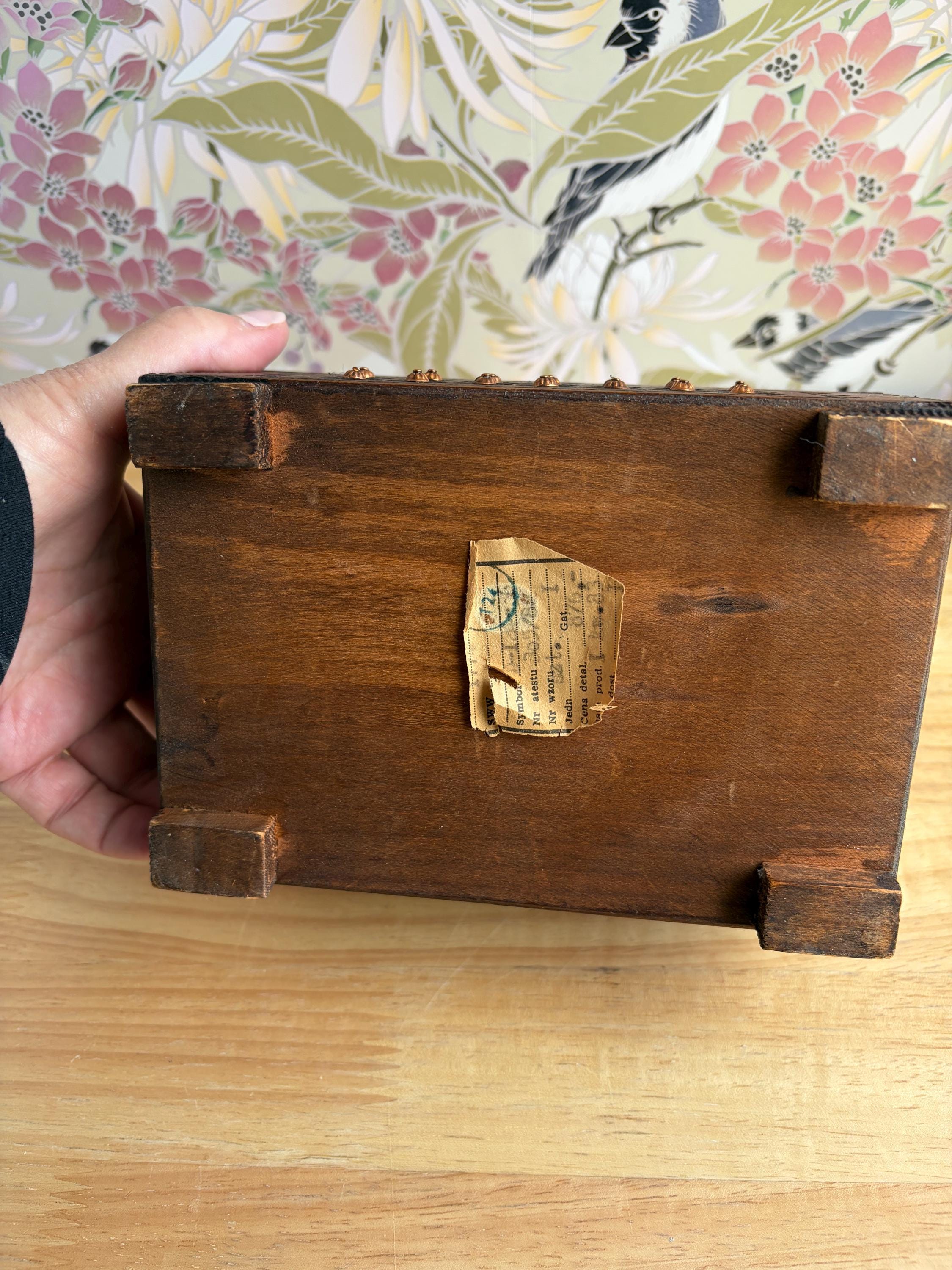Beautiful hand cared Polish trinket or keepsake box. Has metal "buttons" or tacks as part of the design. A lovely box for holding small items or jewelry. Can be used on a bookshelf, bathroom or nightstand as a pretty way to hold items and keep them close at hand.