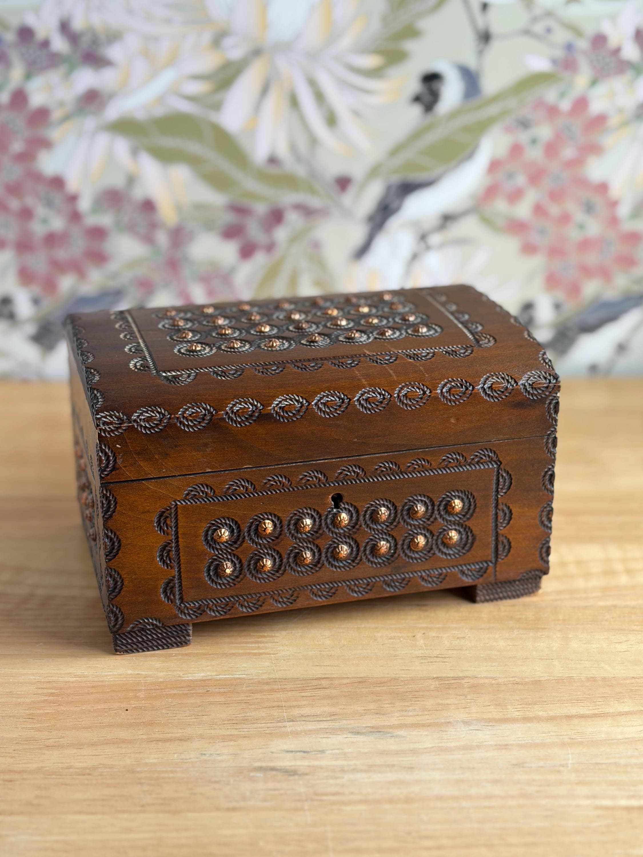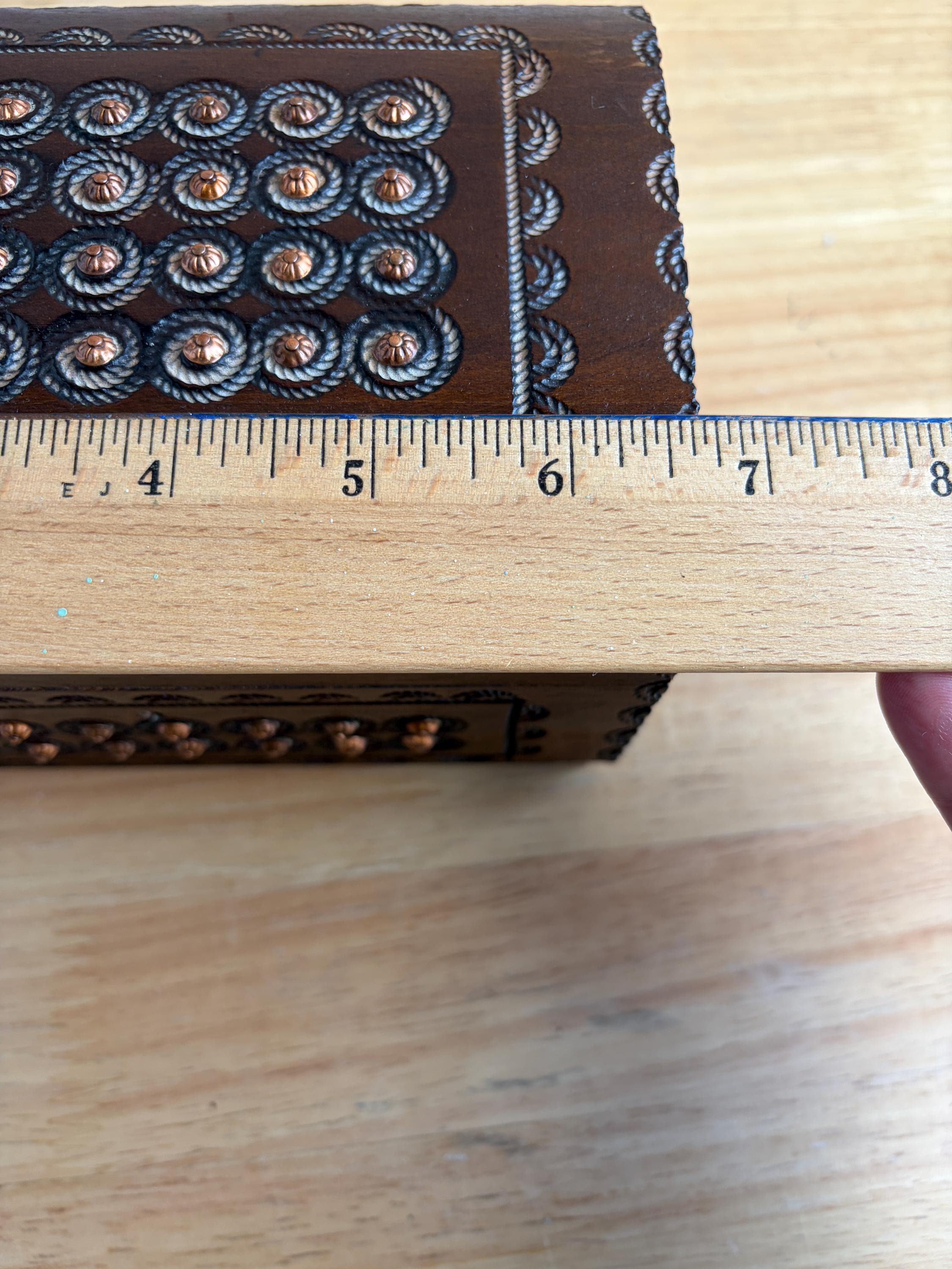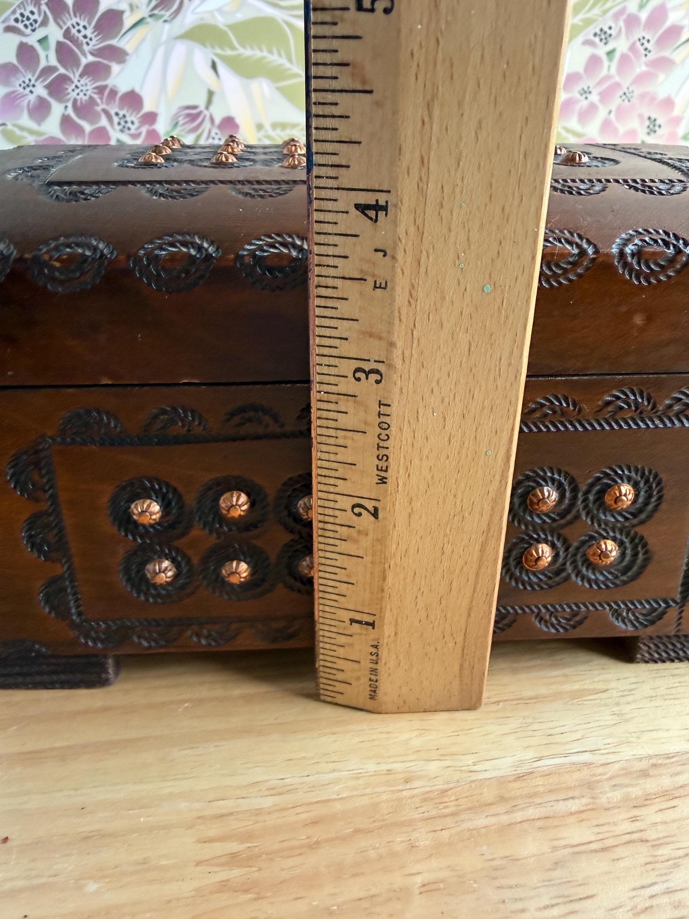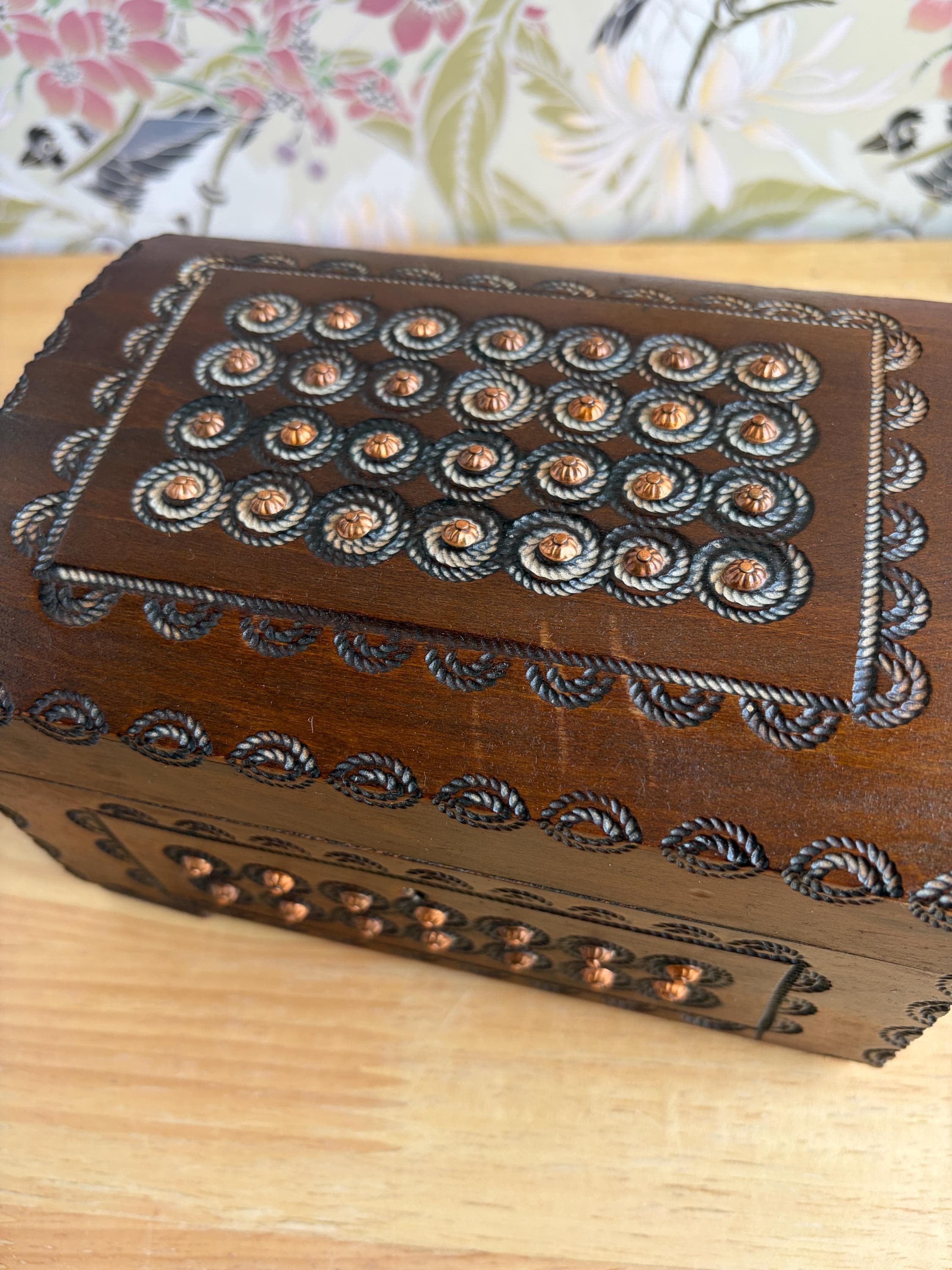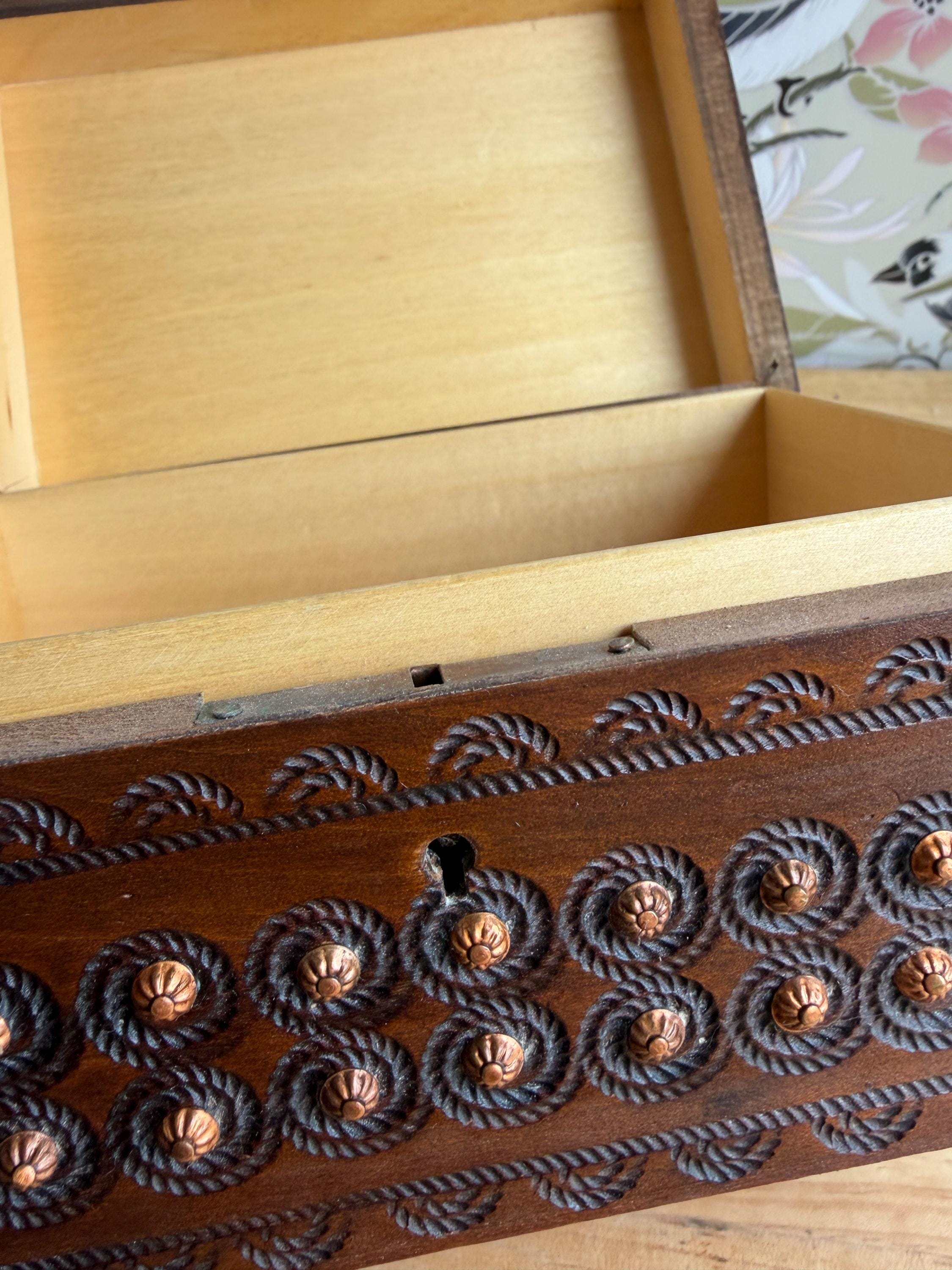 Beautiful hand cared Polish trinket or keepsake box. Has metal "buttons" or tacks as part of the design. A lovely box for holding small items or jewelry. Can be used on a bookshelf, bathroom or nightstand as a pretty way to hold items and keep them close at hand.