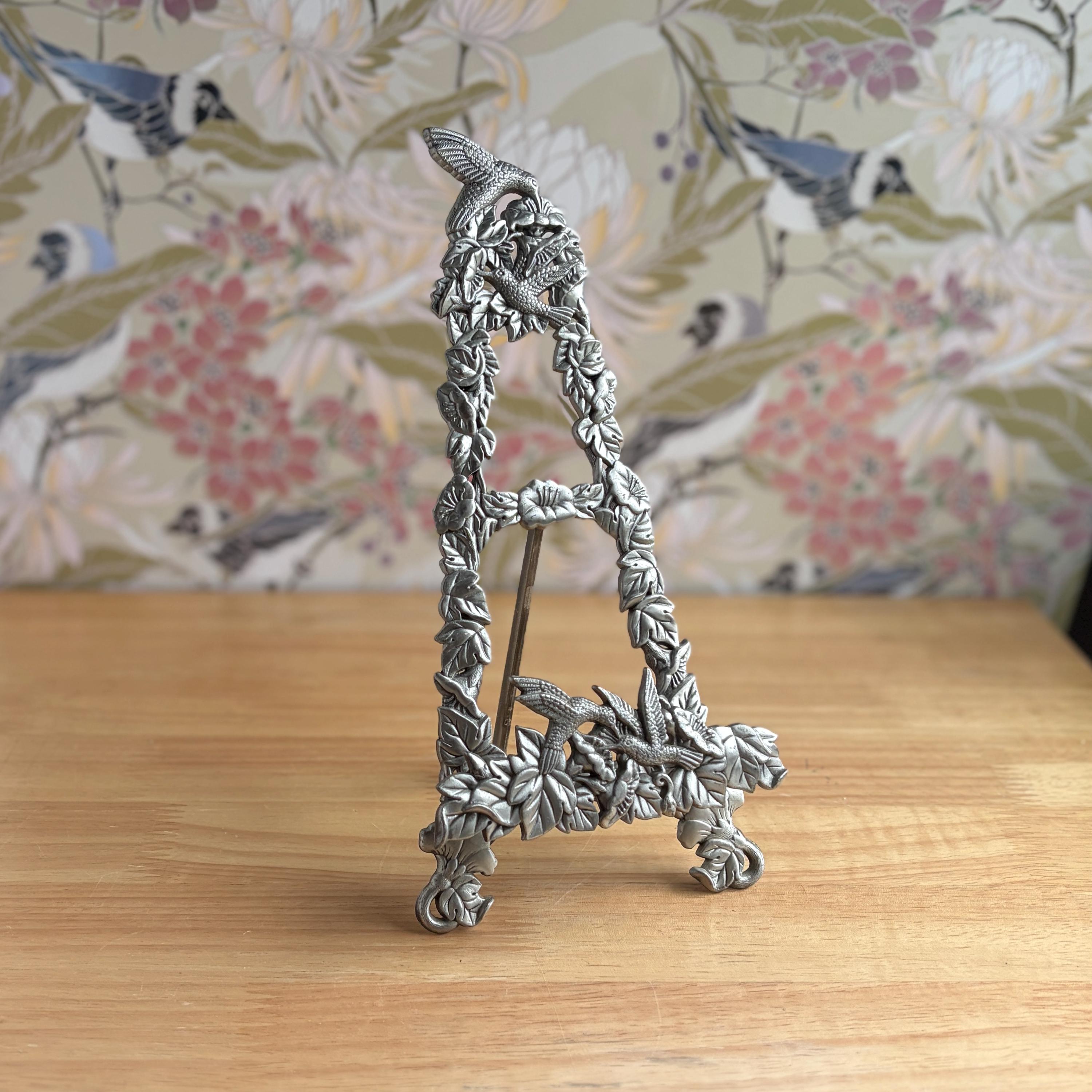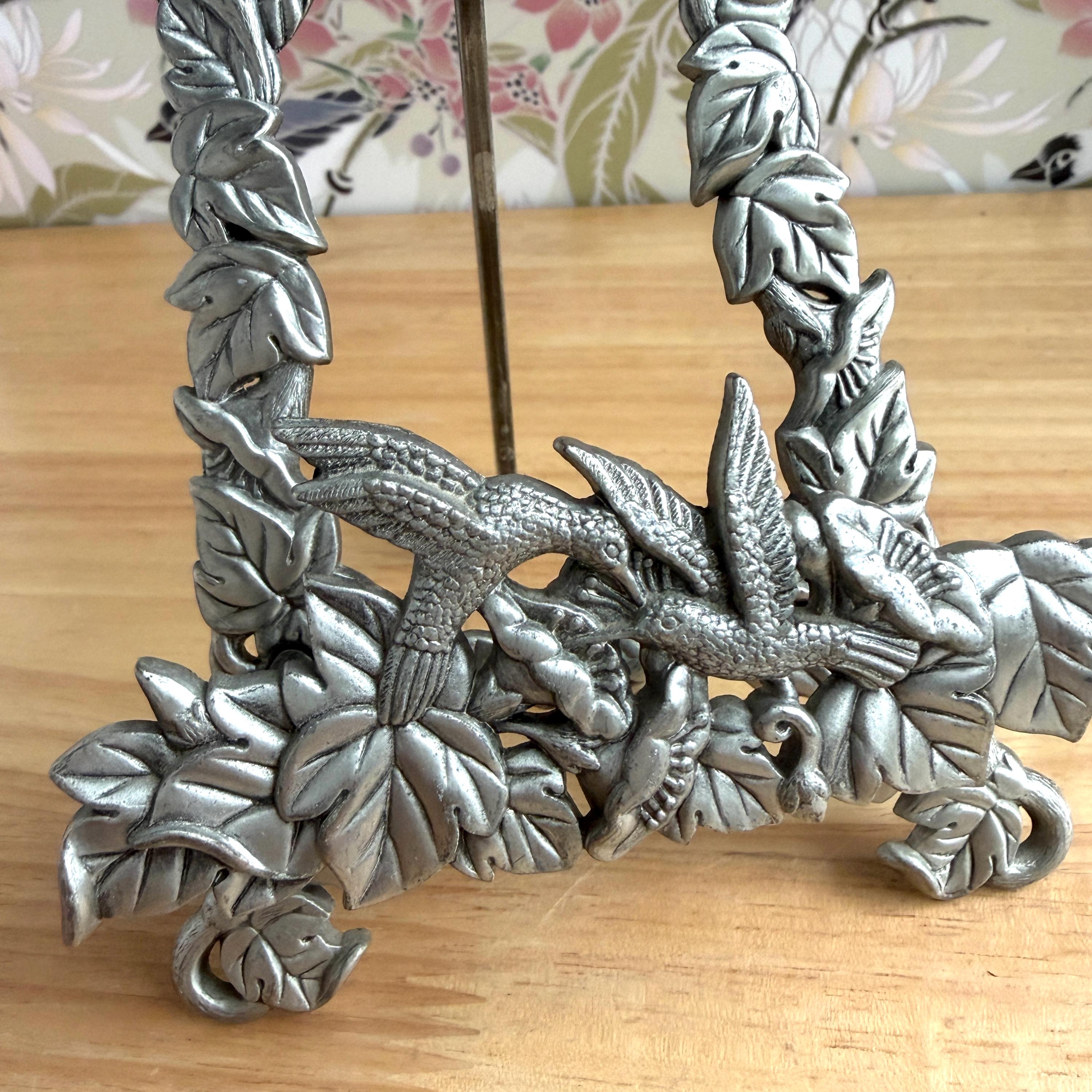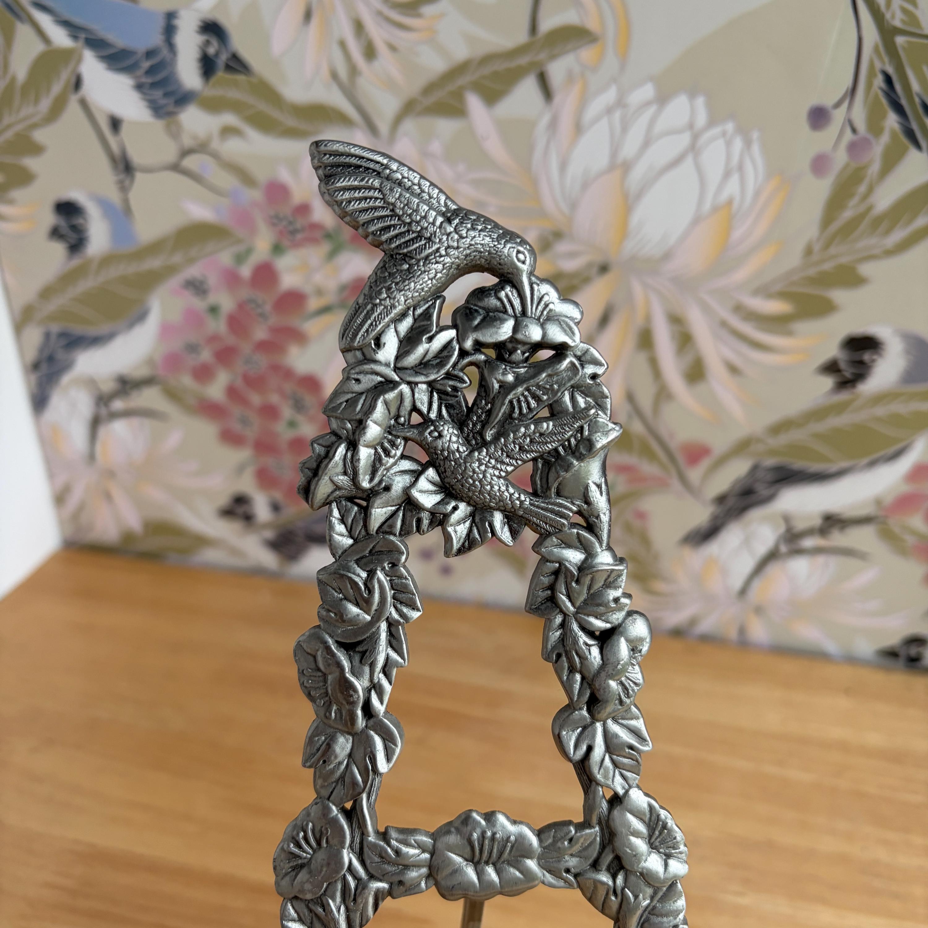 Beautiful vintage pewter art/photo easel with floral and hummingbirds design. Cottage core lovely! Made in Taiwan. Holds frames up to one inch thick.