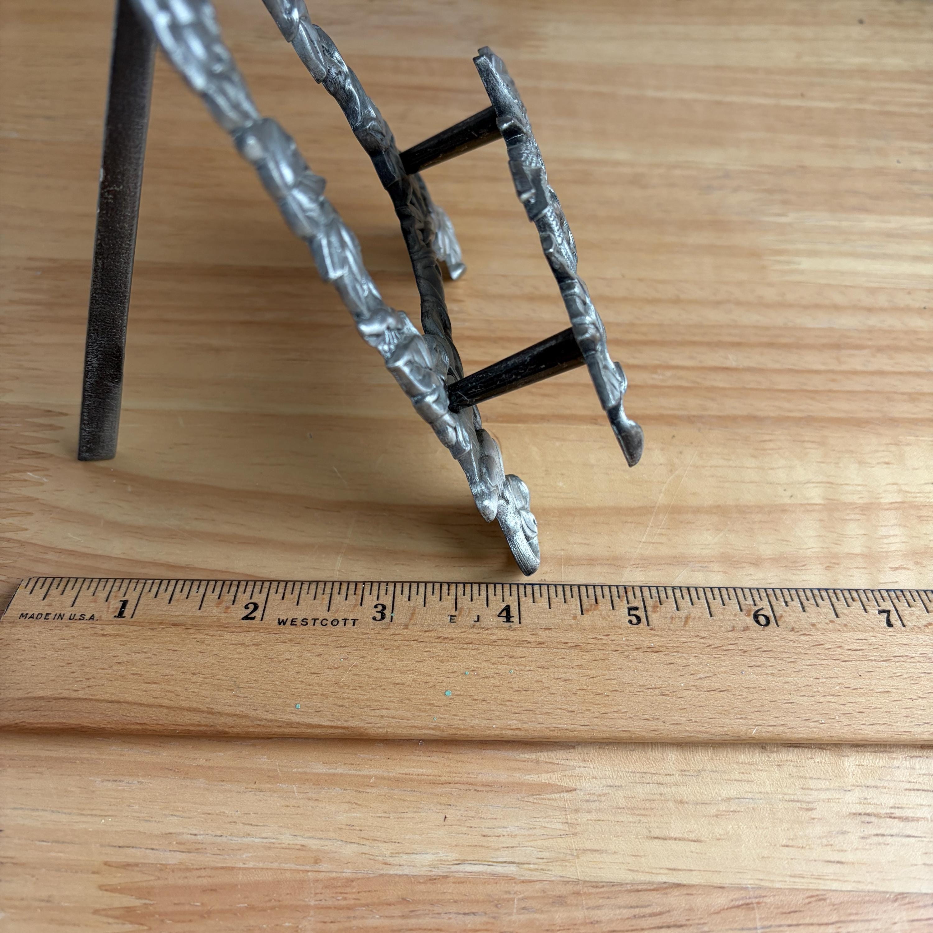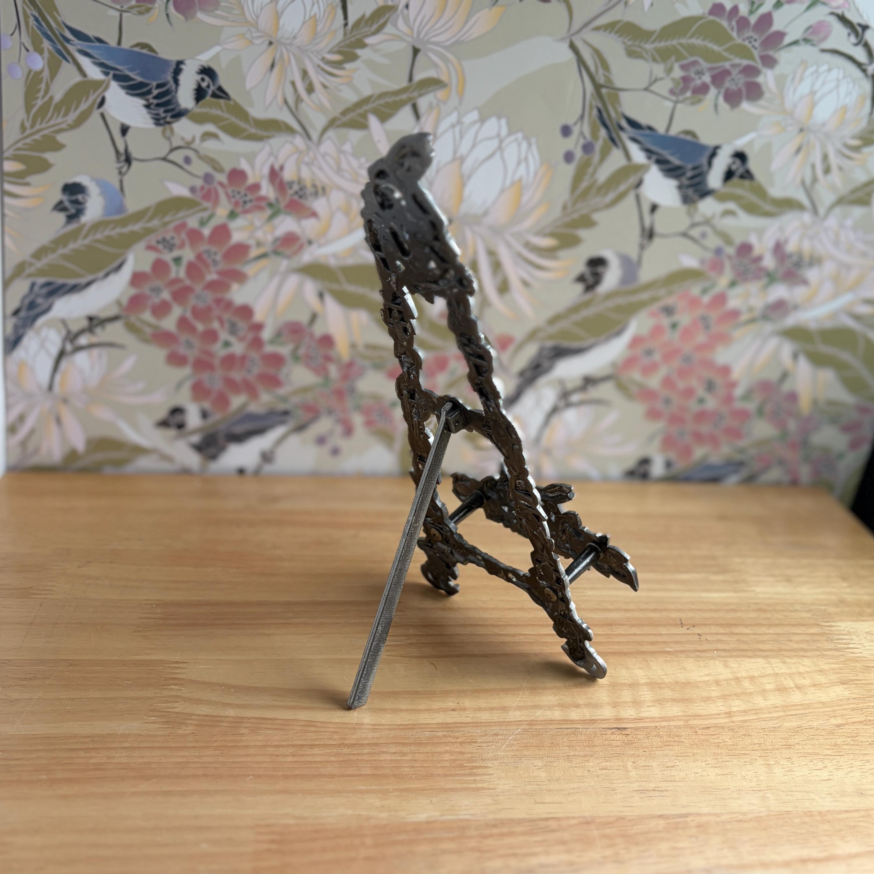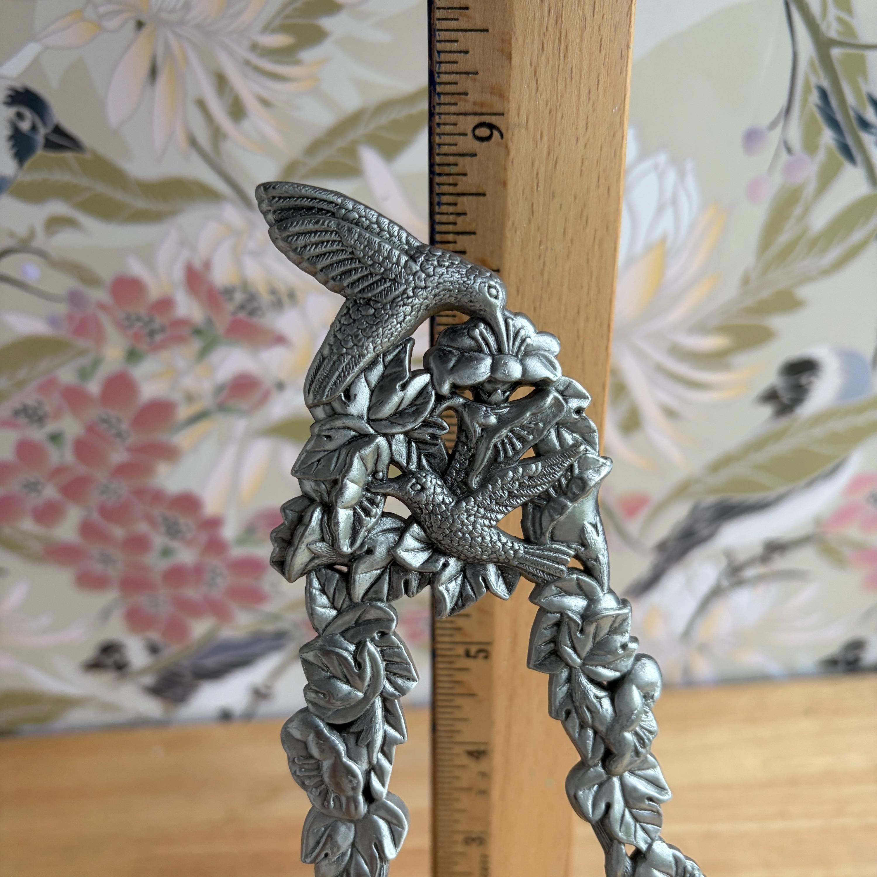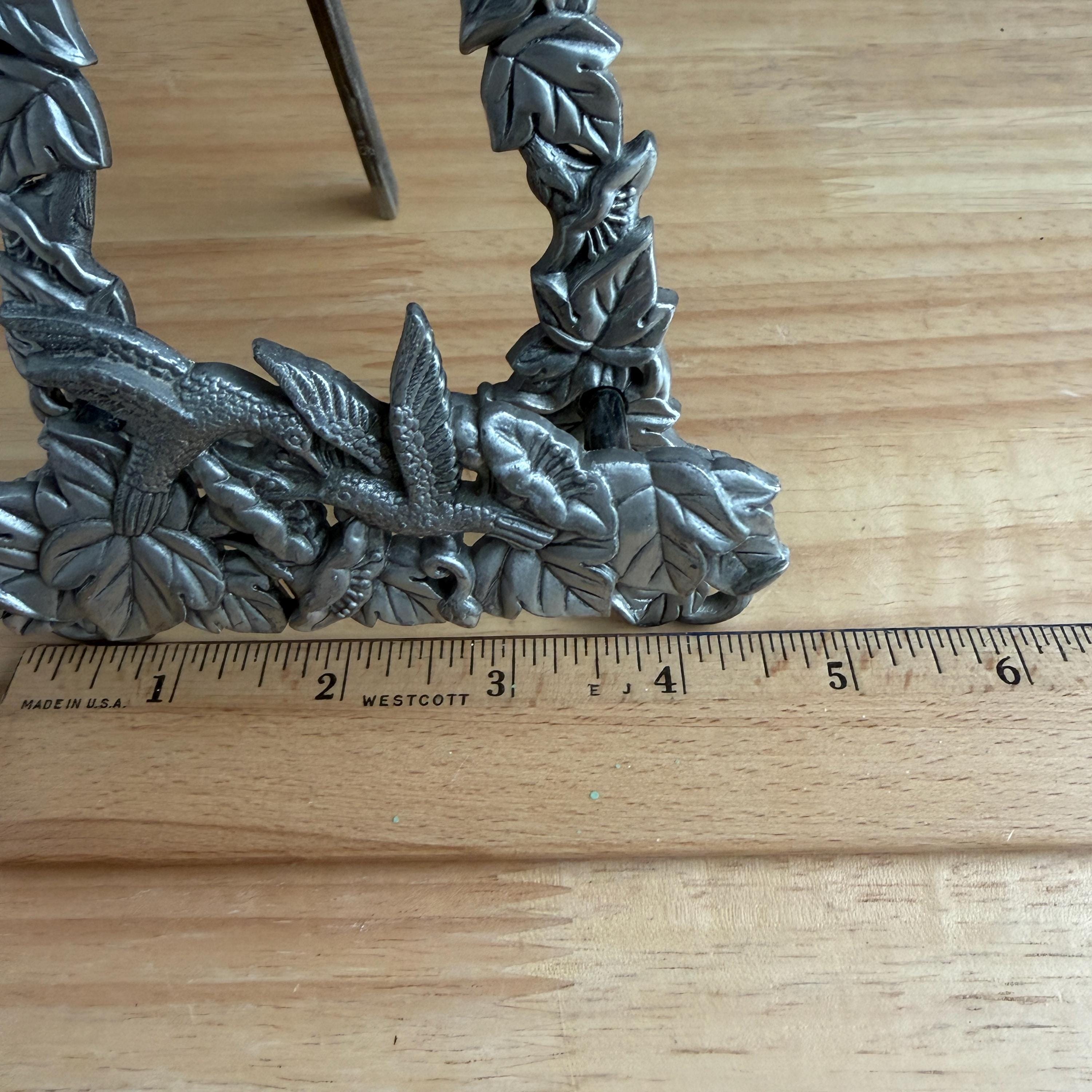 Beautiful vintage pewter art/photo easel with floral and hummingbirds design. Cottage core lovely! Made in Taiwan. Holds frames up to one inch thick.